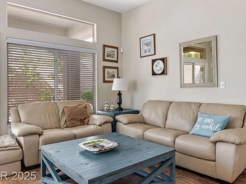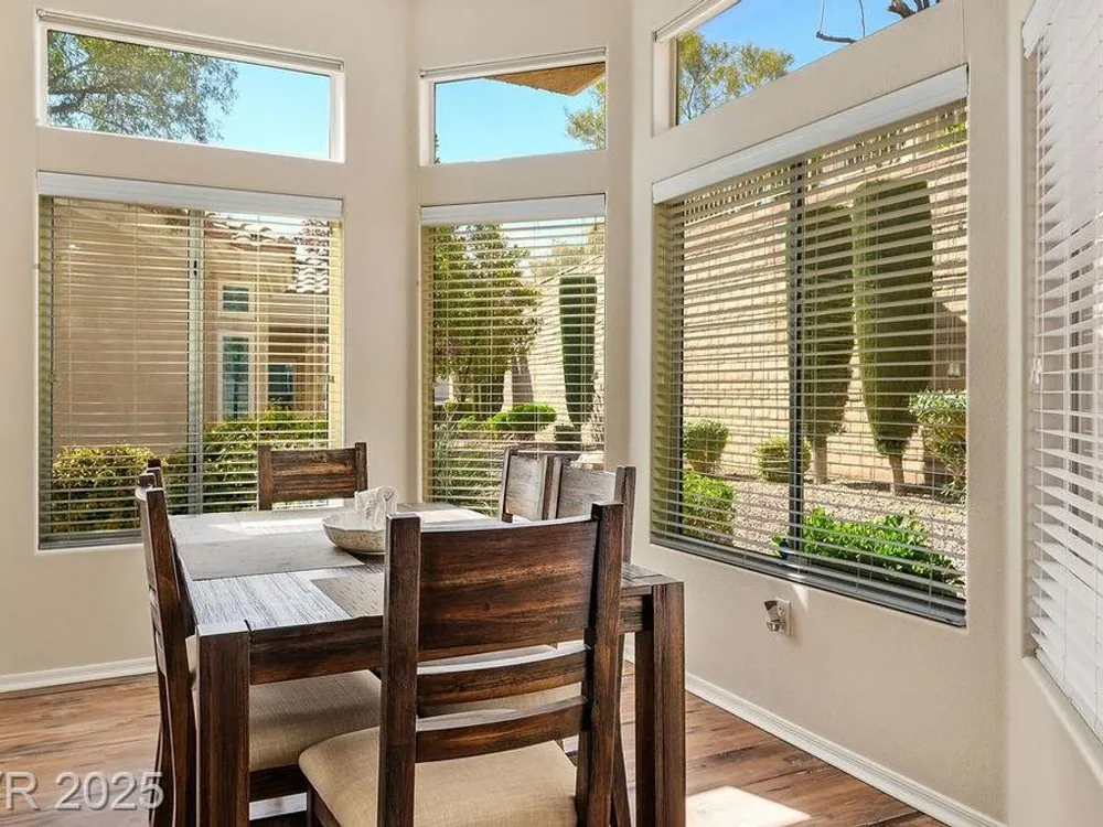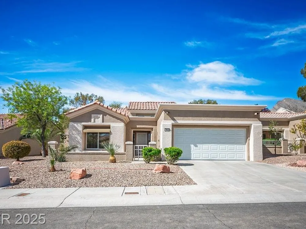 This spacious 1,599 sq. ft. townhome, featuring 2 bedrooms and 2 bathrooms, is located in the desirable Sun City Summerlin community and is ready for its new owner! Enter through a private gated courtyard into the Grafton floor plan, designed for both comfortable living and seamless entertaining. The open layout flows effortlessly between the living, dining, kitchen, and great room, all highlighted by easy-care laminate flooring. The charming kitchen boasts stainless steel appliances, granite countertops, a breakfast bar, and a cozy eat-in nook with a bay window. The primary ensuite includes modern hardware, granite counters, a walk-in shower, a custom closet, and a bay window adorned with stained glass. The spacious second bedroom is conveniently located near the full bath. Relax and unwind on the peaceful back patio