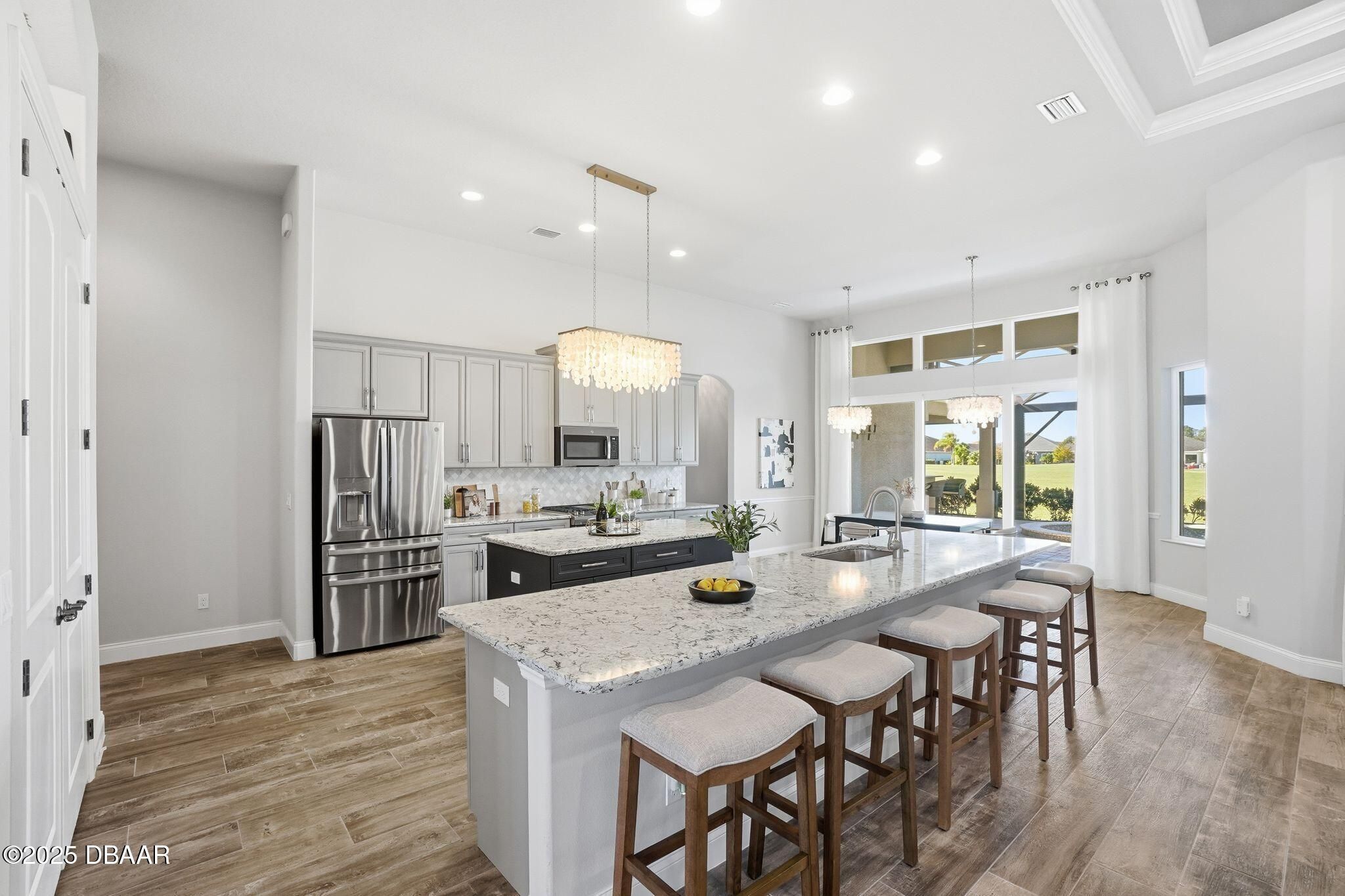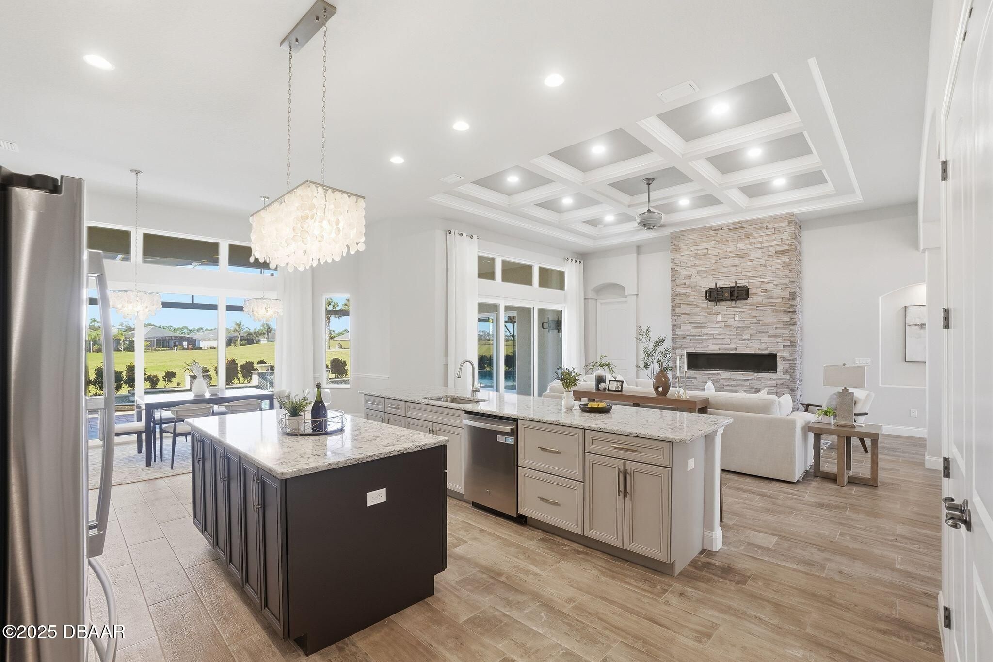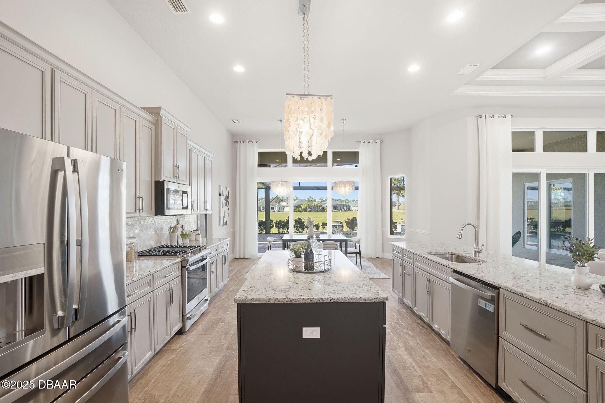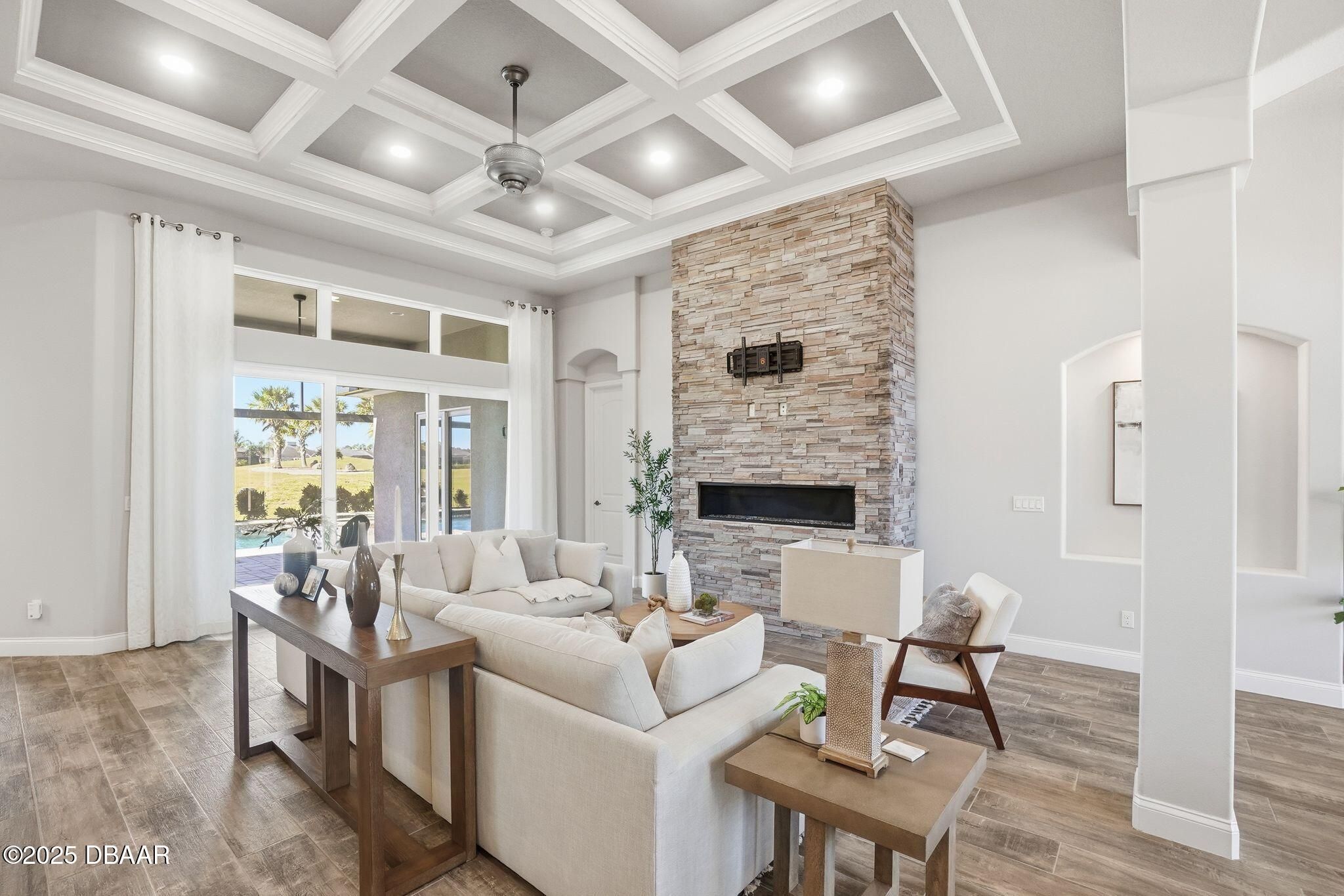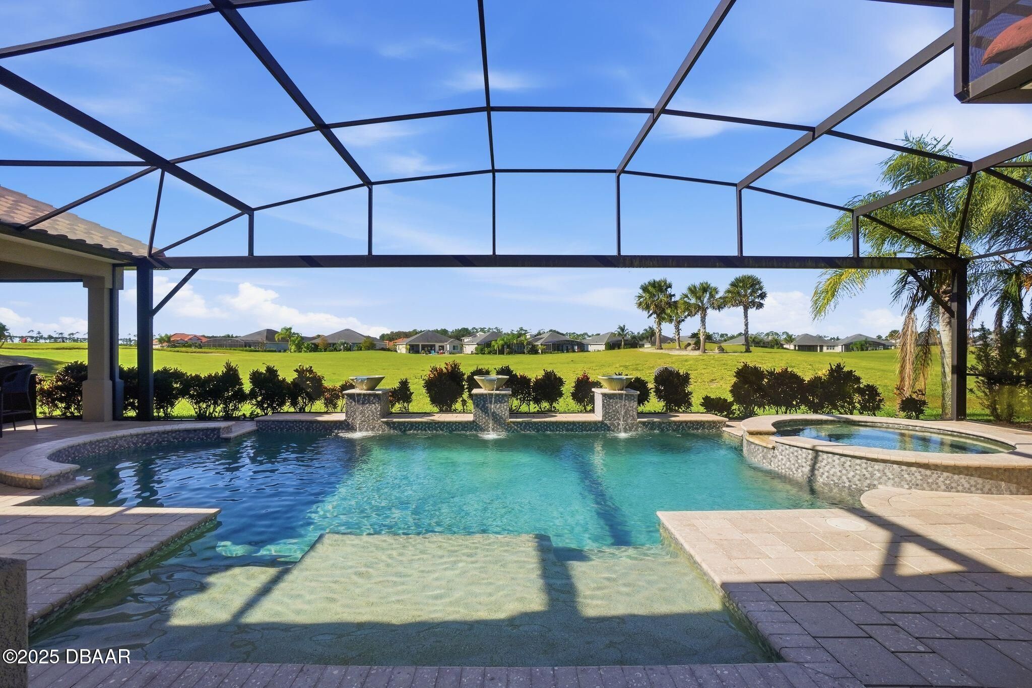 Luxury Living with Fairway Views! (Price Reduction!!) Welcome to this meticulously designed Paytas residence, perfectly positioned in the prestigious Portofino Reserve of Venetian Bay. Professionally staged to perfection—and furnishings can be included, making this home truly turn-key ready for immediate enjoyment. This stunning home offers 4 spacious bedrooms, 3 full baths, a versatile flex room, and a 3-car garage with built-in storage — all spread across 3,148 sq. ft. of thoughtfully planned living space with NO carpet anywhere, just beautiful tile throughout for a fresh, modern feel. Perched along the 10th hole of Venetian Bay's championship golf course, this home offers sweeping fairway views from the living room, kitchen, and dining areas. Step inside to soaring 12-foot coffered ceilings that bathe the space in natural light, creating a bright, open, and airy ambiance. A striking stone-accented gas fireplace anchors the living space, setting the perfect tone for cozy gatherings. At the heart of the home, the chef's kitchen is a true showstopperfeaturing custom wood cabinetry, gleaming quartz countertops, a gas stove, walk-in pantry, and a double-island layout illuminated by designer lighting that adds warmth and elegance. Your primary suite is a private retreat, with dual vanities, a spa-style walk-in shower with dual shower heads, a large walk-in closet, and sliding glass doors that open directly to the pool and outdoor kitchenideal for enjoying peaceful mornings or evening relaxation under the lanai. Step outside to your very own resort-style oasis. The propane-heated saltwater pool and spa, fully equipped outdoor kitchen, and screened lanai offer the perfect setting for year-round entertaining while soaking in tranquil golf-course views. Prefer more privacy? No worriesthere's already a quote available for a custom roll-down privacy screen option. Additional highlights include plantation shutters, a built-in doggie shower, central vacuum system, upgraded landscaping with elegant concrete curbing, and a Generac whole-home generator for peace of mind. And don't forgetliving in Venetian Bay means access to resort-style amenities: a championship golf course, full-service day spa, restaurants, coffee shops, fitness center, and the newly reopened community pool and Tiki bar. All of this just minutes from New Smyrna Beach's vibrant shopping, dining, and arts scene.