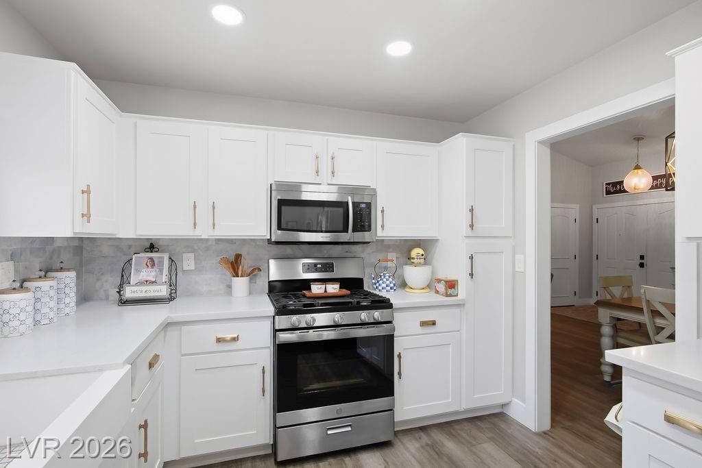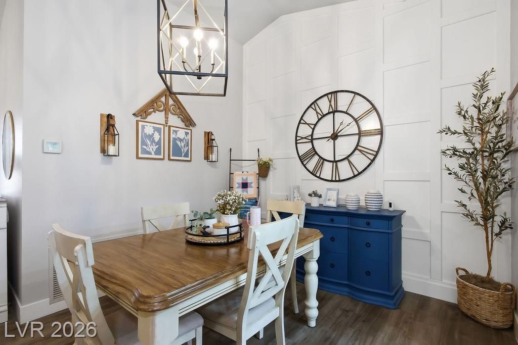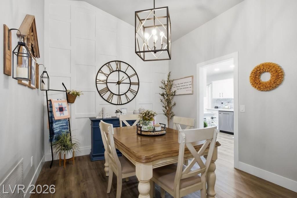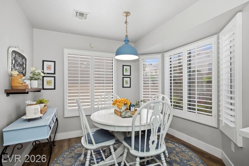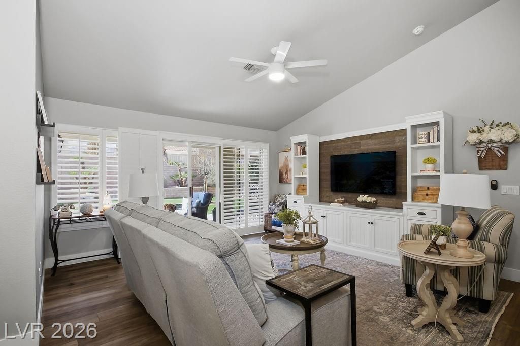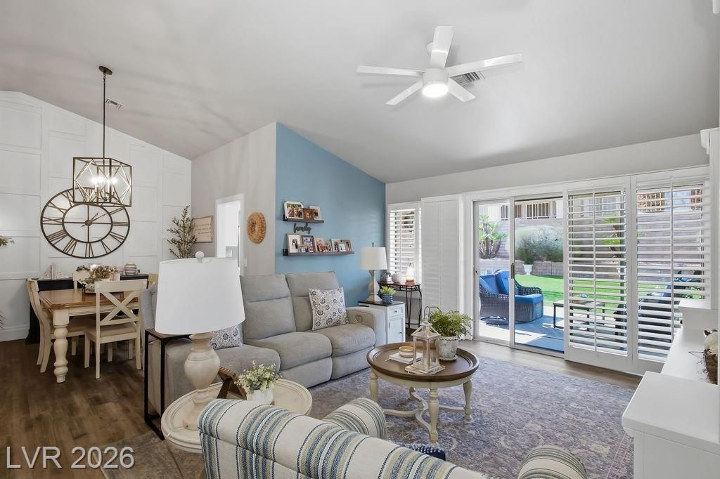 Every corner of this home has been refreshed. Enter through the inviting porch-style entry & notice the attention to detail. The kitchen is a standout, featuring quartz counters, a stylish tiled backsplash, stainless steel appliances, recessed lighting & beautifully refinished cabinets. Luxury plank flooring flows seamlessly through the home, complemented by upgraded baseboards, updated doors & hardware & plantation shutters that add a touch of timeless elegance. Thoughtful accent walls bring personality to the primary bedroom, dining room, & laundry room, while both bathrooms boast quartz counters & updated lighting. The outside offers low-maintenance lifestyle. The front yard features carefully placed stone, synthetic grass & a low-rise entry, while the fully fenced backyard offers a paved pathway & more synthetic turf — because weekends should be spent enjoying life. This neighborhood truly shines with Mountain Shadows Community Center & Highland Falls Golf Club just minutes away.