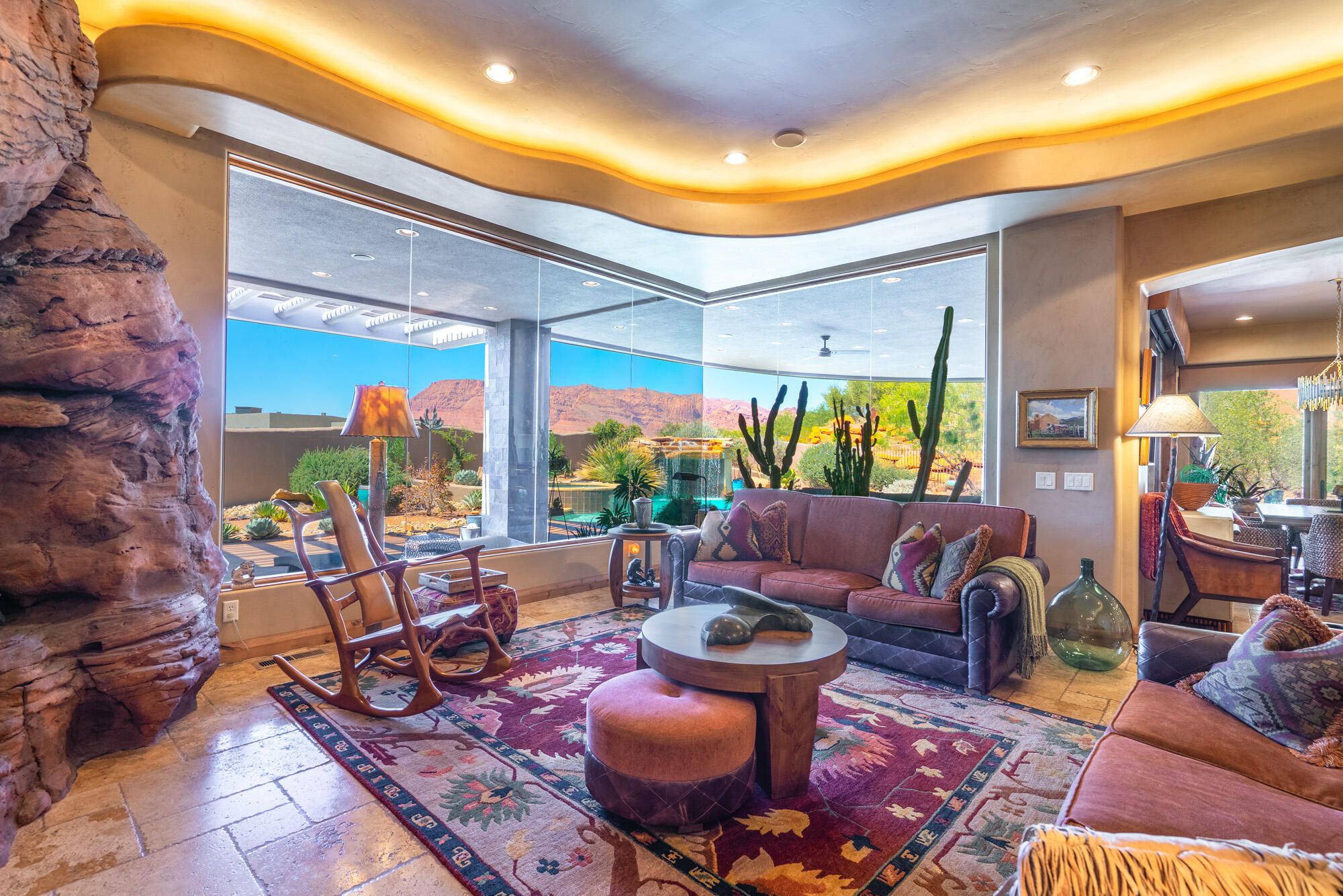 Experience luxury living in this beautiful single-level custom home in Kachina Cliffs at Entrada. The home is situated on a large estate lot with stunning views to enjoy any time of the day or night. Packed with amazing features and upgrades like multiple fireplaces with faux stone, a chef's kitchen, artistic glass windows - the list goes on and on! Unique to this home is a very large covered patio, which provides a perfect spot to watch the changing shadows on Red Mountain, Snow Canyon, Johnson Arch, and the Scout Caves. Spacious master suite with relaxing bath. There's also a cozy casita and a stunning pool with a grotto waterfall, spa, fire pit, BBQ, and a built in dinning area on the back patio - all accessible through large sliding glass doors. Truly a masterpiece you don't want to miss! Office comes with 2 full size wine coolers that hold 300 bottles in each - WOW impressive! The garage is spacious enough for three cars or golf cart, and other toys or create an art studio! Owner's landscaping was showcased in the 2024 Parade of Gardens Southern Utah!! Residents can indulge in a wide range of clubs and activities including pickleball, tennis, swimming, yoga, and Pilates. Whether you're looking for outdoor adventures like hiking or exploring the fascinating beauty of the area, or simply want to enjoy a delicious meal at Sol Mesa or The Grille, Entrada has something for everyone. It's a place where you can easily make new friends and create lasting memories. It's important to note that all property owners in Entrada are required to become associate members of the country club, which includes a monthly fee of $210 and an annual food expense of $800 at the restaurant. Golf membership, however, is a separate cost.