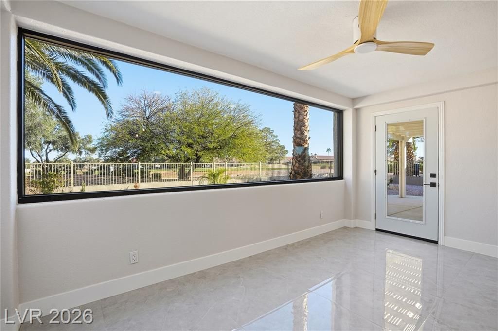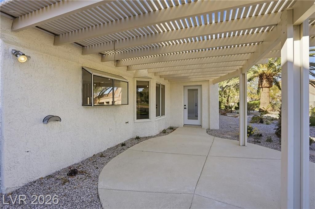 Welcome to this beautifully renovated home in the Sun City Summerlin. This single story, 2 bed 2 bath residence offers outstanding curb appeal with an oversized 2 car garage as well as elegant double door entry. The thoughtfully upgraded kitchen features tile flooring, white shaker cabinets, granite & quartz countertops, sleek black hardware, & upgraded appliances. A bright dining area showcases a wall spanning window that fills the space with natural light and provides serene backyard views. The spacious living room is warm and inviting, highlighted by a cozy fireplace, perfect for relaxing or entertaining. Both bathrooms have been tastefully upgraded, with the primary suite offering a spa like en suite complete with dual sinks and a large walk in shower. Step outside to a generous backyard designed for enjoyment, featuring a pergola ideal for outdoor dining or lounging. This move in ready home combines modern upgrades with the lifestyle and amenities Sun City Summerlin is known for.