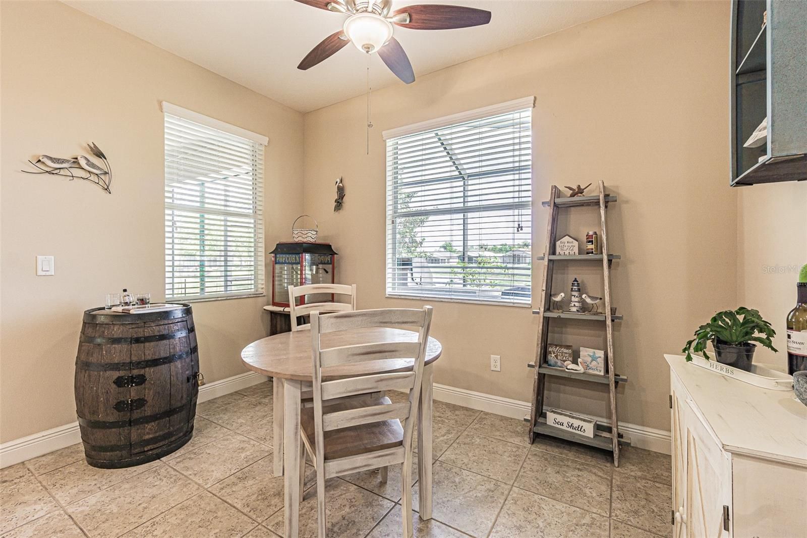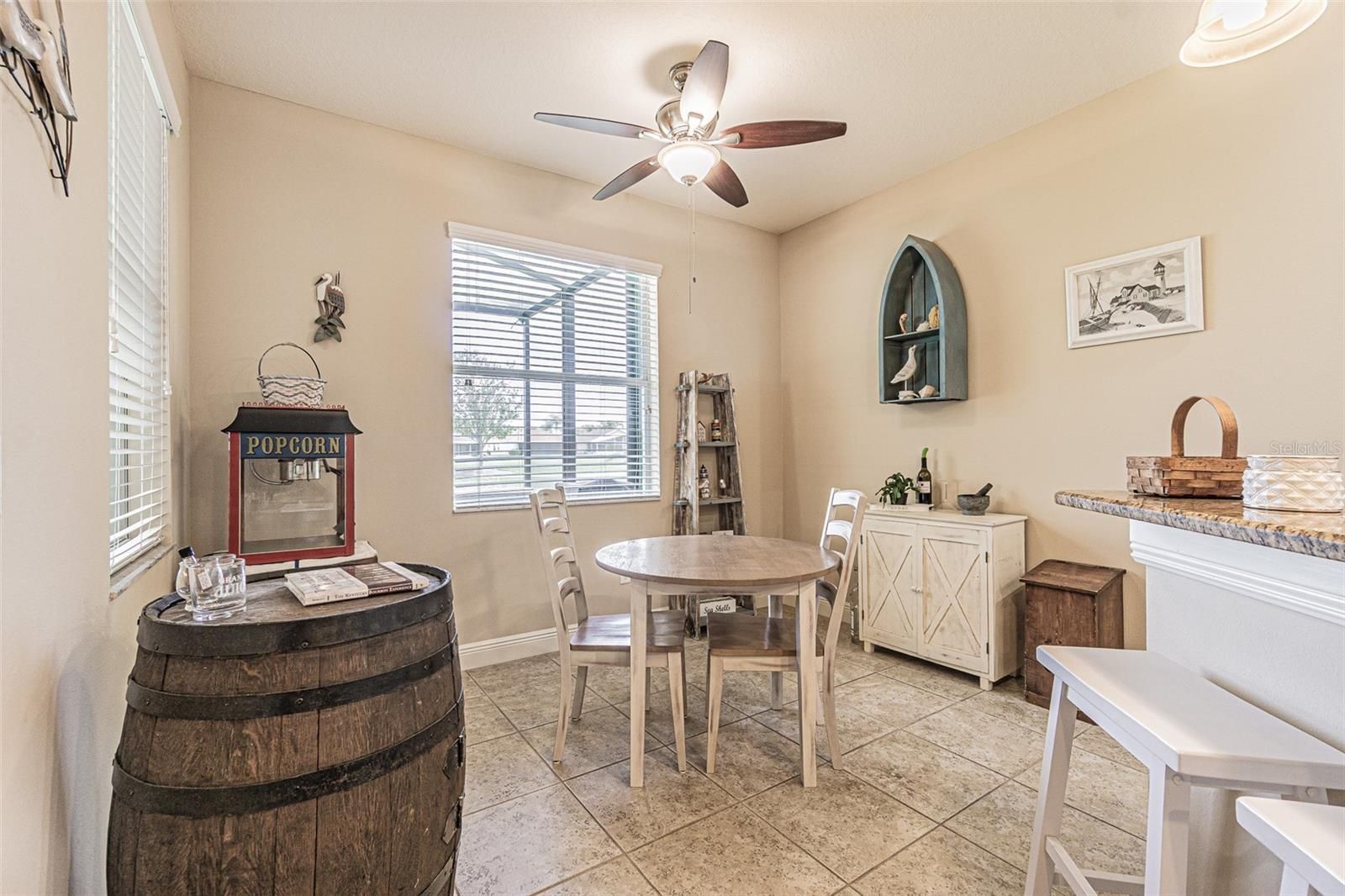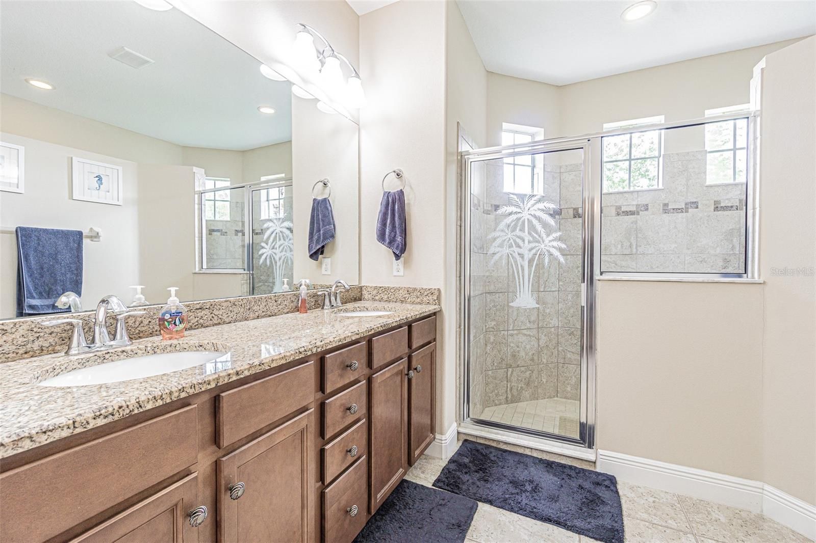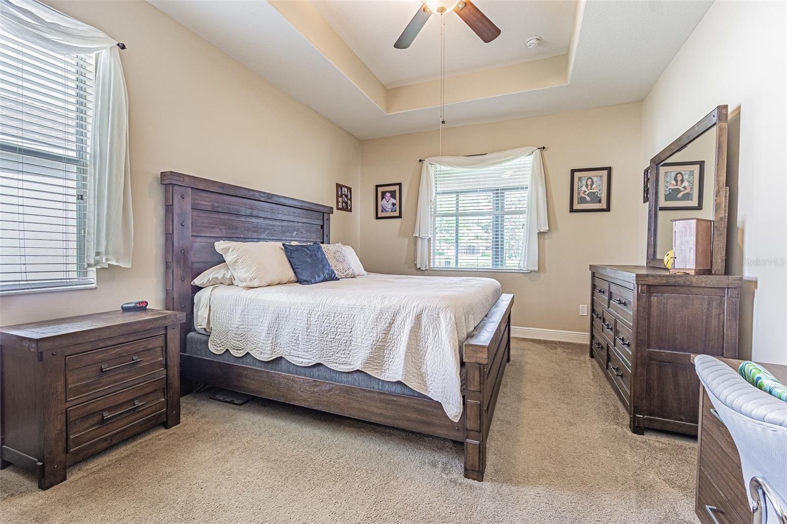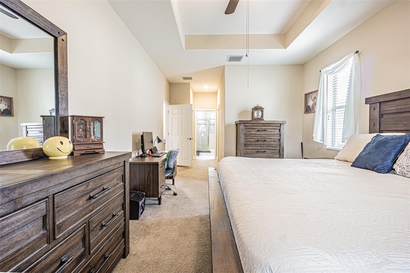 - Ceiling Fan(s), High Ceilings, Living/Dining Room, Main Level Primary, Solid-Wood Cabinets, Stone Counters, Thermostat, Tray Ceiling(s), Walk-In Closet(s), Window Treatments
