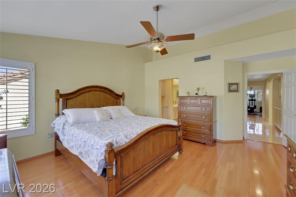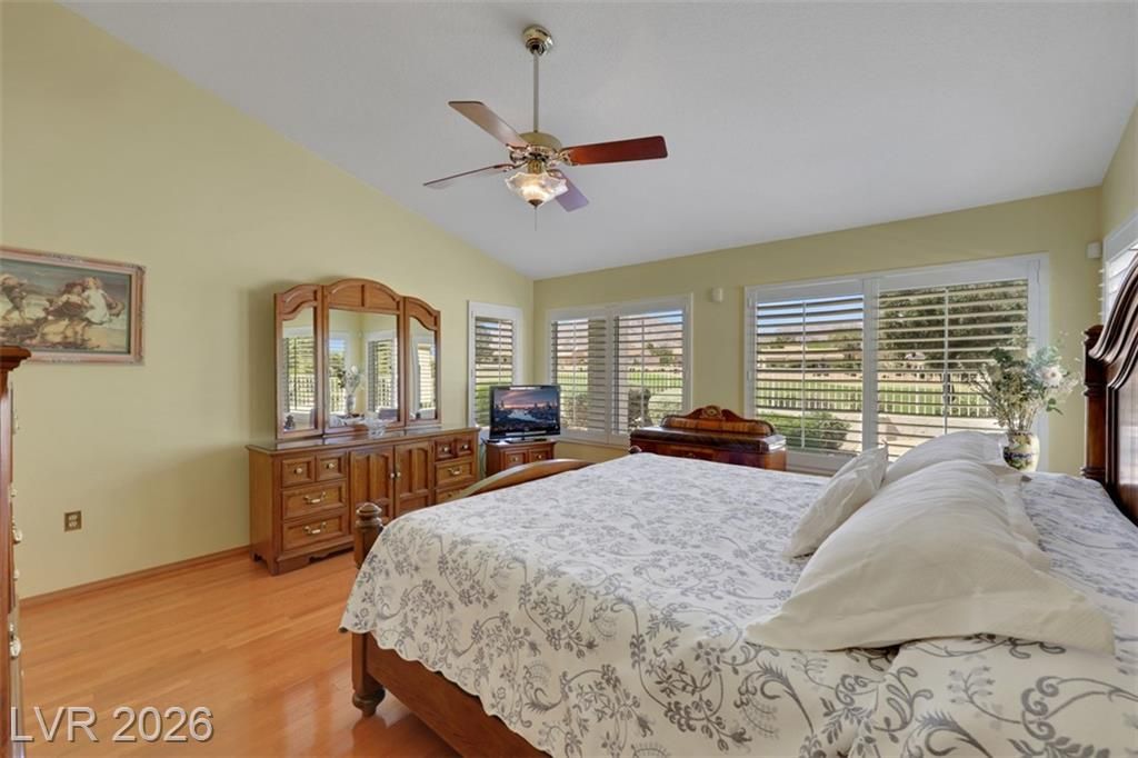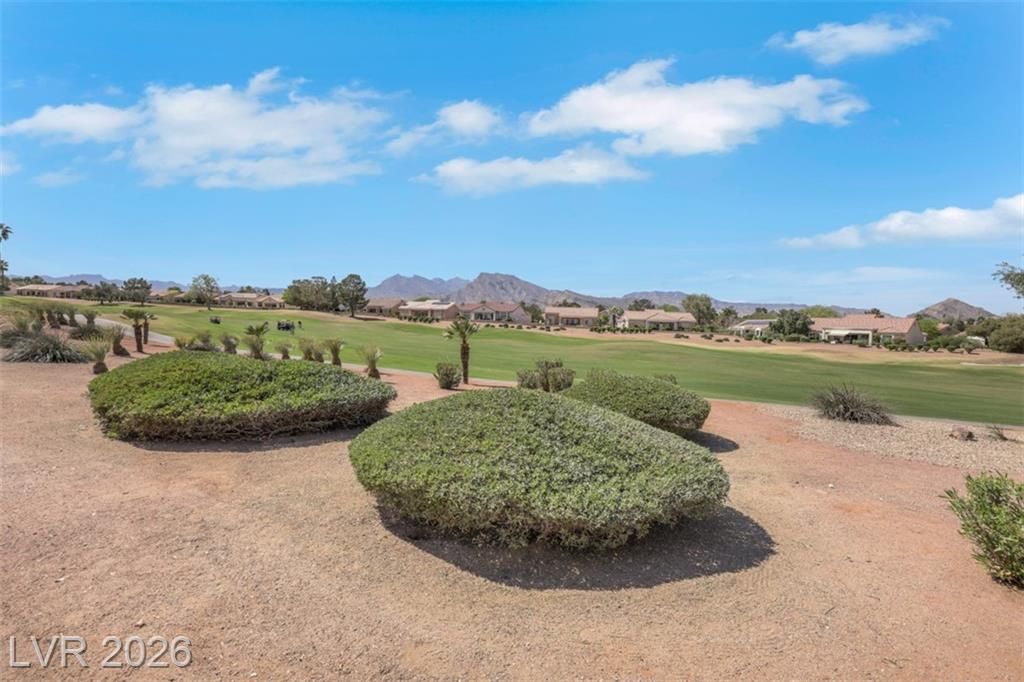 Golf course frontage dream home location in Sun City Summerlin on 1st hole of Palm Valley course "money shot" aprox 130 yards from green 5 Par. Panoramic Views of course & mountains from backyard, patio, spa + every room on back side of home, even primary bedroom! Home is meticulous inside & out, designed for entertaining. Beautifuly maintained grounds, backyard fenced, tile walkways. Gated Courtyard Entry, Custom Double Doors, Spacious Living room+dining area, Lots of natural light, High ceilings, Archways, Shutters throughout, tile floors main areas, hardwood floors in bedrooms. Primary bedroom separate, Long hallway to other Bedrooms, Both Primary & 2nd bath showers remodeled. 3rd bedrm w/builtin desk unit used as office. Kitchen w/breakfast nook+bar counter, stainless steel appliances, double electric convection oven, lots of cabinets, Family room w/door to patio. Laundry room, Garage w/Golf Cart parking space, epoxy floors, cabinets. Sun City Summerlin offers world class amenities