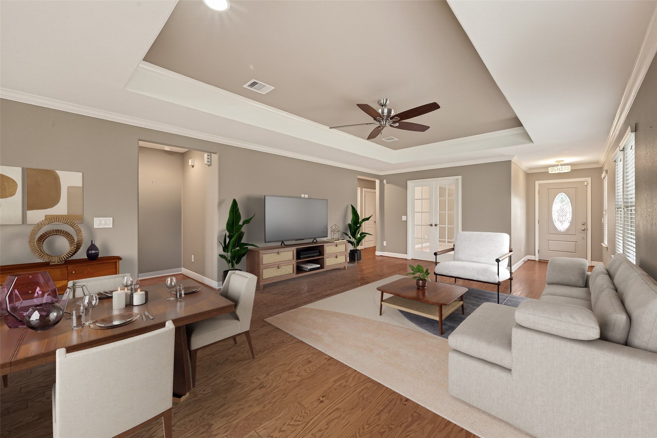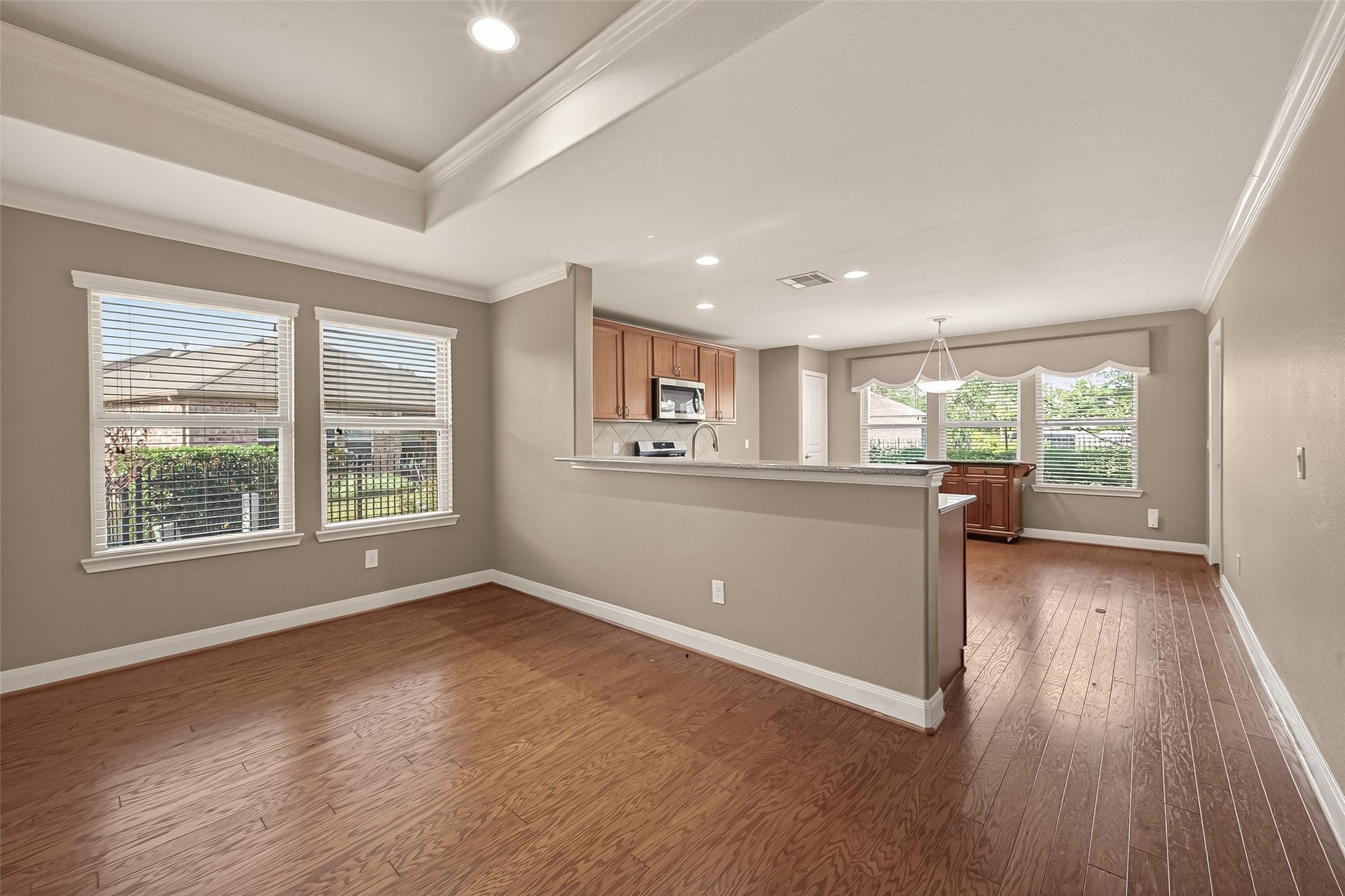 - Crown Molding, Double Vanity, High Ceilings, Kitchen/Family Room Combo, Tub Shower