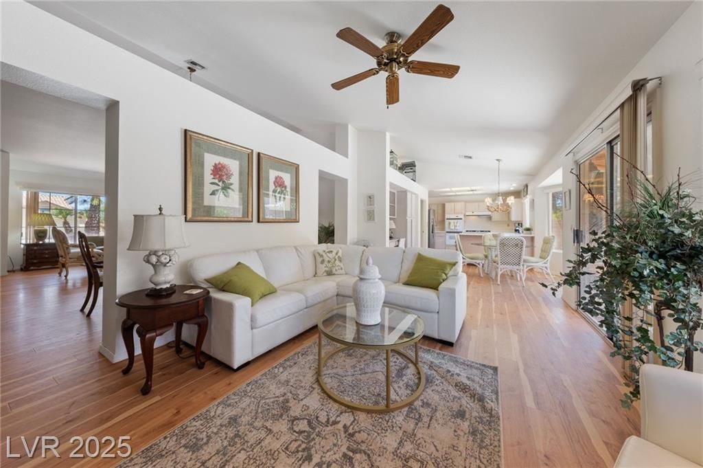 FULLY FENCED BACK YARD ~ 1,804 Sq. Ft. ~ Sought After Silverton Model ~ 2 Bedroom, 2 Bath Home with Formal Living Room and Dining Room Area ~ Pergo Laminate Wood Flooring ~ Breakfast Nook and Large Laundry Room. Covered Patio has Extended Concrete. Guest Bath with Tub Shower Glass Enclosure ~ New Air Conditioning 2023 ~ Enjoy All the Sun City Summerlin 55+ Community Amenities~ 4 Community Centers, 3 Golf Courses, 5 Swimming Pools (3 Outdoor and 2 Indoor Pools), 3 Exercise Facilities, Tennis Courts, Pickle Ball Courts, Senior Softball League, 312 Seat Starbright Theatre with Live Entertainment, Social Card Clubs, and More! Insist On Enjoying Life ~ Live Like You Are on Vacation!