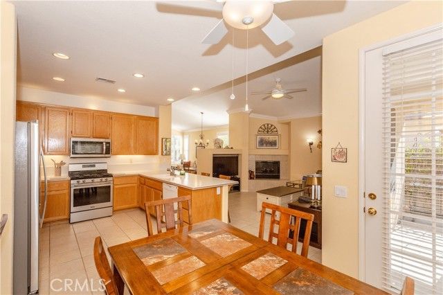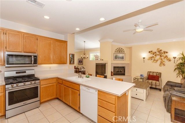 **Gorgeous Golf Course View** Home in The Oasis, a premier 55+ gate-guarded community, perfectly positioned on the 3rd green of the “Lakes Course.” This rarely available and highly desired floorplan offers 2 bedrooms plus a versatile den/3rd bedroom option, featuring bright, open living spaces, fresh interior paint, plantation shutters, crown moulding, and a beautifully maintained interior plus solar keeping your utility bill to virtually zero! The living and dining area flows into a spacious kitchen with Corian countertops, a breakfast bar, generous cabinet storage, and an eat-in dining nook that opens seamlessly to the family room with a cozy fireplace, ideal for everyday living and entertaining. Both bedrooms include walk-in closets, and the updated primary bathroom showcases a stunning walk-in shower. Step outside to a beautifully landscaped backyard with a covered patio and sweeping golf course views, a peaceful, picturesque setting on a premium lot. Residents enjoy outstanding resort-style amenities, including a 22,000 sq. ft. clubhouse with auditorium and stages, dance floors, commercial kitchen, fitness center, library, computer center, billiards, and multiple activity rooms. Outdoor features include a tropical pool and spa, BBQ areas with mountain views, two lighted tennis courts, four pickleball courts, and an incredible variety of social and recreational clubs. HOA includes front yard landscaping, water, and trash service. Immaculate, thoughtfully appointed, and set in an exceptional location, this home offers the very best of golf-course resort living.