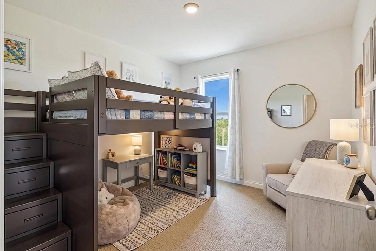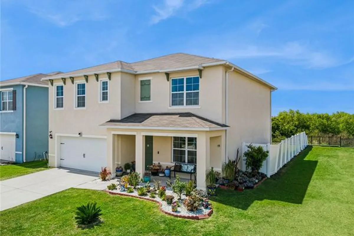 One or more photo(s) has been virtually staged. Spacious and thoughtfully designed Hayden floor plan by D.R. Horton offering over 2,600 sq ft, 5 bedrooms, 3 full bathrooms, and a 2-car garage in a growing Lakeland location. This two-story home features all concrete block construction on both floors and a versatile open-concept layout ideal for modern living. The first floor includes a flex space perfect for a home office or formal dining, along with a guest bedroom and full bath, ideal for visitors or multi-generational living. The kitchen is the heart of the home, showcasing a large center island, walk-in pantry, stainless steel appliances, and abundant cabinetry, all overlooking the spacious living and dining areas with access to the backyard. One of the standout features of this property is its added privacy—there is no immediate neighbor on one side, creating a more open feel and additional separation rarely found in similar homes. Enjoy peaceful outdoor living with a backyard water view, offering a serene setting with no rear neighbors directly behind—perfect for relaxing evenings or entertaining. Upstairs, the expansive primary suite offers a private retreat with en-suite bath and walk-in closet. A large loft provides additional living space, complemented by three secondary bedrooms, a full bathroom, and a convenient upstairs laundry room. Additional features include smart home technology, generous storage throughout, and a functional layout designed for flexibility and comfort. Conveniently located near major roadways, shopping, dining, and everyday amenities, this home offers both space and a unique combination of privacy and natural views.