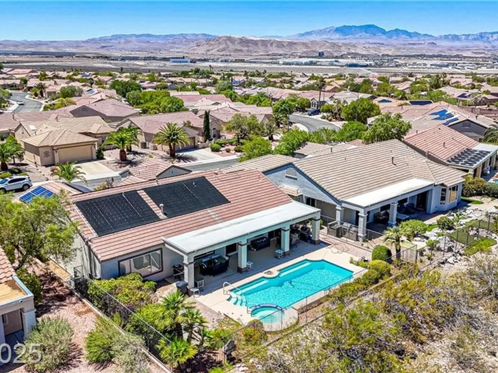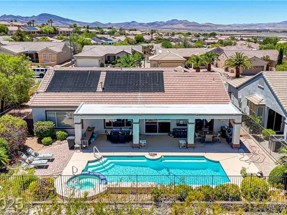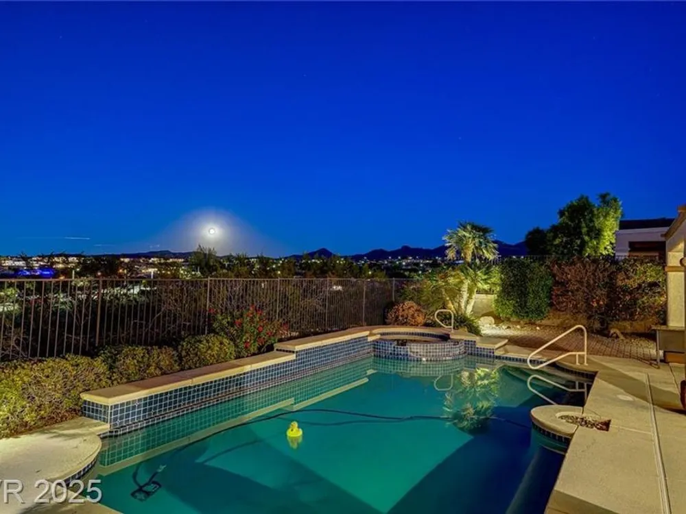 Stunning single-story retreat with a casita nestled in one of Henderson’s most desirable 55+ golf course communities. This 3-bedroom + den, 3 baths with full panoramic unobstructed Las Vegas Strip, mountain, & sunset views. Situated on an elevated lot with no neighbors behind, the home features an oversized private pool and spa, & a covered patio spanning the entire length of the house — perfect for entertaining or morning coffee with a view. Gated courtyard entrance then you walk into the wide-open living room with a fireplace & wet bar overlooking the backyard pool and views. Offers a split floorplan and a den with peaceful views & direct access to the backyard. Kitchen has skylights & all appliances included & a 2-car tandem garage with built-in storage cabinets. Freshly painted on exterior and year round blooms in the yard. Enjoy access to 3 world-class recreation centers, including indoor & outdoor pools, pickleball courts, golf course, classes, & a vibrant social calendar.