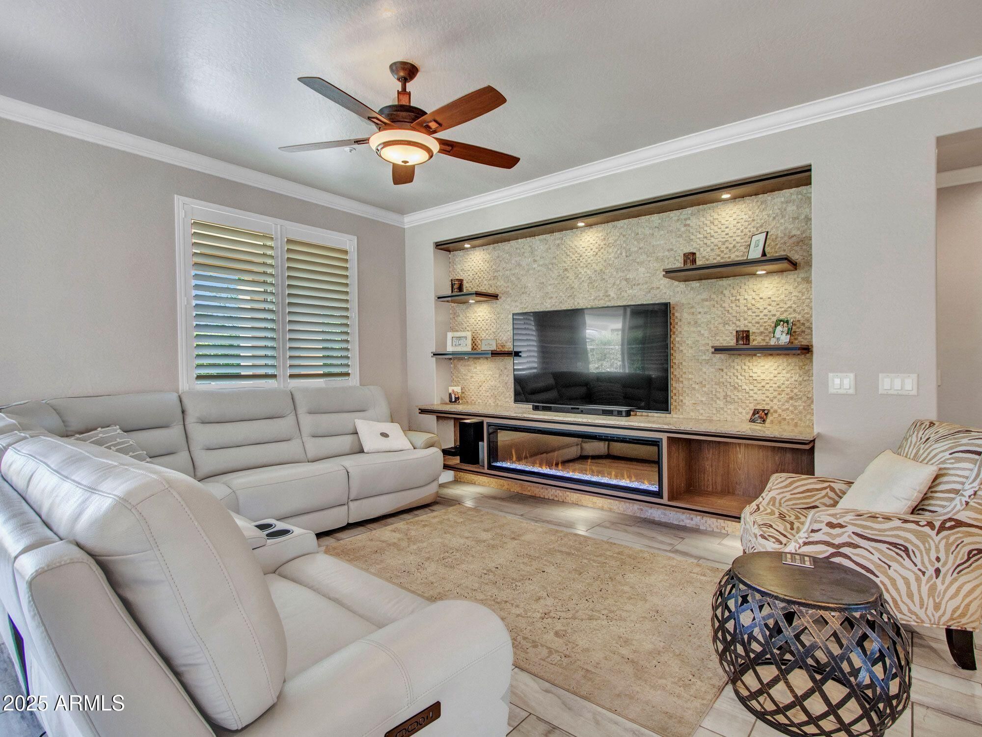 Beautifully Upgraded Home with Wood plank tile throughout except bedrooms*Kitchen has White Cabinets*Granite Counters*Custom Tile Backsplash*Crown Molding*White Plantation Shutters*Pantry*Stainless Appliances & Custom Light Fixtures! Living room has Custom Stone Accent Wall w/Uplighting*Granite Counter & Floating Shelves! * SPLIT PLAN * Large Primary Bedroom w/White Plantation Shutters & Custom Ceiling Fan * Ensuite w/white Cabinets*White Plantation Shutters*Custom Fixtures & Walk-in Shower! Guest Bath w/Custom Tile Shower & White Cabinet w/Granite Sink*Bed 2 w/White Plantation Shutters Upgraded Ceiling Fan/Light! Bed 3 w/White Plantation Shutters*Built-In Custom White Desk & Cabinets w/Lighting & niche! Large Beautiful Low Maintenance Yard w/Pavers & Synthetic Grass! Love it!