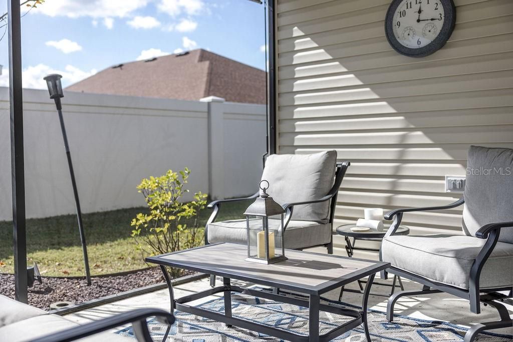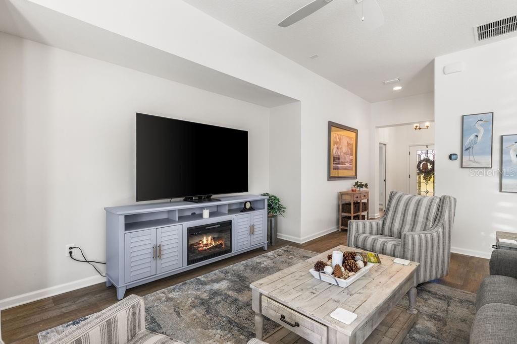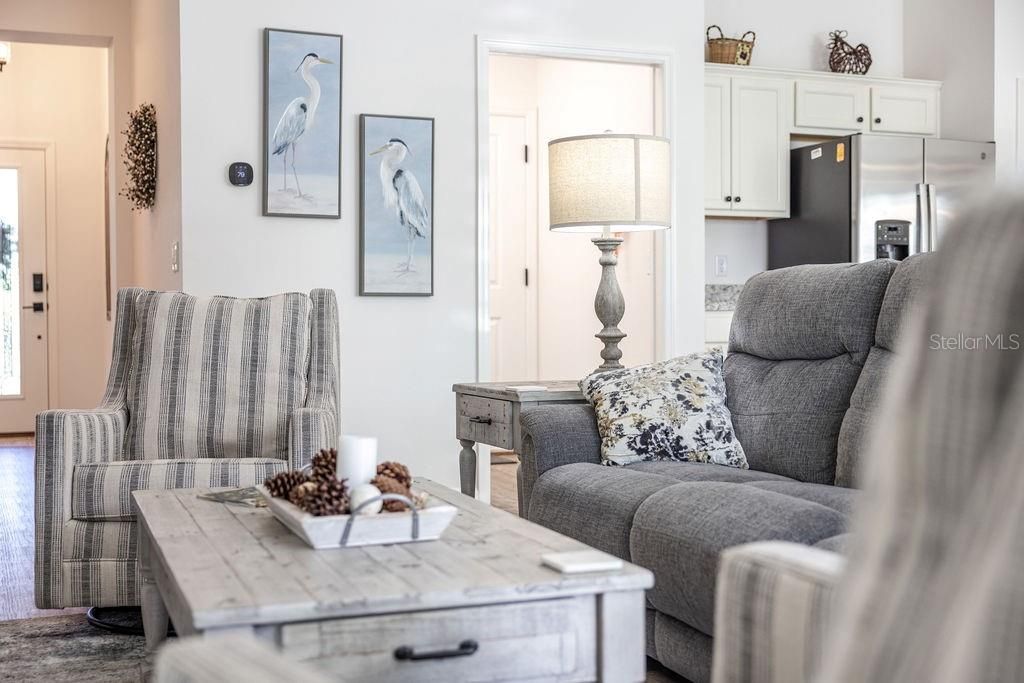 WELCOME HOME TO THIS COMPLETE TURNKEY AVAILABLE TALL PINE DESIGNER HOME located in the highly desirable Village of Richmond. This well-maintained residence offers a popular open floor plan and a comfortable blend of style, function, and privacy. Wood-look luxury vinyl plank flooring enhances the foyer, hallways, kitchen, baths, and laundry room, while plush carpet adds warmth to the remaining living spaces. The spacious living room opens through sliding glass doors to a screened lanai, with a privacy fence behind the home—an increasingly sought-after feature. The kitchen is thoughtfully designed with stainless steel appliances, a gas range, beveled-edge laminate countertops, abundant cabinetry, generous counter space, a large walk-in pantry, and a convenient breakfast bar. An inside laundry room adds everyday convenience, and the expanded two-car garage provides extra room for storage, hobbies, or golf car needs. The primary suite features a tray ceiling, large window for natural light, and an en-suite bath with dual sinks, a walk-in closet, and a tiled walk-in shower tucked behind a pocket door. Two additional bedrooms offer ample closet space and share a full guest bath with tub/shower combination. Enjoy outdoor living in the screened lanai, with an adjacent grilling pad—perfect for relaxing or entertaining. The home is situated in a neighborhood connected by scenic golf cart trails and offers quick access to championship golf, recreation, and entertainment, including Sawgrass Grove Market, Okahumpka Recreation Center, Harry & The Natives, and the newly opened Eastport Town Square. This is a rare opportunity to own a move-in-ready, beautifully upgraded home in one of The Villages’ most dynamic areas. Schedule your private showing today.