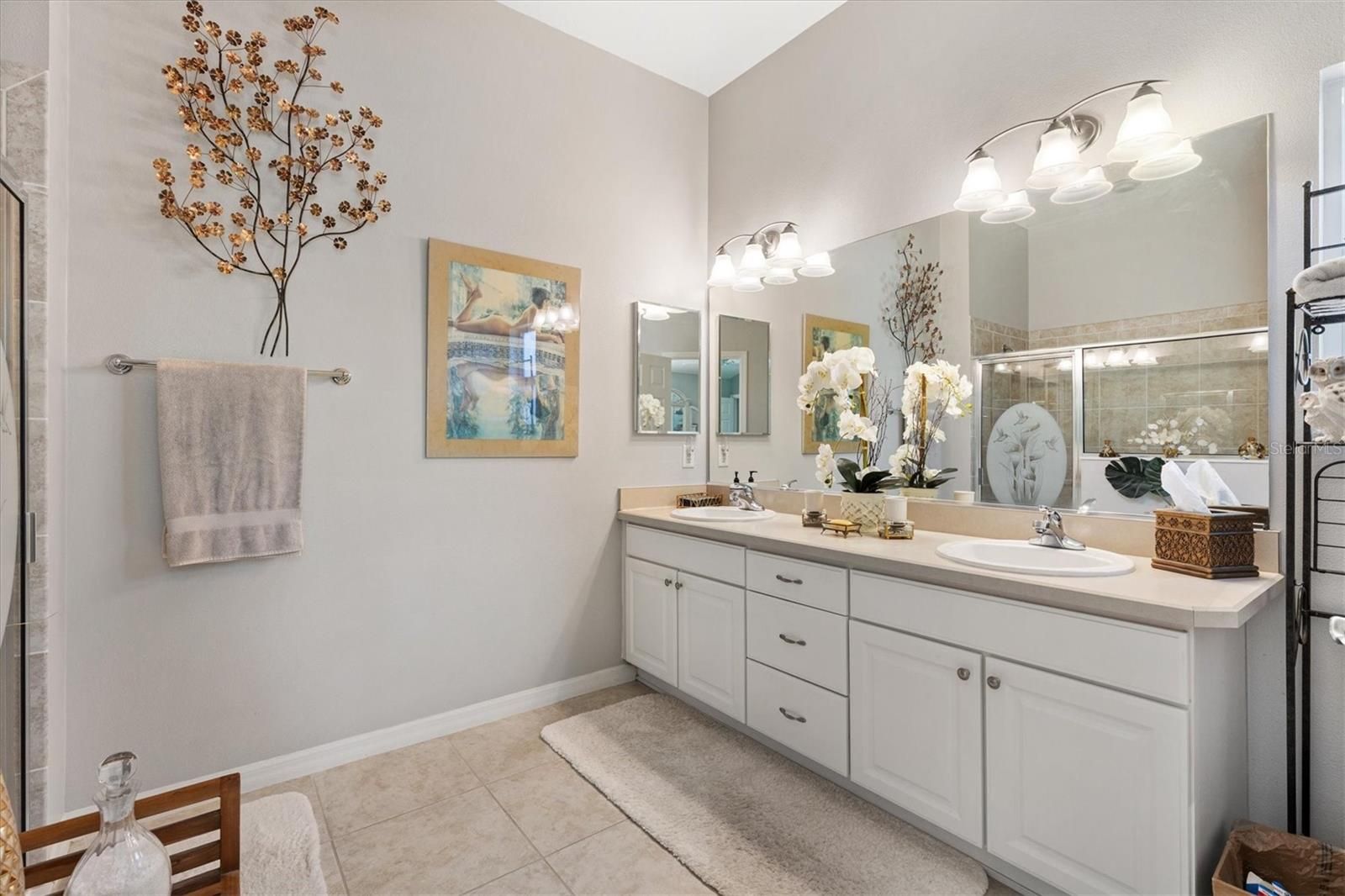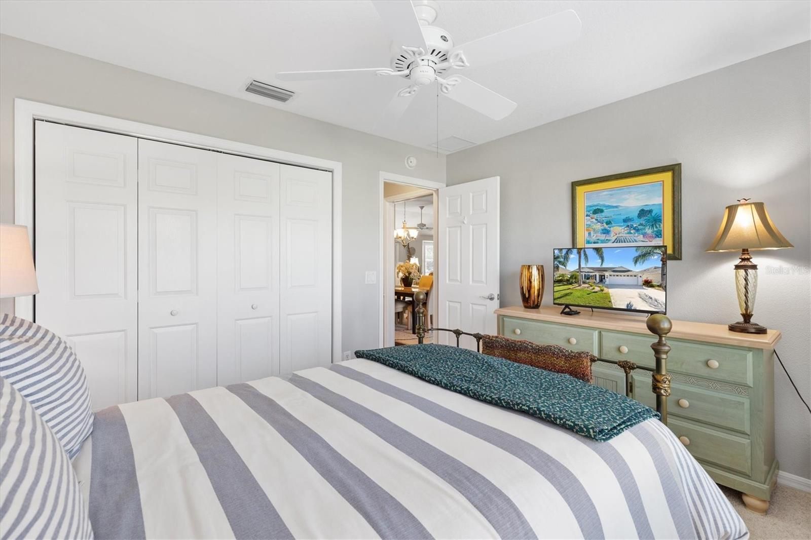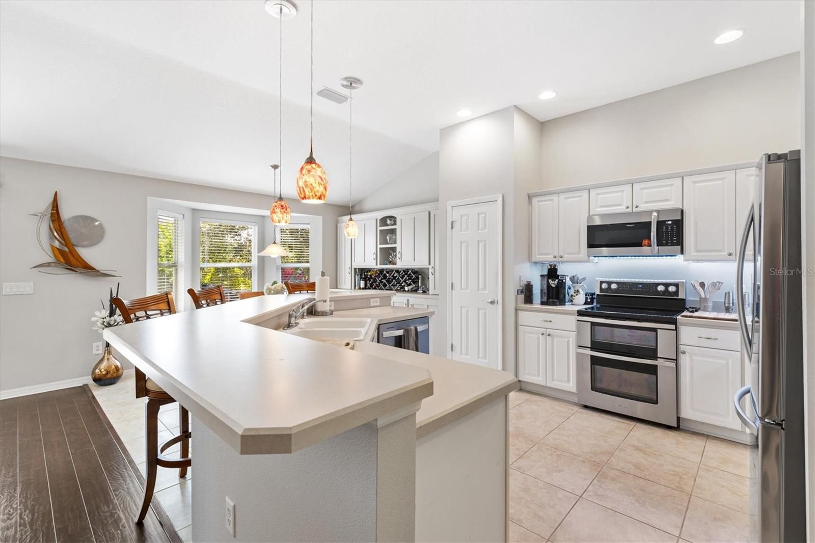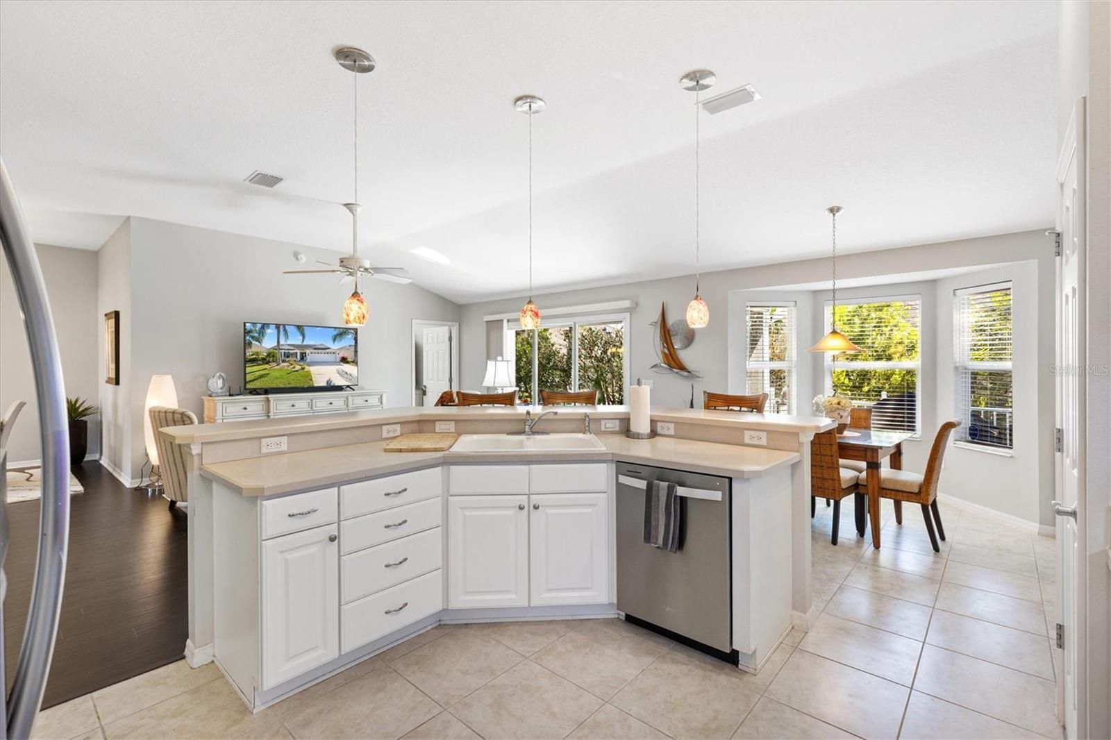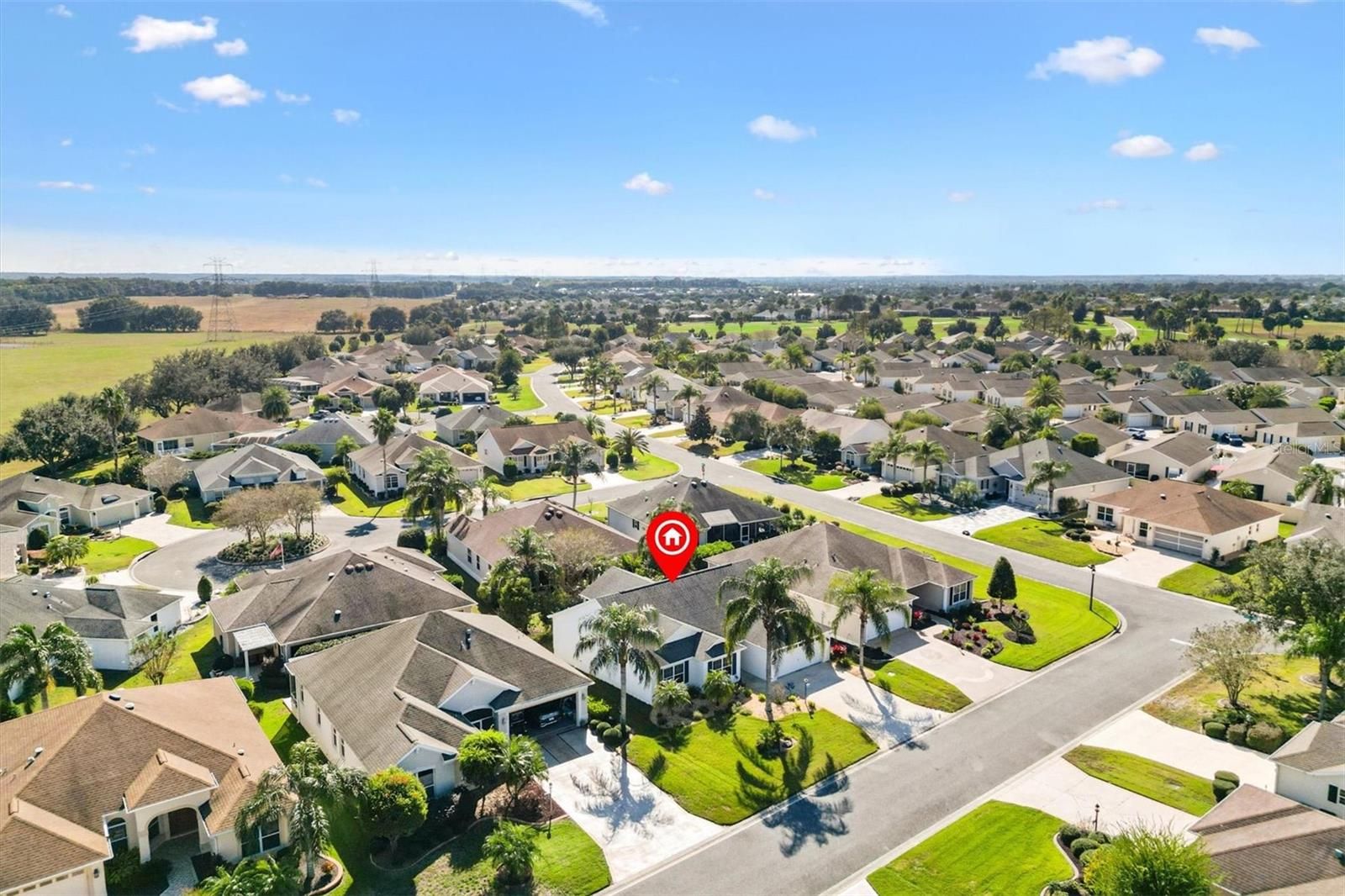 GREAT LOCATION between Lake Sumter Landing and Brownwood Town Squares. Stunning 3/2 Whispering Pines Designer home. You'll appreciate the seamless flow of the open floor plan, highlighted by wood-look luxury vinyl plank flooring that adds warmth and character. Ceiling fans throughout keep the home comfortable in every season. At the heart of the home, the spacious kitchen is both functional and inviting. It features stainless steel appliances, Pull-out shelves, a pantry closet, a generous breakfast bar with elegant pendant lighting. The sunlit dinette is perfect for casual meals with views of the backyard. The home boasts beautiful custom built-in cabinets in the eat in kitchen. The master suite is a peaceful sanctuary, offering an ensuite bath with dual vanities and a walk-in shower with a built-in bench, and a large walk-in closet. A guest bedroom is adjacent to a full bath with tub shower combo with a pocket door to allow visitors privacy and comfort. The third bedroom, without a closet, is ideal for a home office, craft room, reading room, or den. Step outside to experience true Florida living. The screened-in lanai is perfect for creating a cozy and inviting setting for morning coffee or evening entertaining. Just beyond, an outdoor patio provides the perfect space for grilling. Low-maintenance updated landscaping enhance the home’s curb appeal and add charm to the exterior. The interior laundry room offers plenty of storage and a mud sink, along with new washer and dryer for modern convenience. Additional features include an attic stair kit, and a spacious two-car garage with an electronic roll-down screen. Furniture Package available separately, Some décor available separately. Be sure to watch our virtual tour of this wonderful home and schedule your appointment to see it today so you can start living The Villages dream.