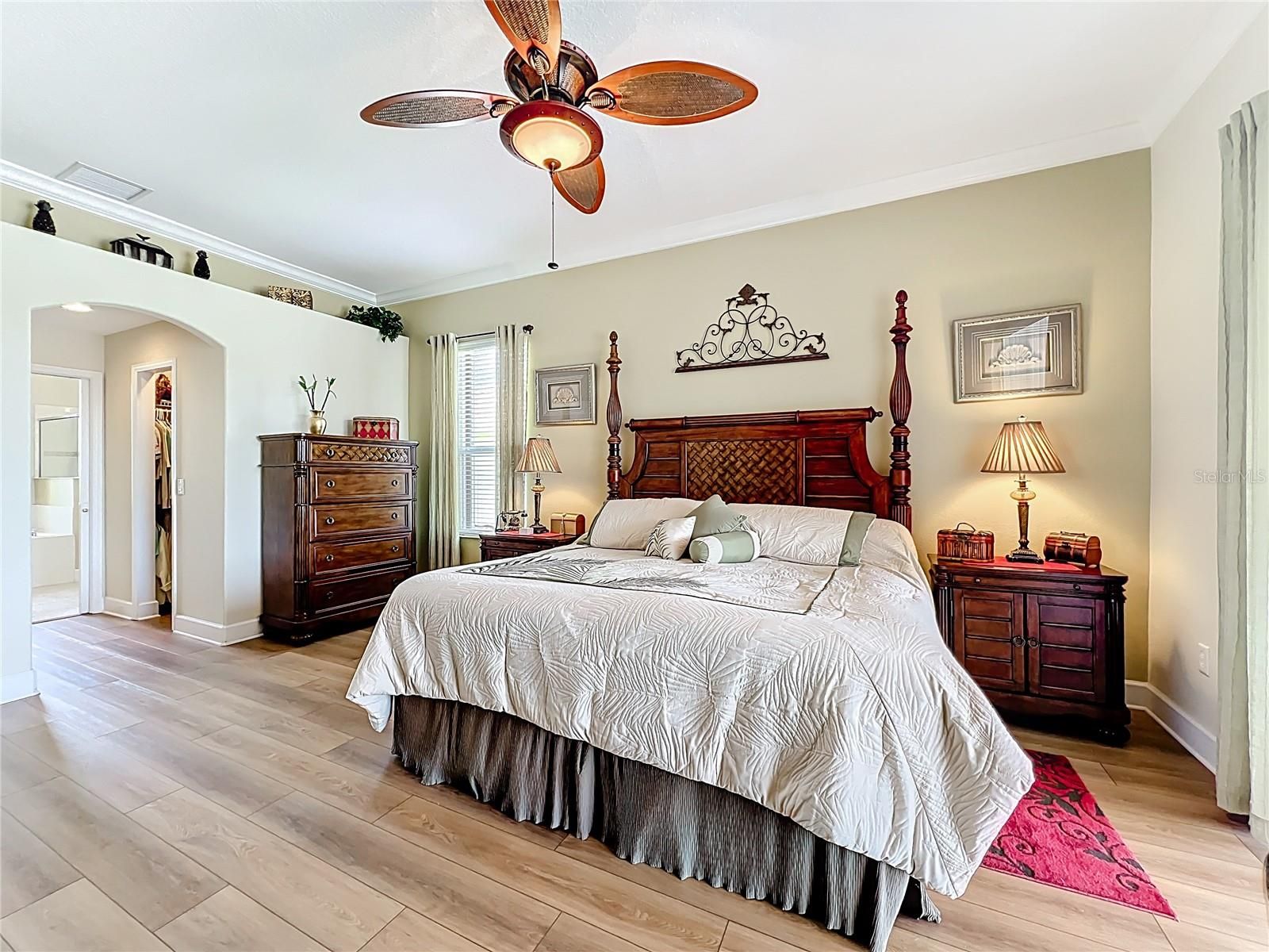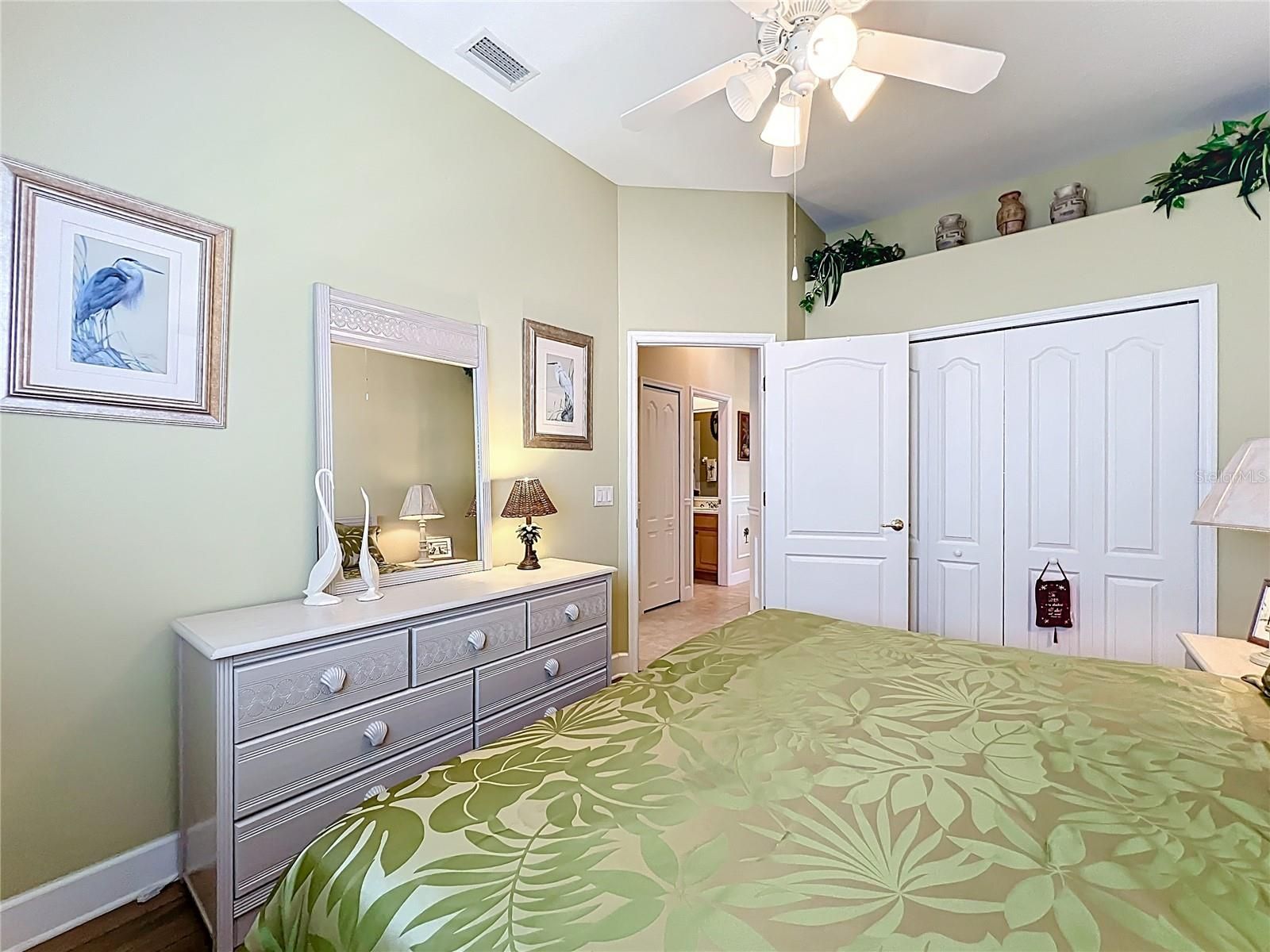 - Ceiling Fan(s), Eat-in Kitchen, High Ceilings, Open Floorplan, Main Level Primary, Split Bedrooms, Stone Counters, Thermostat, Walk-In Closet(s)