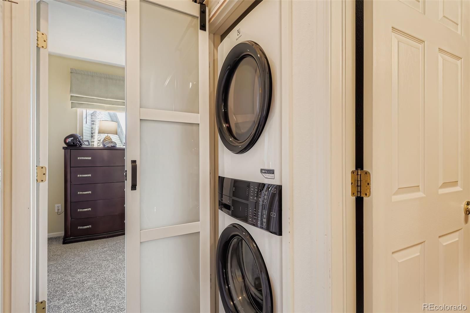 Check out this great opportunity! Ideally located backing to Littleton Golf Course, this 2 bedroom condo provides a ton of space for the money. The main living area features a spacious, open kitchen with breakfast bar seating and all appliances included, and a cozy living room with a gas fireplace and sliding door to the private balcony. Step upstairs to discover the primary bedroom and en-suite bathroom with double sinks and a walk-in shower, a second bedroom and full bathroom, PLUS the laundry closet with stacked washer and dryer included! Both bedrooms feature double closets. The two car finished tandem garage has a convenient storage closet. Newer carpet throughout! INCREDIBLE VIEWS! ABUNDANT COMMUNITY AMENITIES including a pool, fitness center, and clubhouse. Riverwalk is in the heart of downtown Littleton - walking distance to restaurants, shopping, and other conveniences! Don't miss out - this is a MUST SEE!