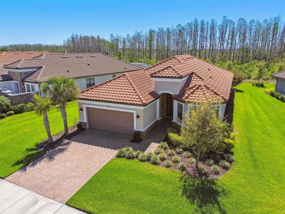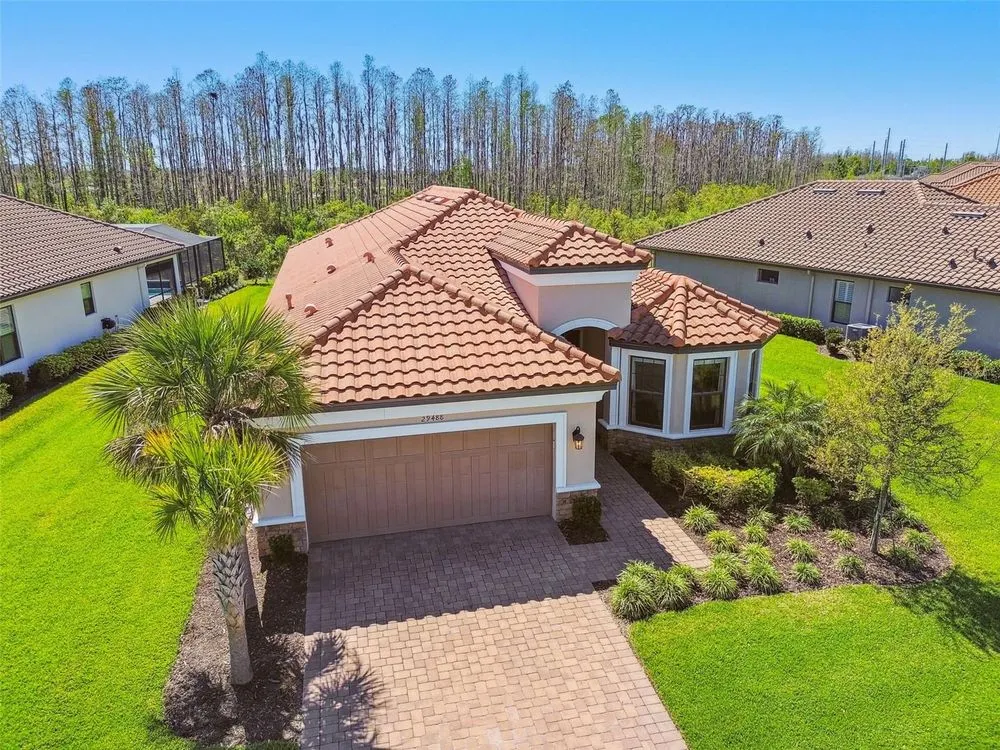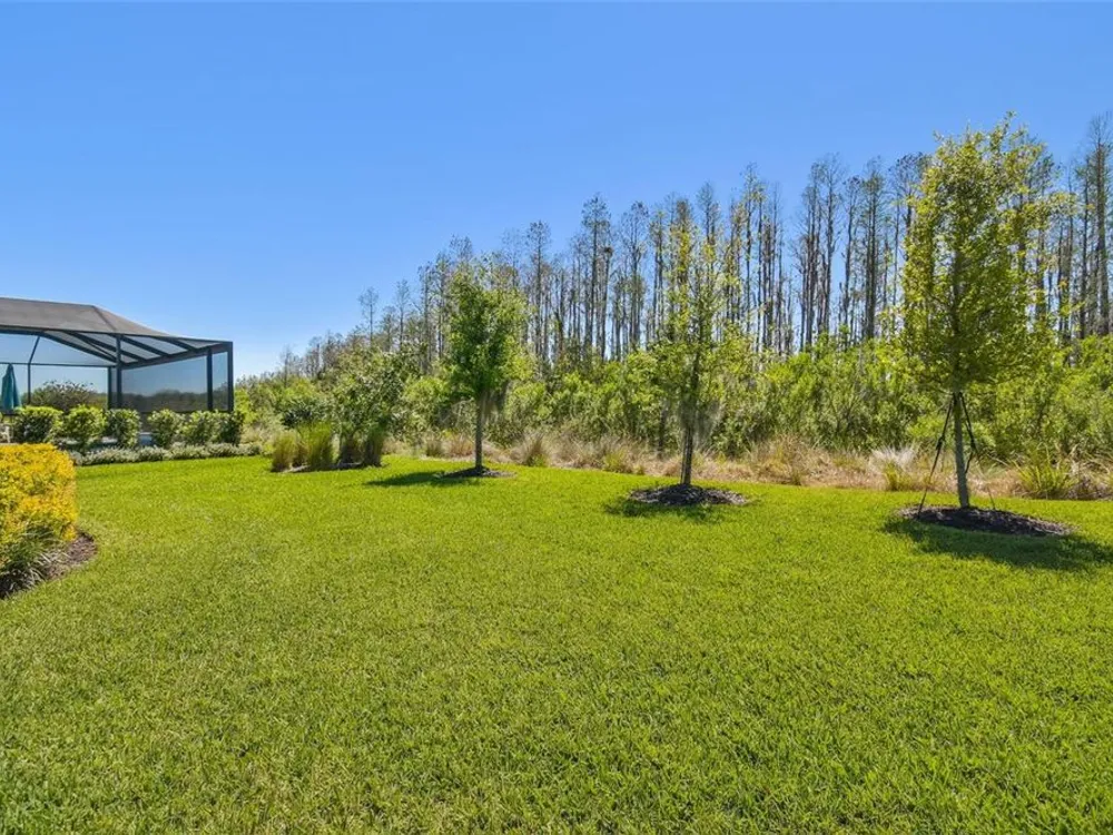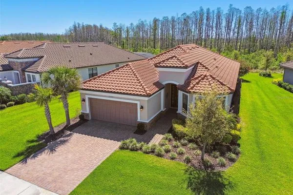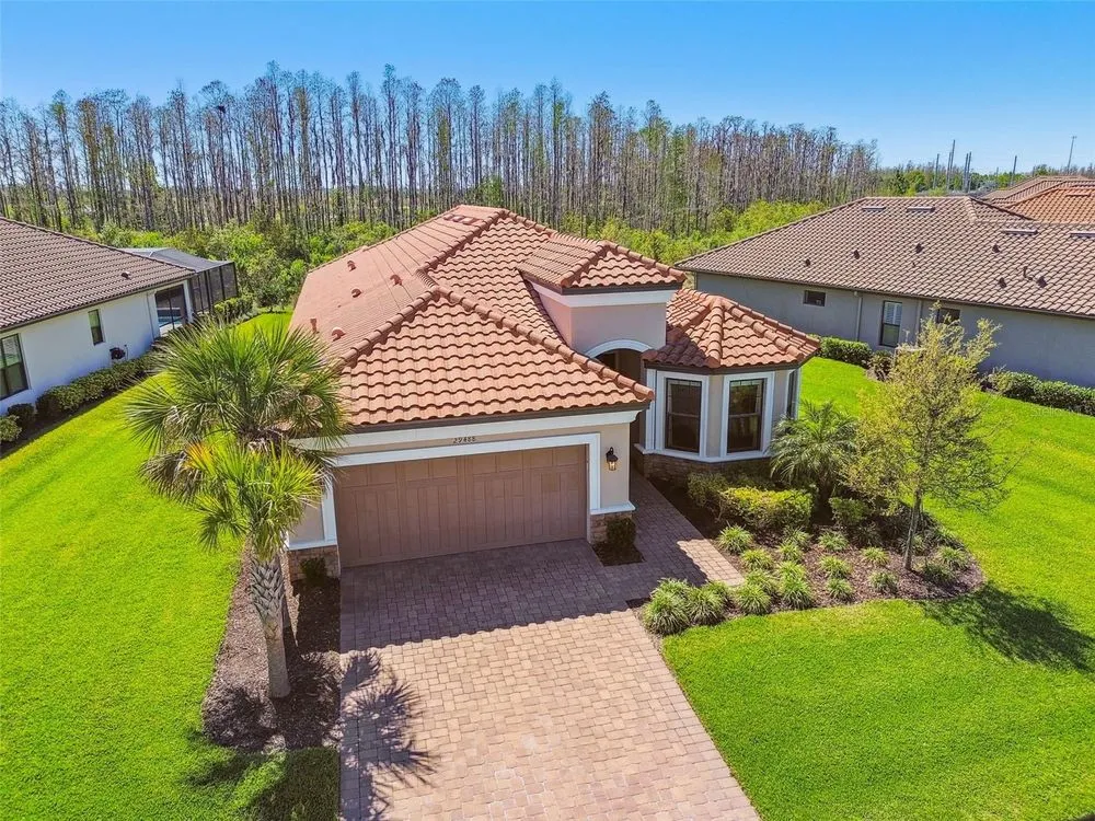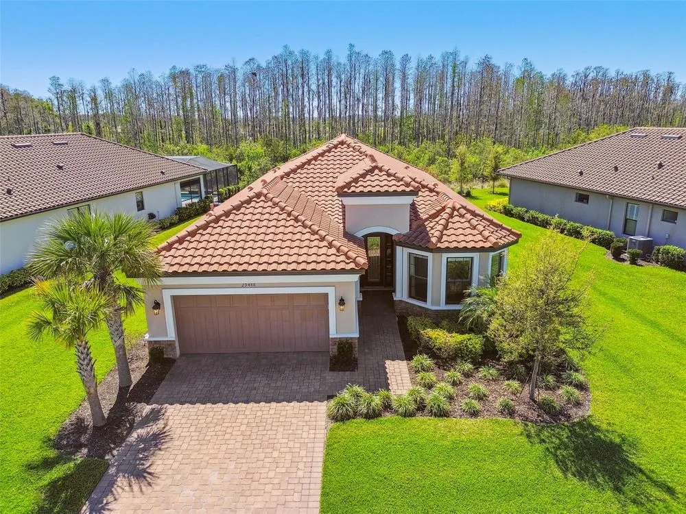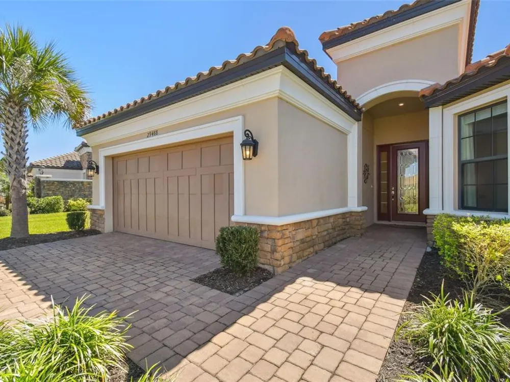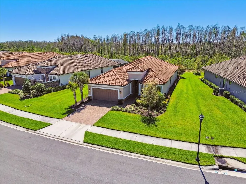 Welcome home! Enjoy the luxury living in this Esplanade of Wiregrass located in a maintenance free, 55+ gated community. Why wait to build when you can enjoy this Lazio dream home now. This home features 2,334 SF, 3 bedrooms, 3 baths, an office/flex room, an extended garage on an oversized conservation lot. You will notice the attention to detail as you enter the custom glass door to an open floor plan, extended gourmet kitchen overlooking a large family room and dining room, featuring 42” cabinets with crown molding, quartz counters, under cabinet LED lighting, upgraded stainless steel appliances, porcelain farm sink, enormous island with prep sink, an ample walk-in pantry and extra counter space all designed for entertaining. The owner’s oversized suite has dual sinks, walk in shower, a huge closet, and a tray ceiling. The family room boasts coffered ceilings with crown molding, and lots of natural light. Bedroom two has an ensuite bath and bedroom three has a bay window extension. This one-story Taylor Morrison custom home has an open floor plan with an extensive list of upgrades. These upgrades include but are not limited to dining room with custom wall mirrors, extended eat in kitchen, designer tile floors throughout in common areas, custom designer drapes, quartz counters in bath, extended paver driveway, tile roof, large laundry room with cabinets & utility sink, garage with epoxy floors, and a water softener. The premium oversized conservation lot boasts custom landscaping. Step out on to the covered screened lanai and you will be ready to enjoy the Florida outdoors. Esplanade of Wiregrass Ranch has a luxurious upscale club house with full-time lifestyle and fitness directors. The Venue includes a resort style pool, hot tub, cabanas, dog park, state-of-the-art 24-hour fitness center, billiard/card room, and spa room. For active outdoor entertainment there is a firepit, tennis, pickleball, bocci, and a large meeting/gathering area. Esplanade also includes worry free yard maintenance, reclaimed water and Spectrum TV and internet package included in fees. This home is located only minutes from shopping, I-75, hospitals, restaurants, recreation, and entertainment. Come see for yourself this exquisite residence and call it home! Please see walkthrough and Matterport 3D tours.