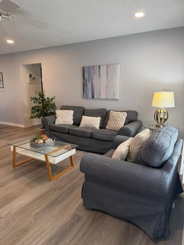 One or more photo(s) has been virtually staged. Welcome to 2949 Briar Cliff Drive, the perfect move-in-ready home located in Palm Harbor’s premier 55+ golf community! This is a two-bedroom, two-bathroom, one-car garage, with 1,211 sf. Additional sunroom space of over 200 sqft with A/C and heating adds comfort and functionality, separate from the home's listed square footage. Updates include a roof 2018 and A/C 2023. Excellent curb appeal makes this home stand out with its fresh white painted exterior, well-landscaped yard, small front patio, and extended driveway for additional parking. Step into the open-layout home, and you will first notice the updated laminate wood floors through the living room and formal dining room, plantation shutters, recessed lighting, and views straight out to the back patio and yard. The adjacent kitchen is a roomy galley-style with white cabinets and black stone countertops, and views out to the backyard. You also have a large informal dining area with wide open sliding glass doors that lead out to the updated patio addition. This sunny space is fully air-conditioned (not included in square footage) and would make a perfect reading room, hobby room, and more. This patio connects with the original screened-in patio adjacent, which provides even more outdoor living space, overlooking your luciously green backyard. The original patio has sliding glass doors that lead back into the formal dining room, which easily flows into the living quarters. The primary bedroom is spacious and provides a whole wall of closet space, an en-suite bathroom with spacious granite countertop, and walk-in shower with glass doors. Down the hall is a large linen closet, and your guest bedroom (also with ample closet space) and full guest bathroom with an updated granite vanity and shower/tub combo. The home also features a separate laundry room with sink and storage, as well as an updated electrical panel, and is located in a non-flood zone. The Highland Lakes community includes outstanding resort-style amenities and a social country club atmosphere. The HOA fee includes free golf on 3 private executive courses, tennis, pickleball, bocce, and shuffleboard courts, a huge heated pool and spa, a large clubhouse with a busy schedule of performing arts and social events, exercise classes, a lodge on Lake Tarpon with a private boat ramp, fishing pier, community pontoon boats, and 2nd heated pool, and free RV or boat storage in a secure lot. Highland Lakes is a golf cart community! This home is conveniently located near award-winning white sandy beaches, retail, restaurants, medical services, and a less than 30-minute drive to the airport and a cruise port!