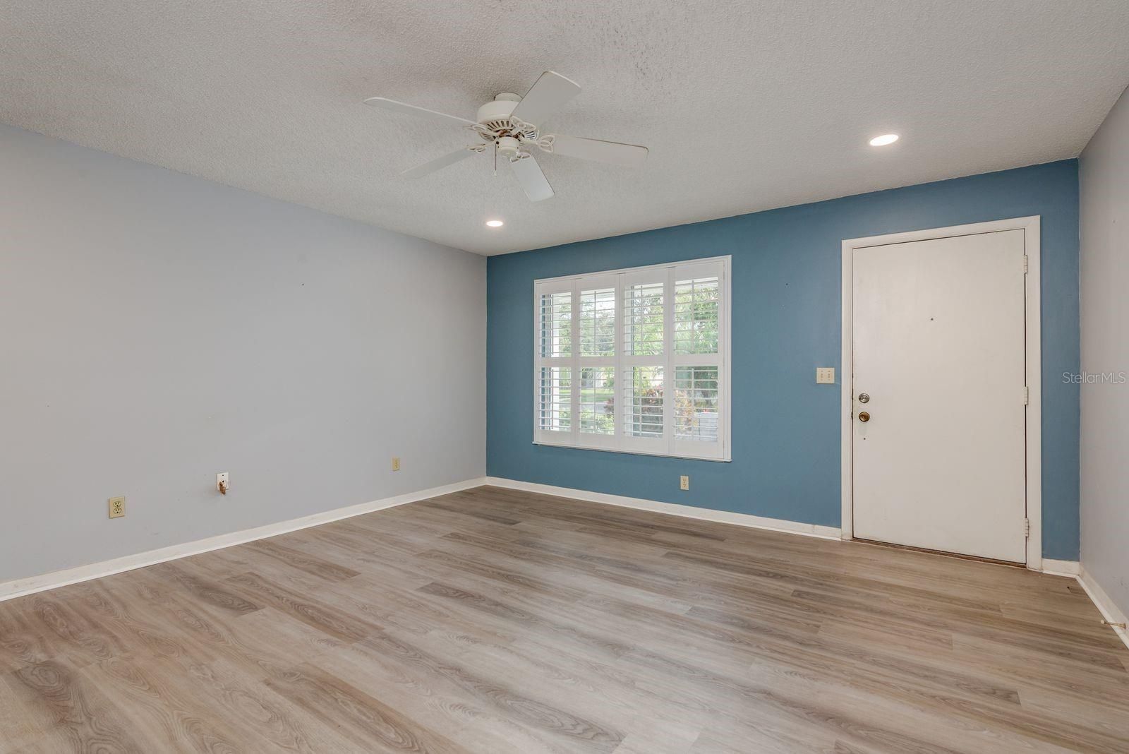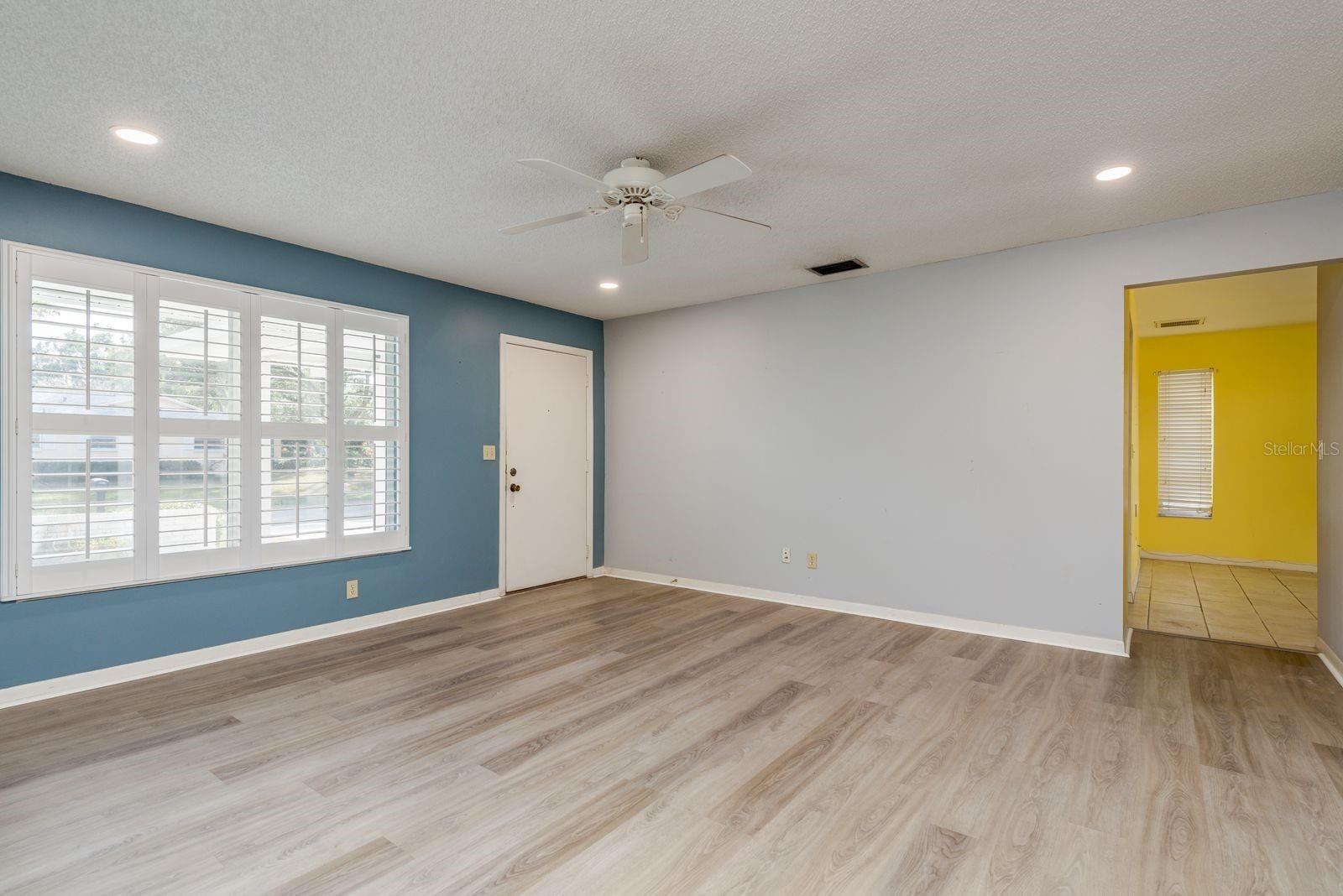 One or more photo(s) has been virtually staged. Welcome to 2949 Briar Cliff Drive, the perfect move-in-ready home located in Palm Harbor’s premier 55+ golf community! This is a two-bedroom, two-bathroom, one-car garage, with 1,211 sf. Additional sunroom space of over 200 sqft with A/C and heating adds comfort and functionality, separate from the home's listed square footage. Excellent curb appeal makes this home stand out with its fresh white painted exterior, well-landscaped yard, small front patio, and extended driveway for additional parking. Step into the open-layout home, and you will first notice the updated laminate wood floors through the living room and formal dining room, plantation shutters, recessed lighting, and views straight out to the back patio and yard. The adjacent kitchen is a roomy galley-style with white cabinets and black stone countertops, and views out to the backyard. You also have a large informal dining area with wide open sliding glass doors that lead out to the updated patio addition. This sunny space is fully air-conditioned (not included in square footage) and would make a perfect reading room, hobby room, and more. This patio connects with the original screened-in patio adjacent, which provides even more outdoor living space, overlooking your luciously green backyard. The original patio has sliding glass doors that lead back into the formal dining room, which easily flows into the living quarters. The primary bedroom is spacious and provides a whole wall of closet space, an en-suite bathroom with spacious granite countertop, and walk-in shower with glass doors. Down the hall is a large linen closet, and your guest bedroom (also with ample closet space) and full guest bathroom with an updated granite vanity and shower/tub combo. The home also features a separate laundry room with sink and storage, as well as an updated electrical panel, and is located in a non-flood zone. The Highland Lakes community includes outstanding resort-style amenities and a social country club atmosphere. The HOA fee includes free golf on 3 private executive courses, tennis, pickleball, bocce, and shuffleboard courts, a huge heated pool and spa, a large clubhouse with a busy schedule of performing arts and social events, exercise classes, a lodge on Lake Tarpon with a private boat ramp, fishing pier, community pontoon boats, and 2nd heated pool, and free RV or boat storage in a secure lot. Highland Lakes is a golf cart community! This home is conveniently located near award-winning white sandy beaches, retail, restaurants, medical services, and a less than 30-minute drive to the airport and a cruise port!