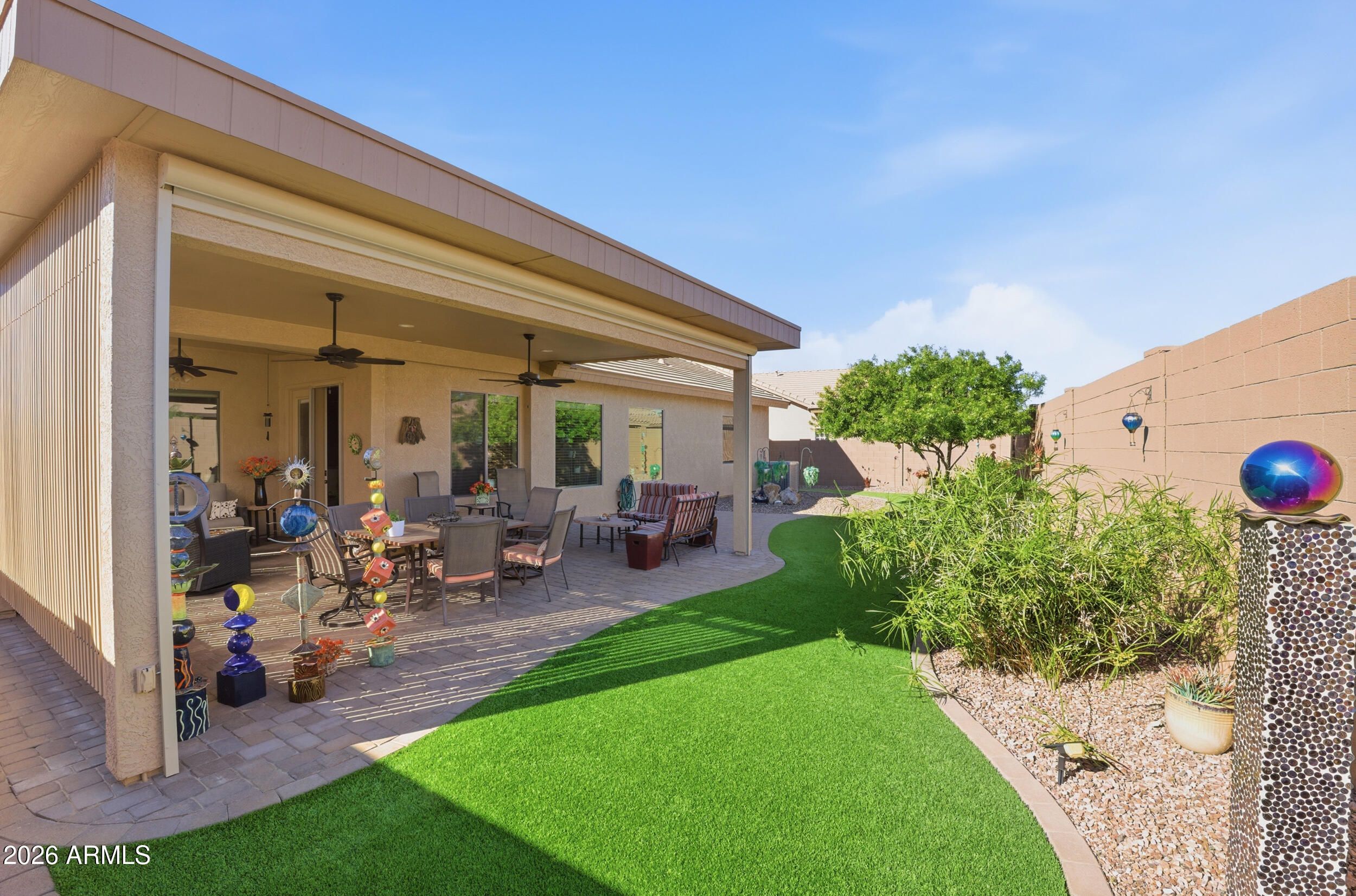 Stop the car! Located in the desirable 55+ community of Sunland Springs Village, this expanded 2350 floor plan offers an expansive great room with 10-foot ceilings throughout. Featuring 3 bedrooms plus a den, this home boasts a gorgeous kitchen with staggered upper cabinets, stainless steel appliances, and granite countertops. Enjoy morning sunrises from the covered back patio with pavers, a large electric roll-down shade, and low-maintenance artificial turf. 2-car plus golf cart garage includes built-in cabinets, insulated doors, and two 220-volt outlets, including one for an electric vehicle. Recent updates include new flooring (2025), HVAC (2024), water heater (2025), extended patio (2023), added attic insulation (2023), and exterior paint (2024).Beautifully updated home is a must see!