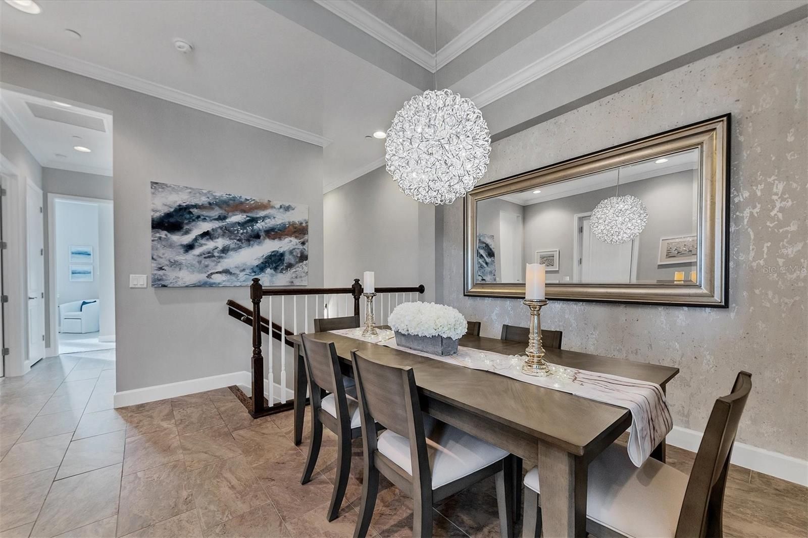 - Ceiling Fan(s), Crown Molding, Eat-in Kitchen, Elevator, High Ceilings, Open Floorplan, Upper Level Primary, Solid-Wood Cabinets, Split Bedrooms, Stone Counters, Vaulted Ceiling(s), Walk-In Closet(s), Window Treatments