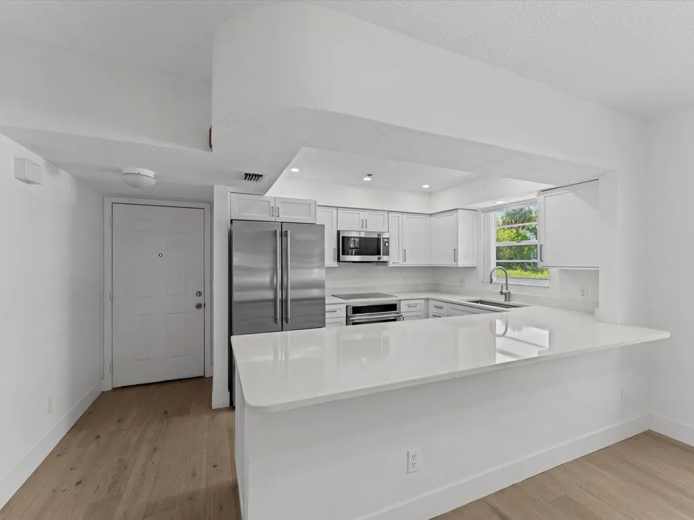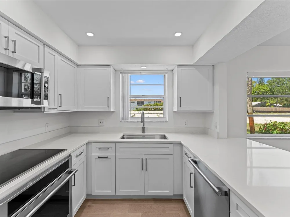 Welcome to this exceptional FIRST-FLOOR CORNER unit, fully REMODELED with $70k in premium upgrades. This beautifully designed 2-bedroom, 2-bathroom home boasts a completely new kitchen featuring top-of-the-line Monogram appliances, custom cabinetry, and sleek quartz countertops. The master suite offers a spa-like en-suite bathroom with contemporary fixtures and sophisticated tiling. Enjoy added convenience with a brand-new washer and dryer, and the privacy of a corner unit with easy access and a designated covered carport space. Located in a vibrant and active 55+ community, this home offers fantastic amenities, including a pool, clubhouse, shuffleboard, and a putting green. Plus, this unit is just a short walk to the clubhouse and all community activities.