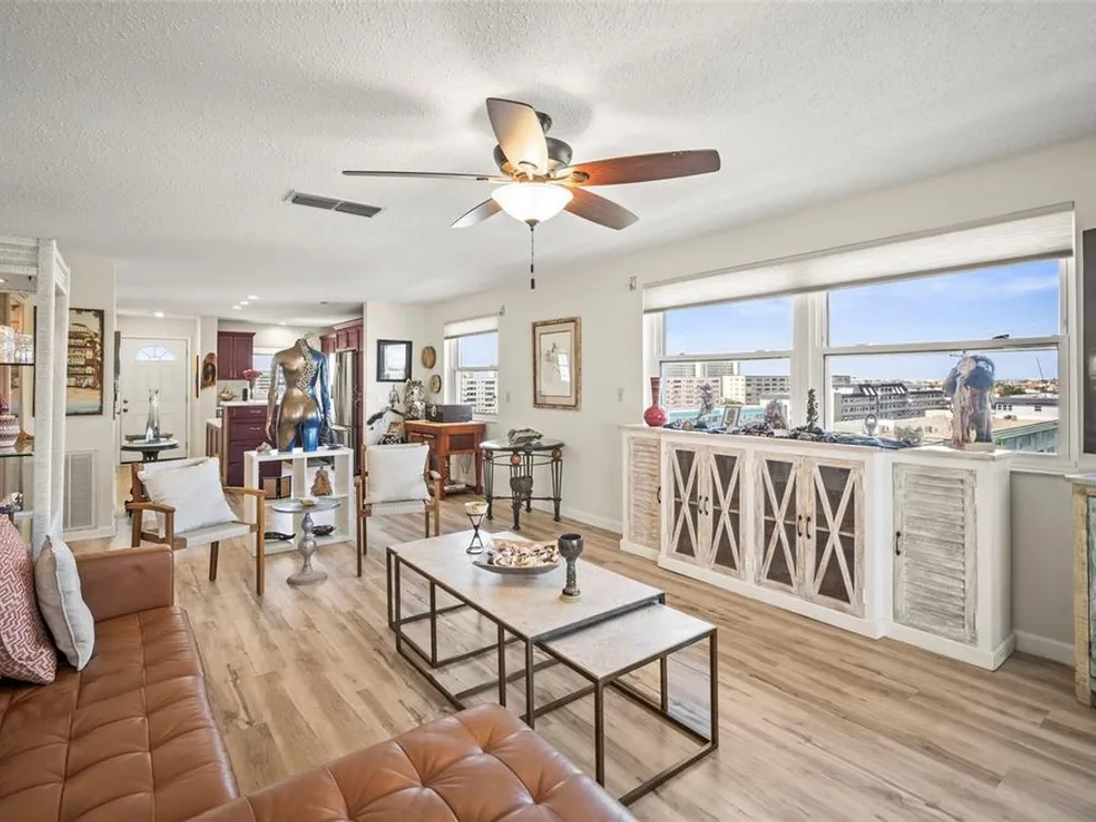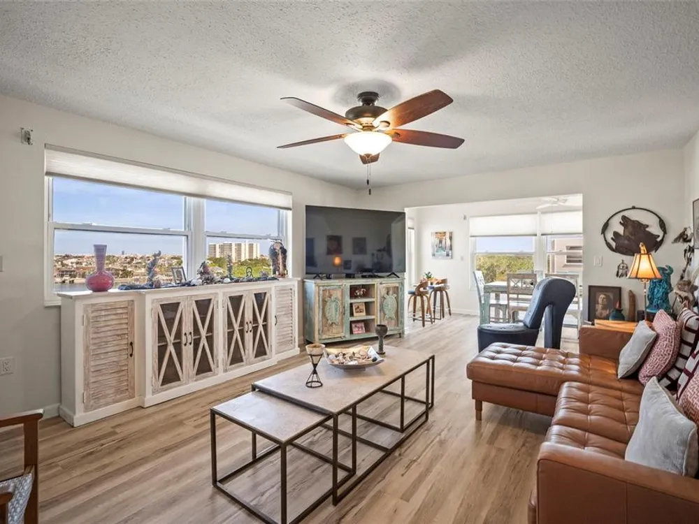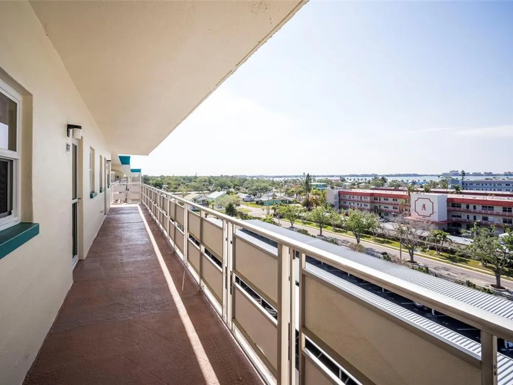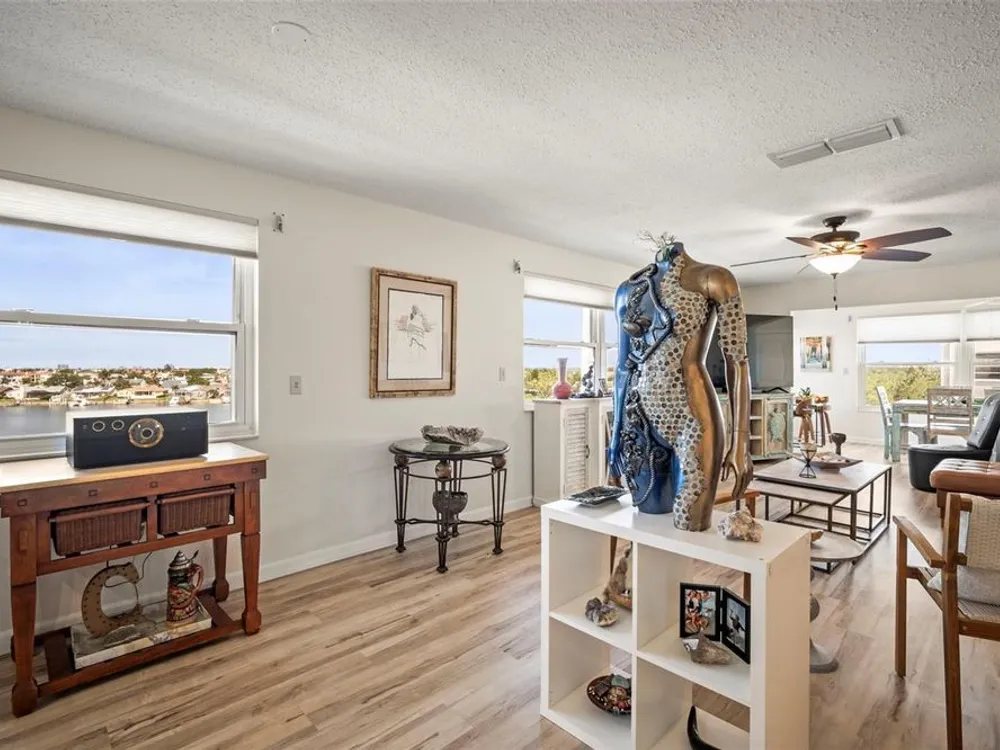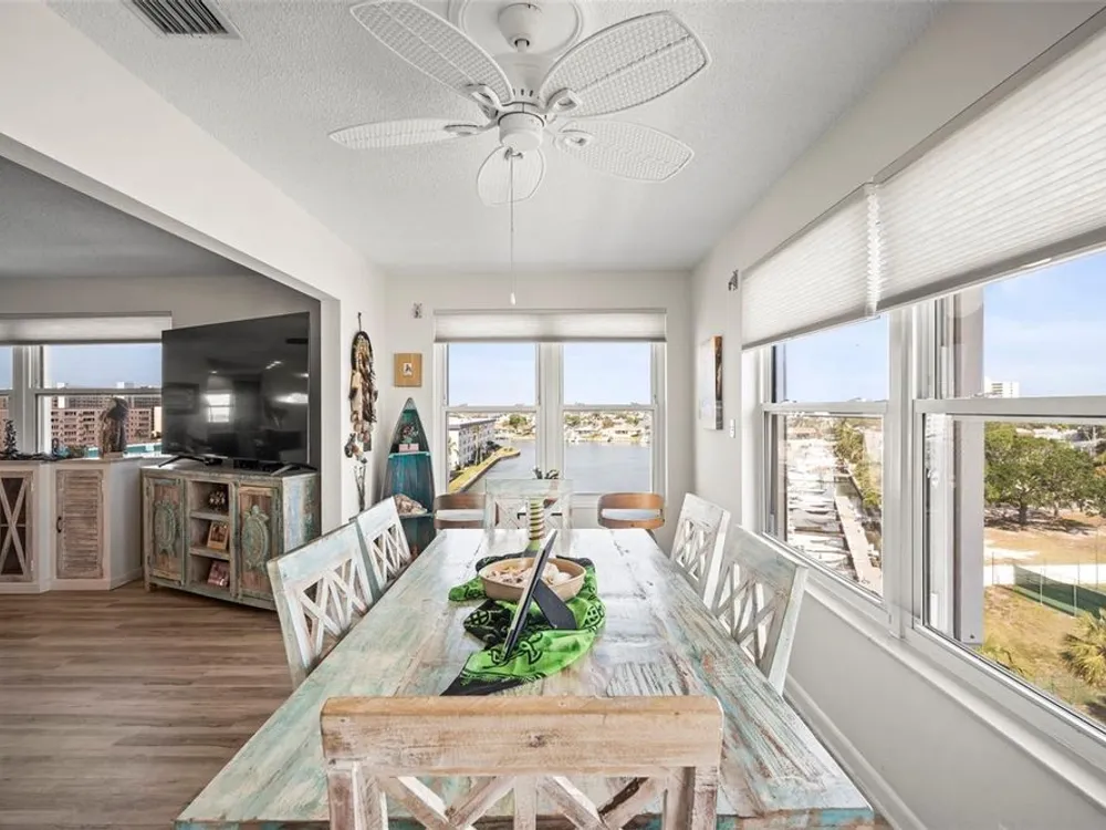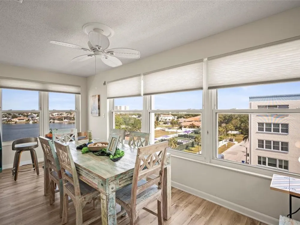 “Penthouse Style Living” - Enjoy exceptional water views from every window from this 6th-floor, rarely available corner unit #615 in the Jamison Building with assigned covered parking. This 2-bedroom 2-bathroom condo offers over 1250 sqft of living space with neutral paint/decor and an open floor plan, creating multiple living room and dining room options for furniture placement. The large sunroom is banked by loads of windows, creating a sun-filled room to enjoy morning coffee or the evening sunset. The sizeable primary bedroom has a walk-in closet and an en suite bathroom with a walk-in shower. The 2nd bedroom shares a hallway bathroom with additional hallway storage. The kitchen has been designed with a convenient breakfast bar island and features rich wood cabinets and granite countertops with stainless steel appliances. This move-in-ready sun-filled condo has hurricane impact windows and is a perfect retreat for relaxation or enjoying the year-round heated pool right outside the back door. The Jamison building has a pool in the middle courtyard with convenient laundry located on the 5th floor. Town Shores is a vibrant, active 55+ community with an array of activities for all interests. Tennis and Pickleball enthusiasts can enjoy the courts in the community as well as the ongoing activities at the Club House. Enjoy dining, coffee shops, or shopping with the close by Dowtown Gulfport! Monthly fees include your premium cable package, trash, water, sewer, gas, all exterior maintenance, escrow reserves, community pools (4), and all recreational facilities (owner pays electric). This building experienced no flooding or damage from hurricanes. All milestone and structural integrity studies ( SIRS) have been completed. No upcoming special assessments.