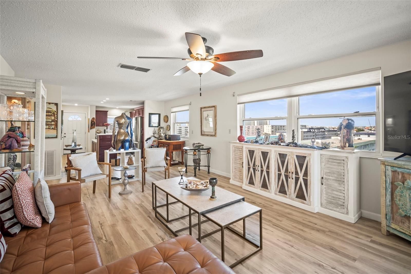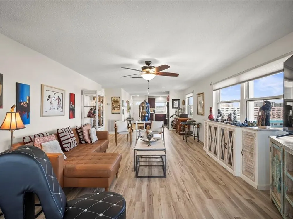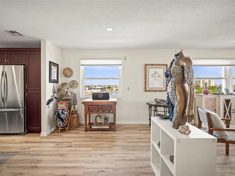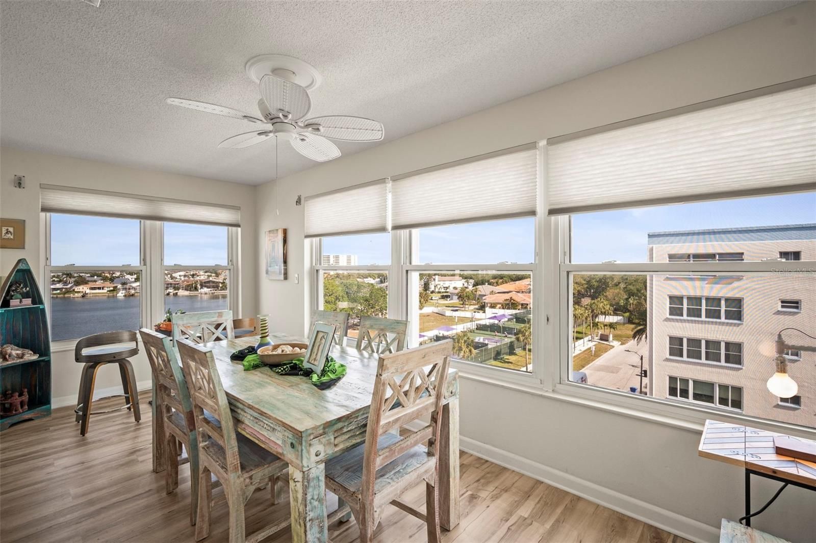 “Penthouse Style Living” - Enjoy exceptional water views from every window from this 6th-floor, rarely available corner unit #615 in the Jamison Building with assigned covered parking. This 2-bedroom 2-bathroom condo offers over 1250 sqft of living space with neutral paint/decor and an open floor plan, creating multiple living room and dining room options for furniture placement. The large sunroom is banked by loads of windows, creating a sun-filled room to enjoy morning coffee or the evening sunset. The sizeable primary bedroom has a walk-in closet and an en suite bathroom with a walk-in shower. The 2nd bedroom shares a hallway bathroom with additional hallway storage. The kitchen has been designed with a convenient breakfast bar island and features rich wood cabinets and granite countertops with stainless steel appliances. This move-in-ready sun-filled condo has hurricane impact windows and is a perfect retreat for relaxation or enjoying the year-round heated pool right outside the back door. The Jamison building has a pool in the middle courtyard with convenient laundry located on the 5th floor. Town Shores is a vibrant, active 55+ community with an array of activities for all interests. Tennis and Pickleball enthusiasts can enjoy the courts in the community as well as the ongoing activities at the Club House. Enjoy dining, coffee shops, or shopping with the close by Dowtown Gulfport! Monthly fees include your premium cable package, trash, water, sewer, gas, all exterior maintenance, escrow reserves, community pools (4), and all recreational facilities (owner pays electric). This building experienced no flooding or damage from hurricanes. All milestone and structural integrity studies ( SIRS) have been completed. No upcoming special assessments.