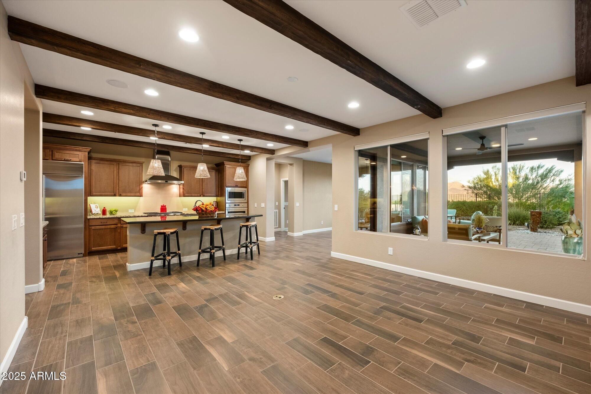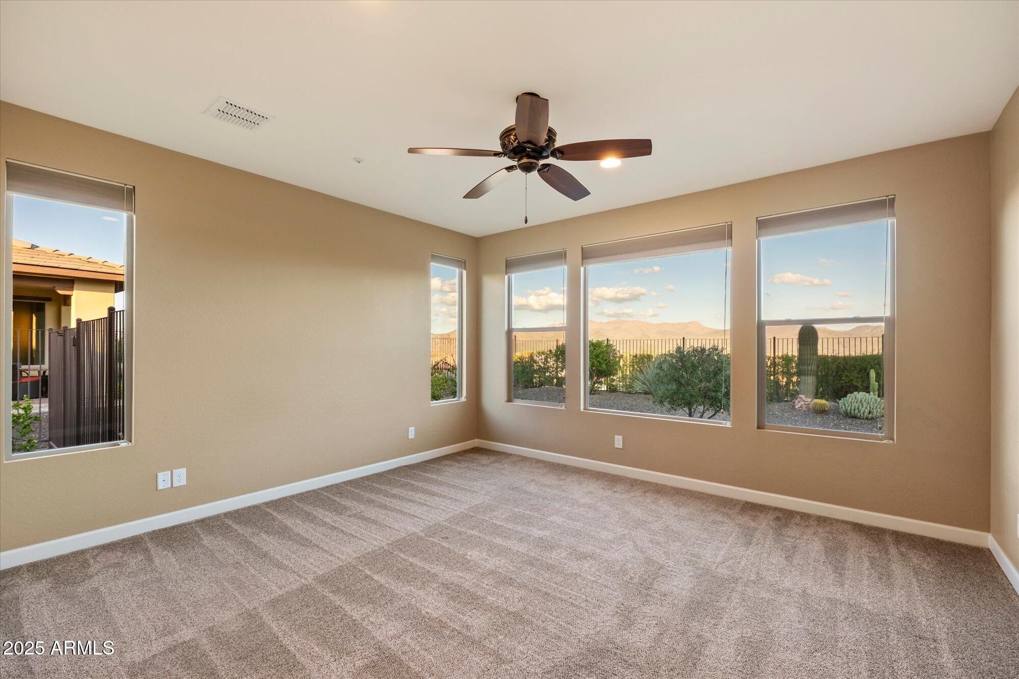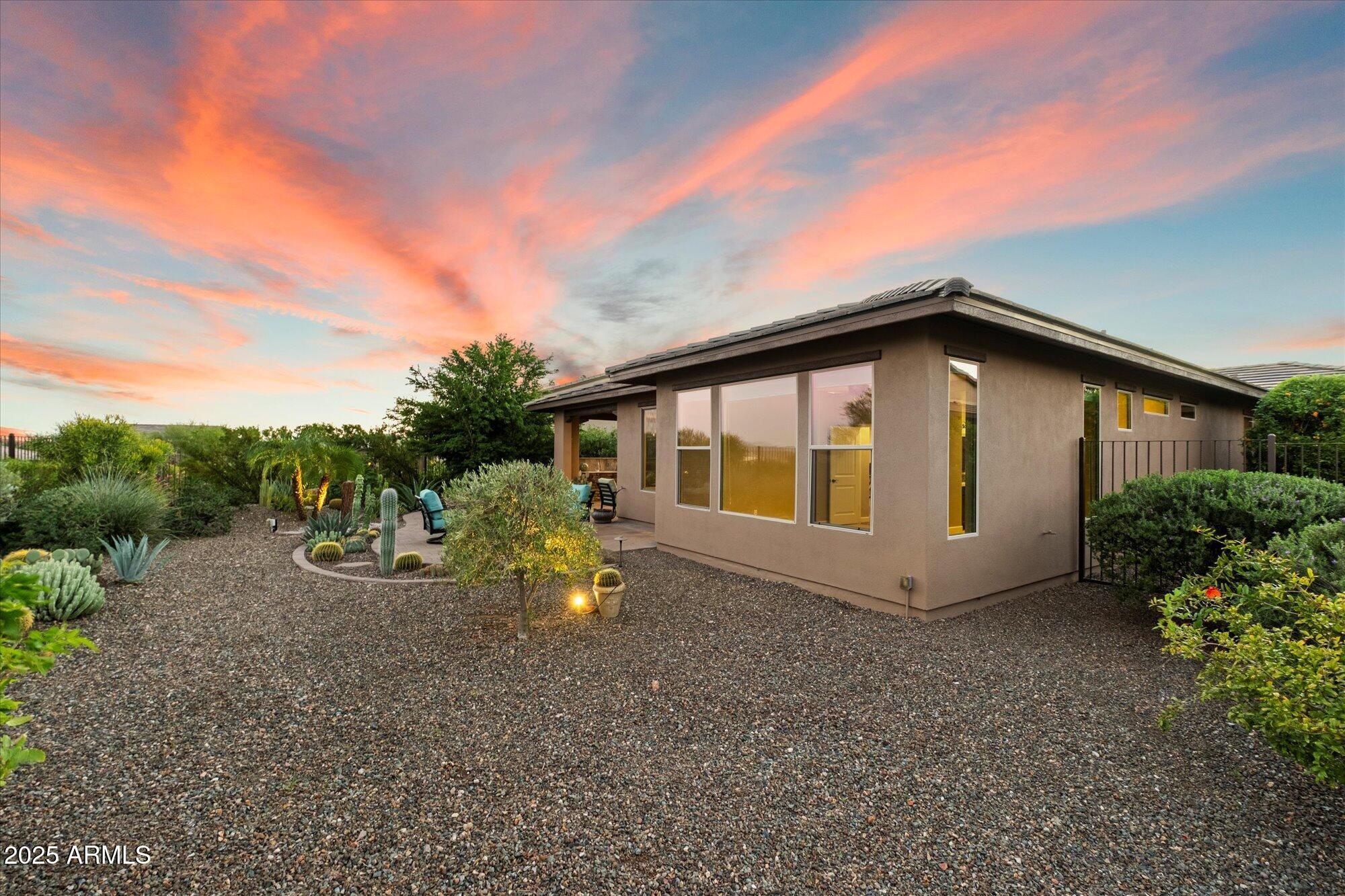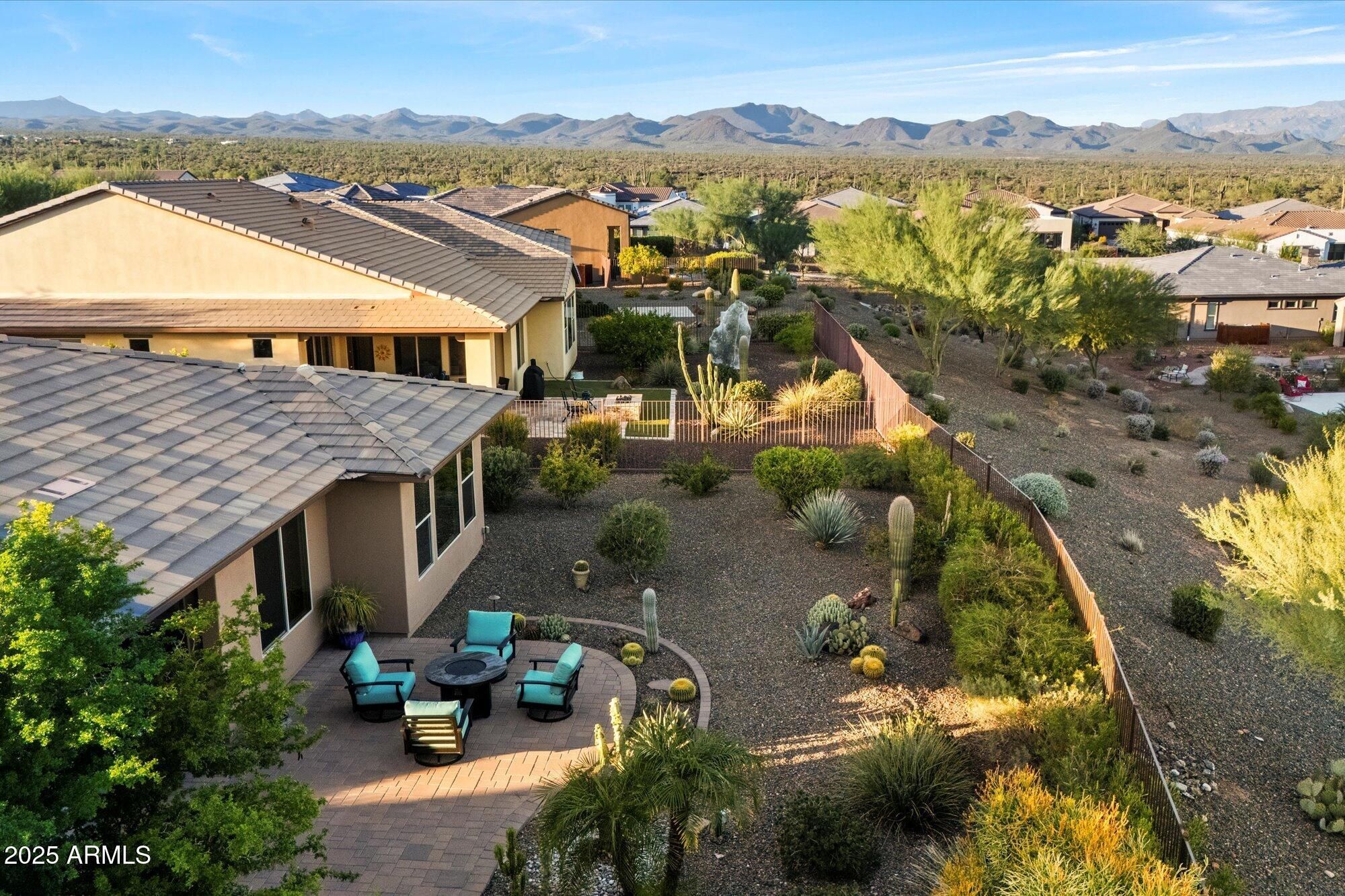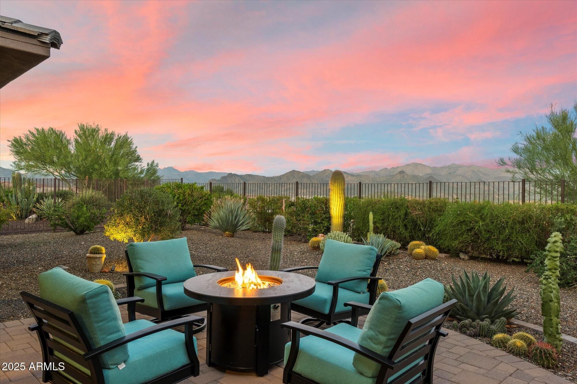 Set on an elevated premium lot capturing sweeping views of Four Peaks and the surrounding mountains, this home is warm and welcoming and truly unique for this model with a 3-car garage w/AC.. plus a golf cart garage. The landscape is mature and beautiful and includes 3 citrus trees. The open floor plan allows for easy entertaining, the kitchen has a luxury Wolfe gas cooktop, oversized refrigerator and a large center island. The family room is bright with custom wood beams on the ceiling. The Dining area is picturesque with the beautiful trees and views of the mountains of Tonto National Forest. The east view from the primary bedroom is breathtaking! The primary bath has warm earth tones, two separate sink areas and a spacious walk-in closet with custom cabinetry and shelving. This home is perfect for entertaining.The guest bedroom is thoughtfully positioned to provide privacy and comfort, complimented by beautifully appointed bathroom. A dedicated office or den space adds versatility, ideal for remote work or quiet reflection. Stepping outside, the backyard feels like a private resort. An extended covered patio opens to a custom outdoor kitchen and tranquil water feature, surrounded by breathtaking mountains and sunrise views that make every moment outdoors unforgettable. With its blend of elegance, comfort, and panoramic beauty, this home captures the true spirit of luxury living in Trilogy at Verde River.