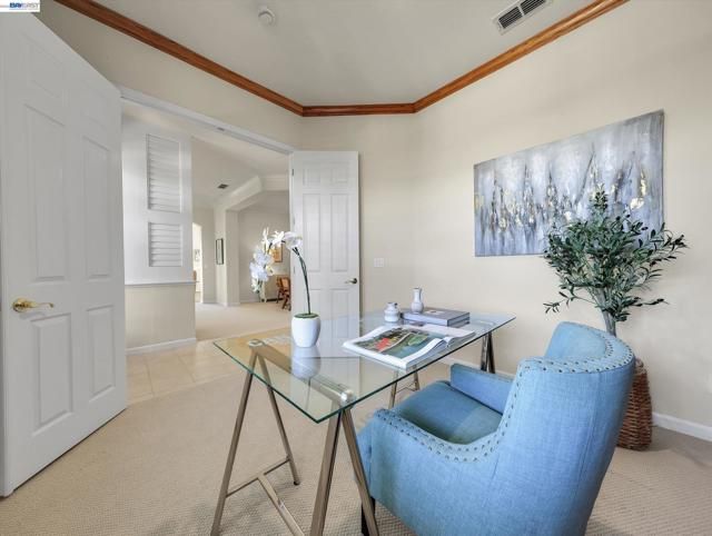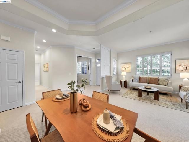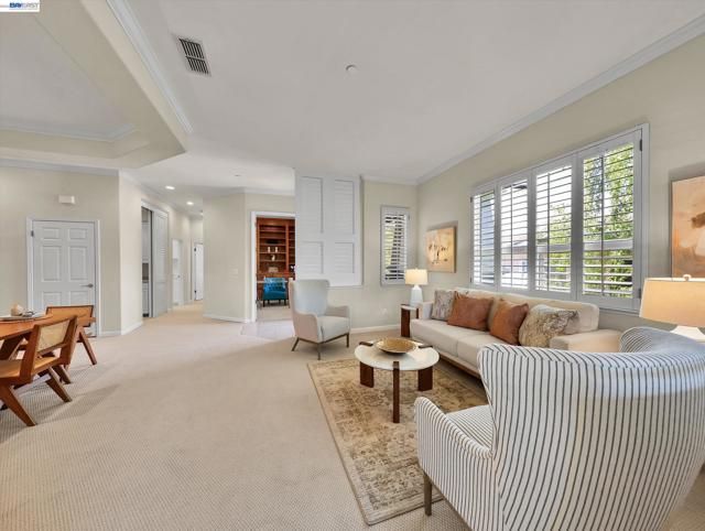 Perched in the highly sought-after Eagle Ridge enclave of Rossmoor, this exceptional Bay Model offers sweeping valley and canyon views, privacy, and highly desirable single-level living once inside. With approximately 2,058 sq ft, this upper-level home features 2 bedrooms, 2 baths, and a beautifully appointed study/library with custom built-in wood bookcases that add warmth and character. Soaring ceilings and expansive windows fill the home with natural light, creating a bright and airy feel throughout. The living room and dining room combination provides an open and elegant space ideal for entertaining, while the kitchen and family room combo offers a more relaxed setting with a wood-burning fireplace, newly refurbished hardwood floors, and stunning views from both rooms. A charming café area in the kitchen is perfect for morning coffee or a quiet start to the day. The spacious primary suite feels like a private retreat, featuring a large walk-in closet and direct access to an expansive deck shared with the kitchen. This outdoor space offers ample room for dining and lounging while enjoying peaceful views of the surrounding trees, valley, and canyon. Fresh interior paint and brand-new carpet provide a crisp, move-in ready feel. The kitchen and baths have been updated over the years and offer comfortable functionality today, with potential for further customization. Additional features include an attached one-car garage with interior access via a private staircase and chair lift for added convenience. Residents enjoy access to Rossmoor’s premier 55+ amenities, including golf, fitness center, pools, tennis, clubs, and 24-hour security. $18,000 one-time membership fee required.
