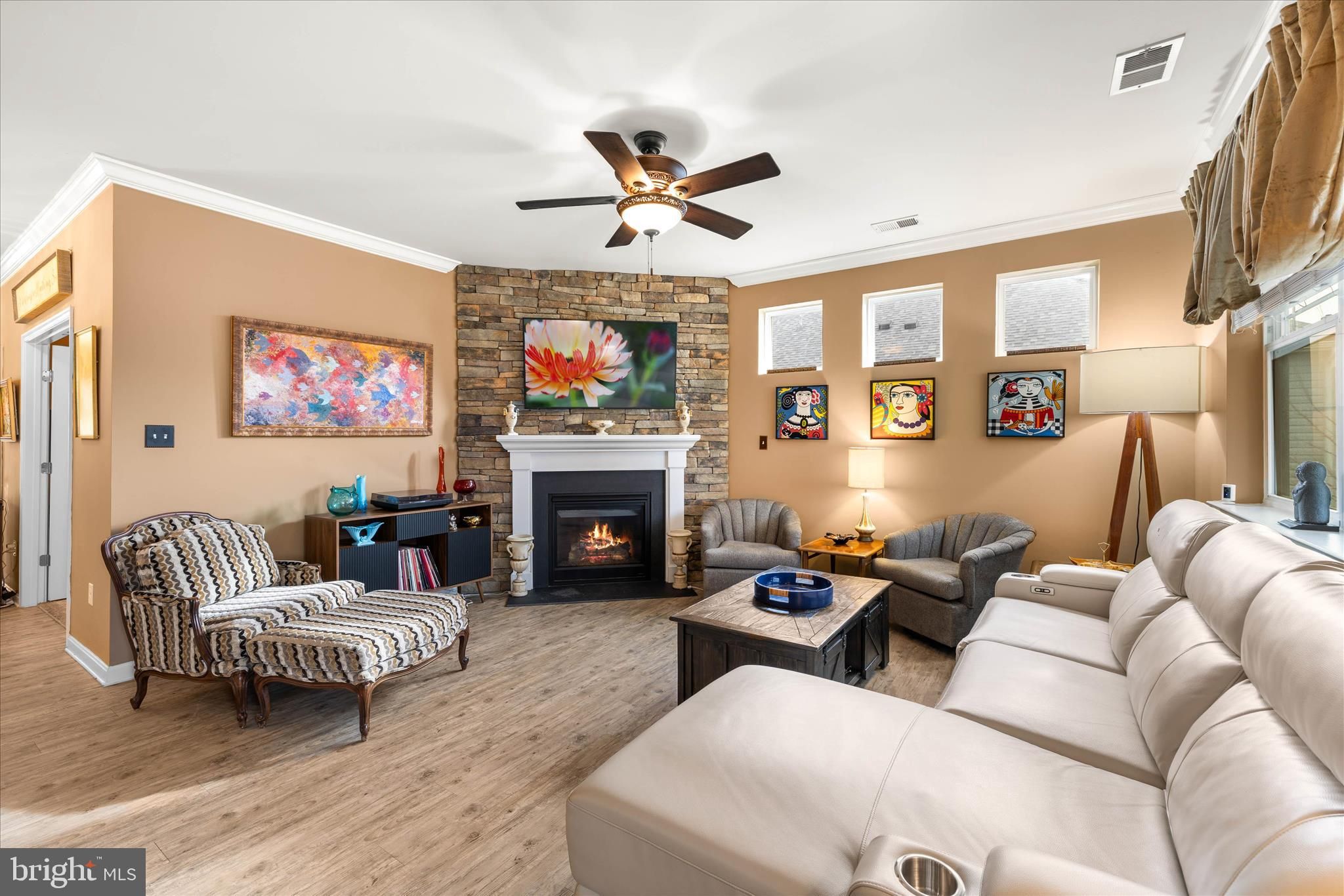 Welcome to this thoughtfully designed home in the Windstone community — offering the comfort, style, and amenities buyers want, just minutes from Lewes at a more attainable price point. A welcoming covered front porch sets the tone as you step inside to a bright, open-concept layout designed for easy living and entertaining. Crown molding throughout adds a refined architectural touch, while abundant natural light enhances the home’s relaxed coastal feel. The kitchen serves as the heart of the home, featuring a spacious center island with fieldstone accents, quartz countertops, stainless steel appliances, 42-inch cabinetry, a pantry, and generous workspace for everyday meals or hosting. The adjacent dining area is filled with natural light and opens to a screened porch — ideal for enjoying morning coffee or evening breezes. The family room offers a comfortable gathering space, anchored by a floor-to-ceiling fieldstone fireplace with a traditional mantle and accented by recessed lighting and large windows. The private primary suite provides a peaceful retreat, complete with brand-new carpeting, a walk-in closet with direct access to the laundry room, and an en-suite bath featuring ceramic tile flooring, dual vanities, and a walk-in shower. Two additional bedrooms and a full hall bath offer flexibility for guests, hobbies, or a home office. Outside, the fully fenced and landscaped backyard includes a patio perfect for grilling or relaxing, while the two-car garage with epoxy flooring adds both function and durability. Windstone residents enjoy low-maintenance living with resort-style amenities, including a clubhouse, fitness center, and community pool. Conveniently located just off Route 1, this home offers quick access to historic Lewes, Delaware beaches, shopping, dining, and major Sussex County employment centers — making it an excellent option for buyers seeking coastal proximity without Lewes pricing.