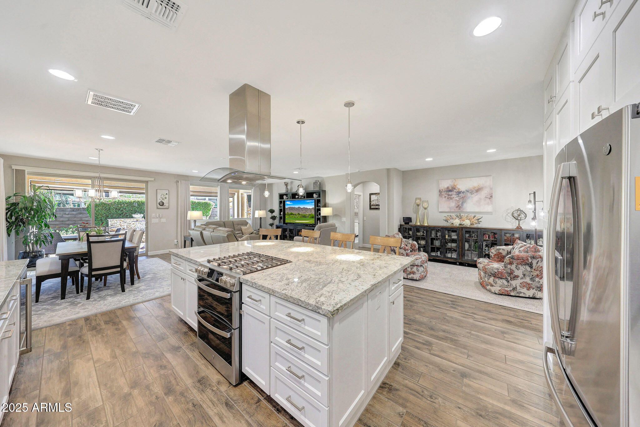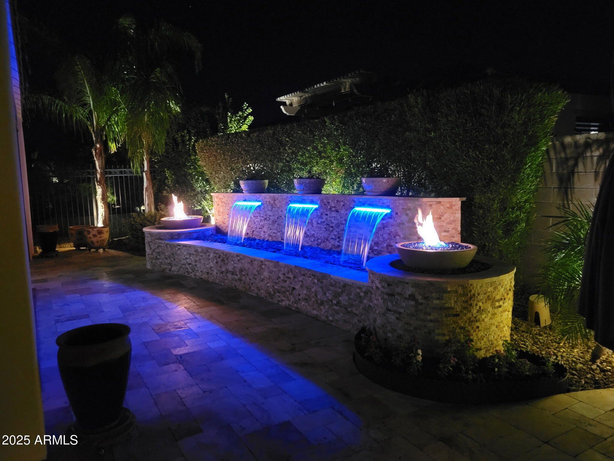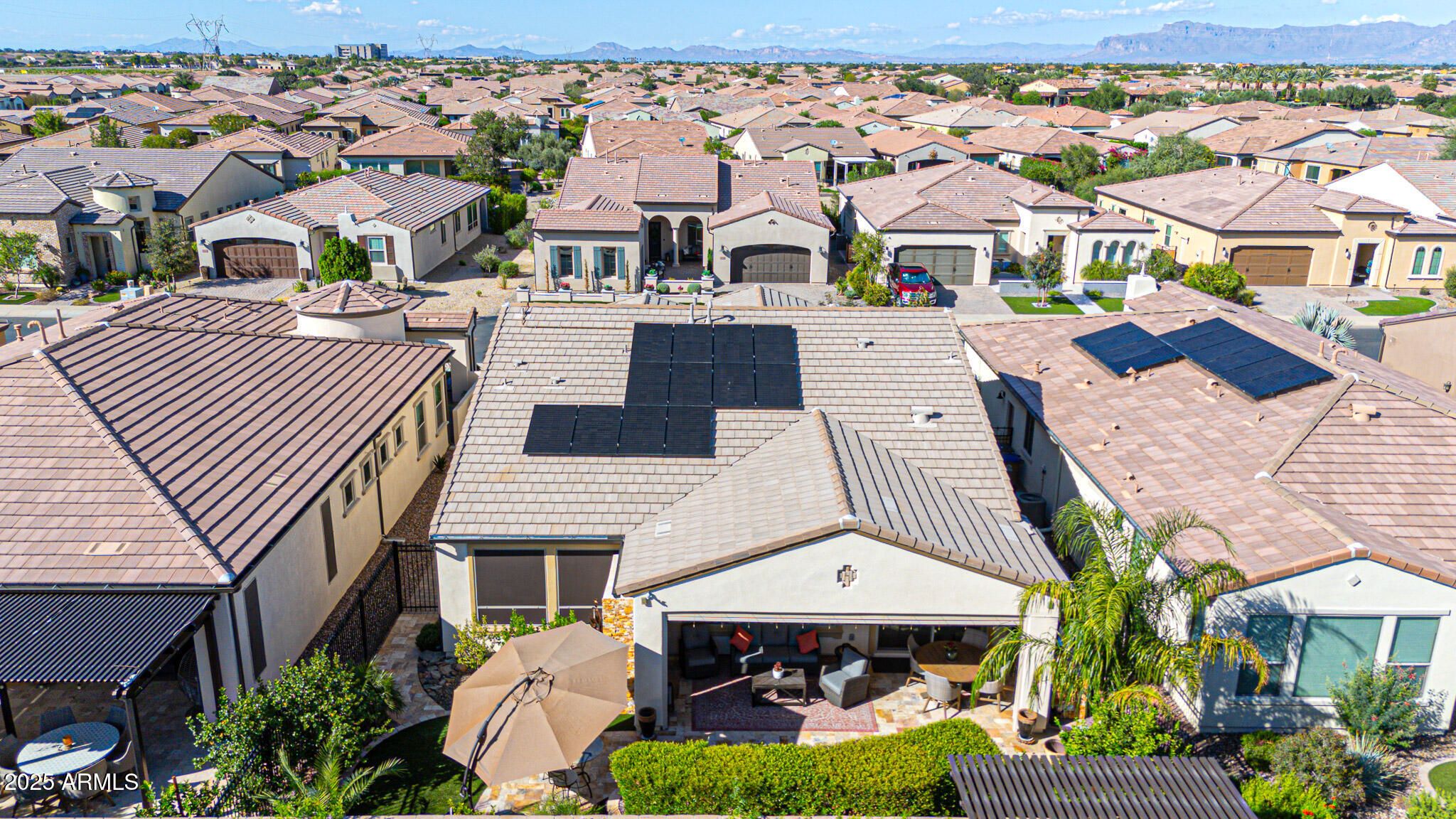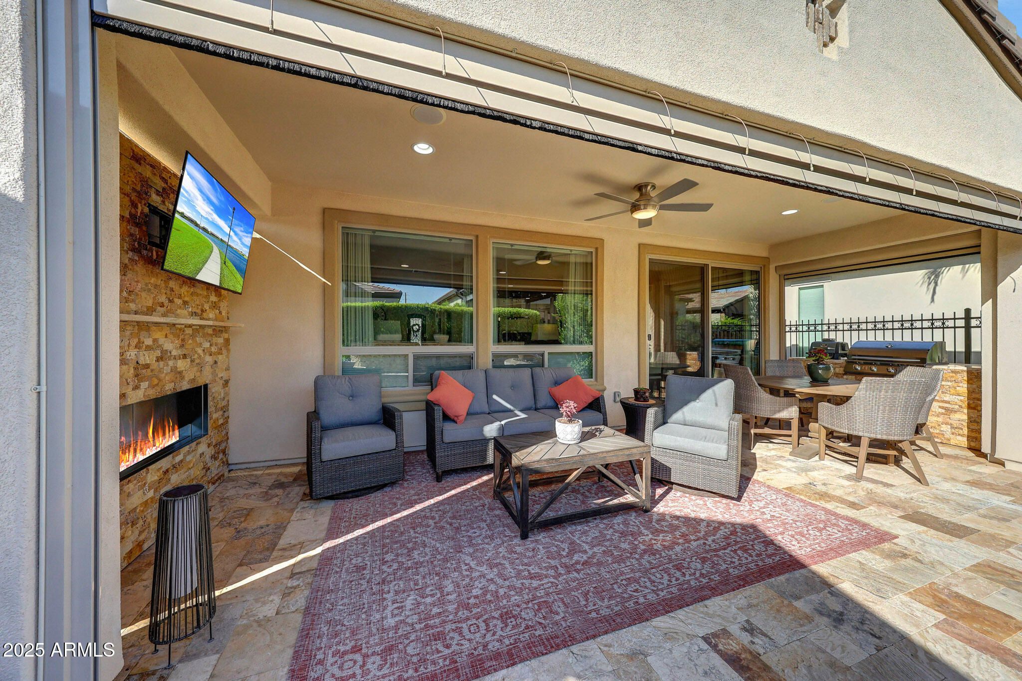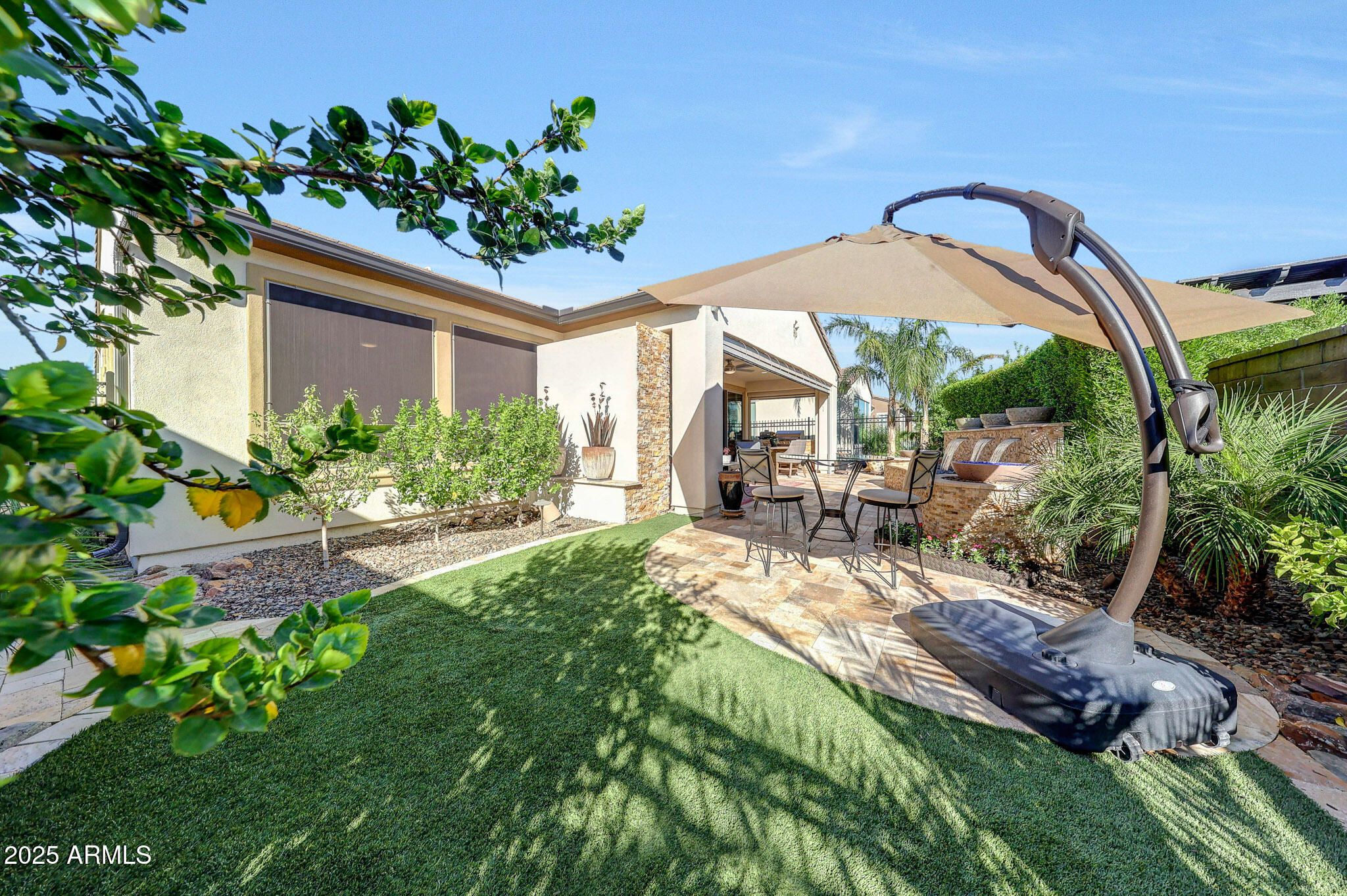 Welcome to a rare and beautifully upgraded single-level home in the highly sought-after Encanterra community. From the moment you arrive, the impressive iron front door and meticulous front landscaping set the tone for the quality and detail inside. The open layout is anchored by a chef's kitchen featuring a massive island, gas cooking, under-cabinet lighting, and updated cabinetry extended to the ceiling. Tile-look flooring runs throughout, paired with canned lighting and built-in surround sound for a warm yet modern feel. Both bathrooms showcase upgraded tile showers and glass doors, while the spacious laundry room offers additional function and storage. A true rarity, this floorplan also includes 248 square feet of attic storage, giving you space most Encanterra homes don't provide. Outdoors, the backyard is an entertainer's dream with remote-controlled patio shades, a fireplace, built-in BBQ, water and fire features, and multiple sitting areas designed for year-round enjoyment. The fenced yard adds privacy and functionality, while solar panels and a whole-home surge protector bring efficiency and peace of mind. The garage is finished to perfection with custom cabinetry, built-ins, epoxy flooring, a mini-split for climate control, insulation, and a convenient service door. Oh and did I mention there is a Choice Home Warranty until August 2029 for peace of mind! Life at Encanterra means enjoying resort-style amenities every day. Residents have access to the 60,000-square-foot La Casa Clubhouse with dining, fitness, spa, pools, and social spaces, as well as The Algarve clubhouse with its own resort pool, event lawn, and bar. The community also offers a private Tom Lehman-designed golf course, tennis and pickleball courts, bocce, miles of walking trails, and a full calendar of social clubs and events. Located in the heart of Queen Creek, Encanterra combines luxury, convenience, and community - the perfect place to make home.