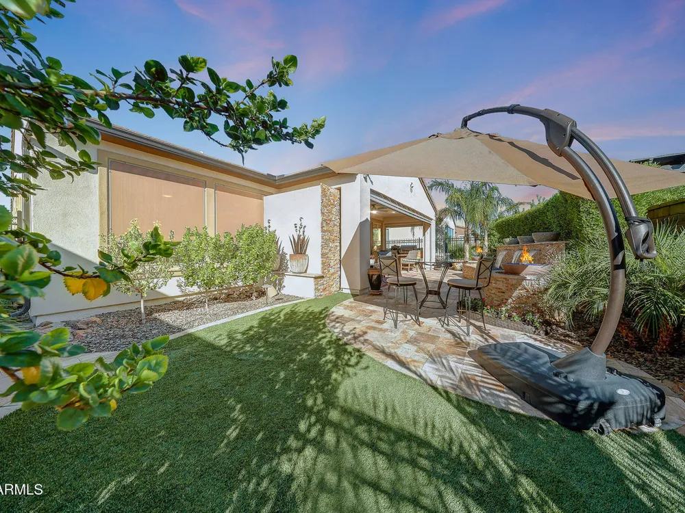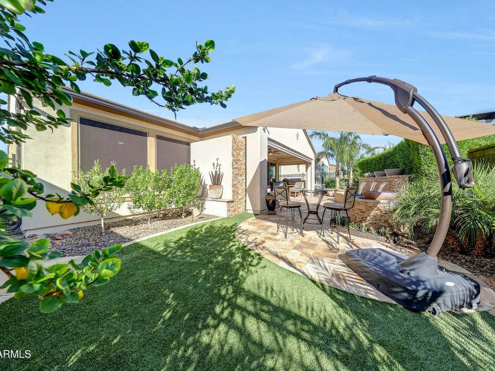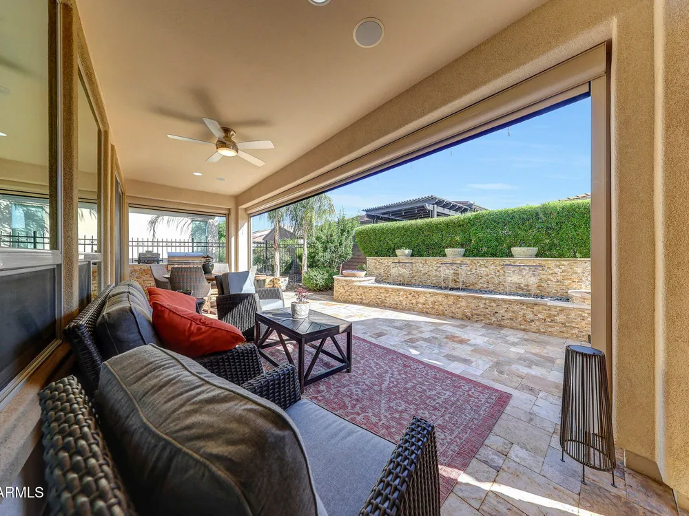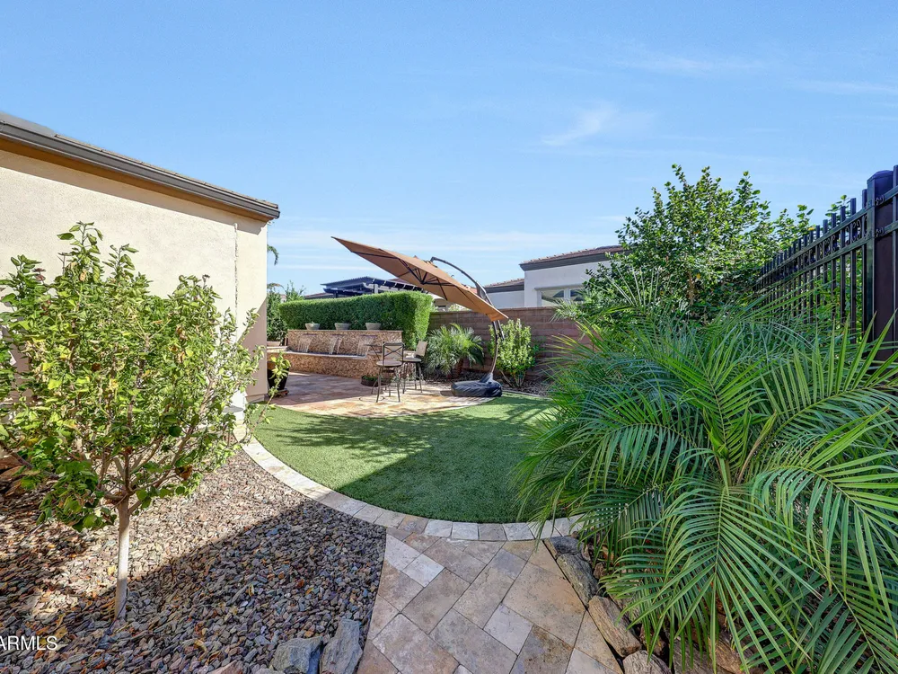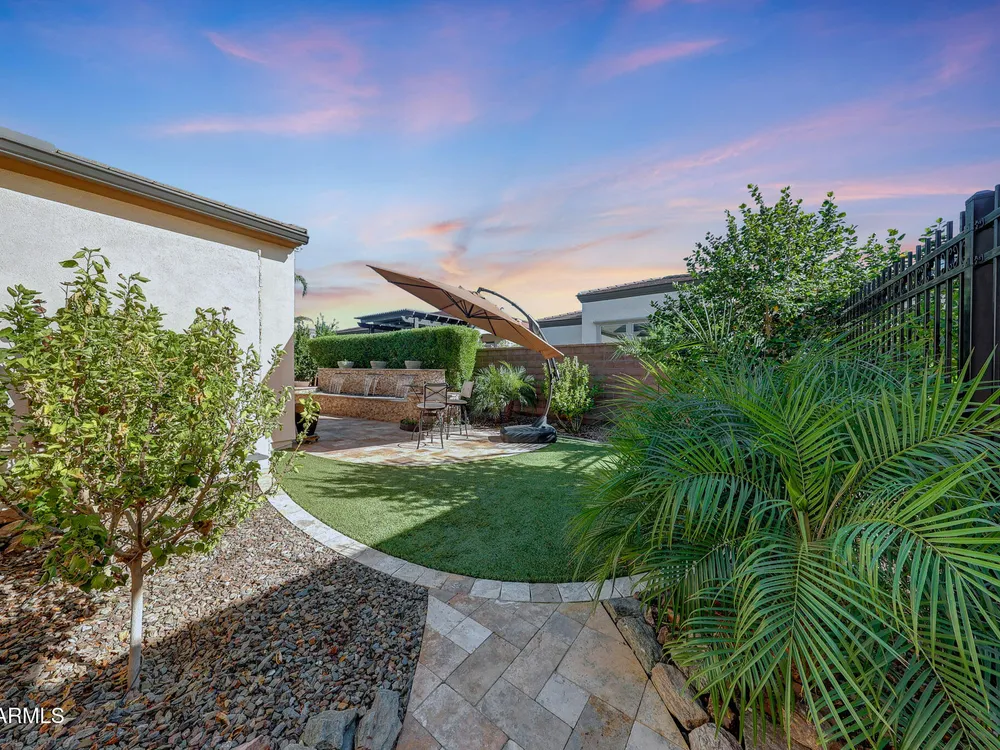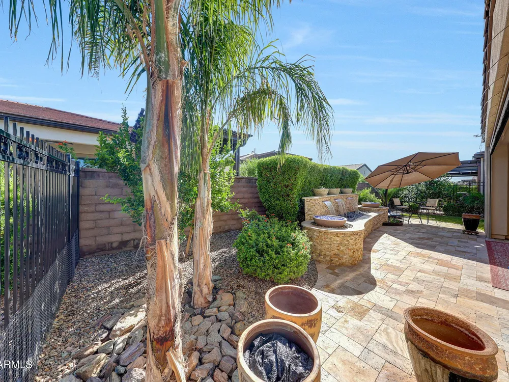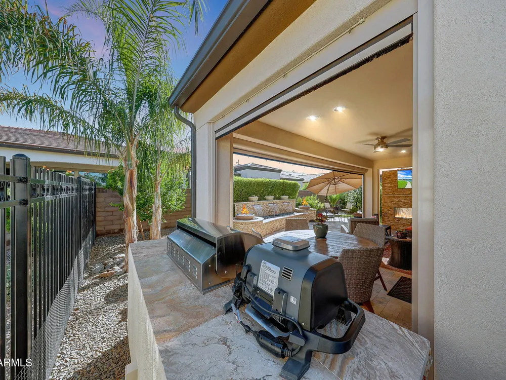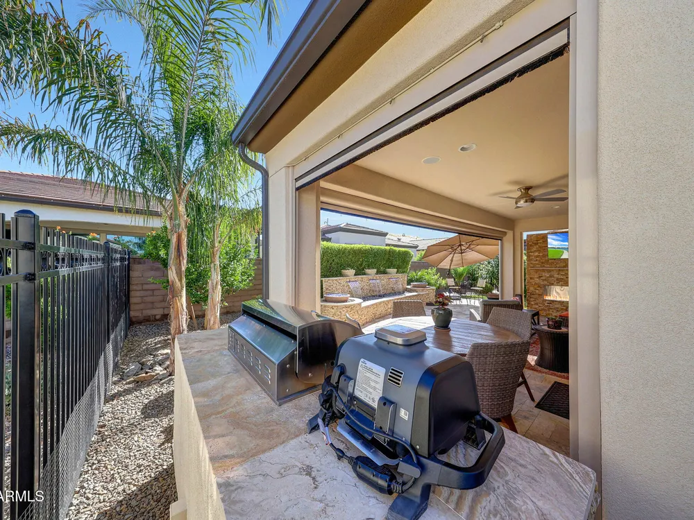 Welcome to a rare and beautifully upgraded single-level home in the highly sought-after Encanterra community. From the moment you arrive, the impressive iron front door and meticulous front landscaping set the tone for the quality and detail inside. The open layout is anchored by a chef's kitchen featuring a massive island, gas cooking, under-cabinet lighting, and updated cabinetry extended to the ceiling. Tile-look flooring runs throughout, paired with canned lighting and built-in surround sound for a warm yet modern feel. Both bathrooms showcase upgraded tile showers and glass doors, while the spacious laundry room offers additional function and storage. A true rarity, this floorplan also includes 248 square feet of attic storage, giving you space most Encanterra homes don't provide. Outdoors, the backyard is an entertainer's dream with remote-controlled patio shades, a fireplace, built-in BBQ, water and fire features, and multiple sitting areas designed for year-round enjoyment. The fenced yard adds privacy and functionality, while solar panels and a whole-home surge protector bring efficiency and peace of mind. The garage is finished to perfection with custom cabinetry, built-ins, epoxy flooring, a mini-split for climate control, insulation, and a convenient service door. Life at Encanterra means enjoying resort-style amenities every day. Residents have access to the 60,000-square-foot La Casa Clubhouse with dining, fitness, spa, pools, and social spaces, as well as The Algarve clubhouse with its own resort pool, event lawn, and bar. The community also offers a private Tom Lehman-designed golf course, tennis and pickleball courts, bocce, miles of walking trails, and a full calendar of social clubs and events. Located in the heart of Queen Creek, Encanterra combines luxury, convenience, and community the perfect place to make home.