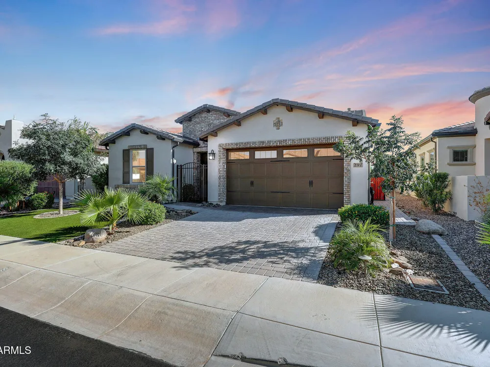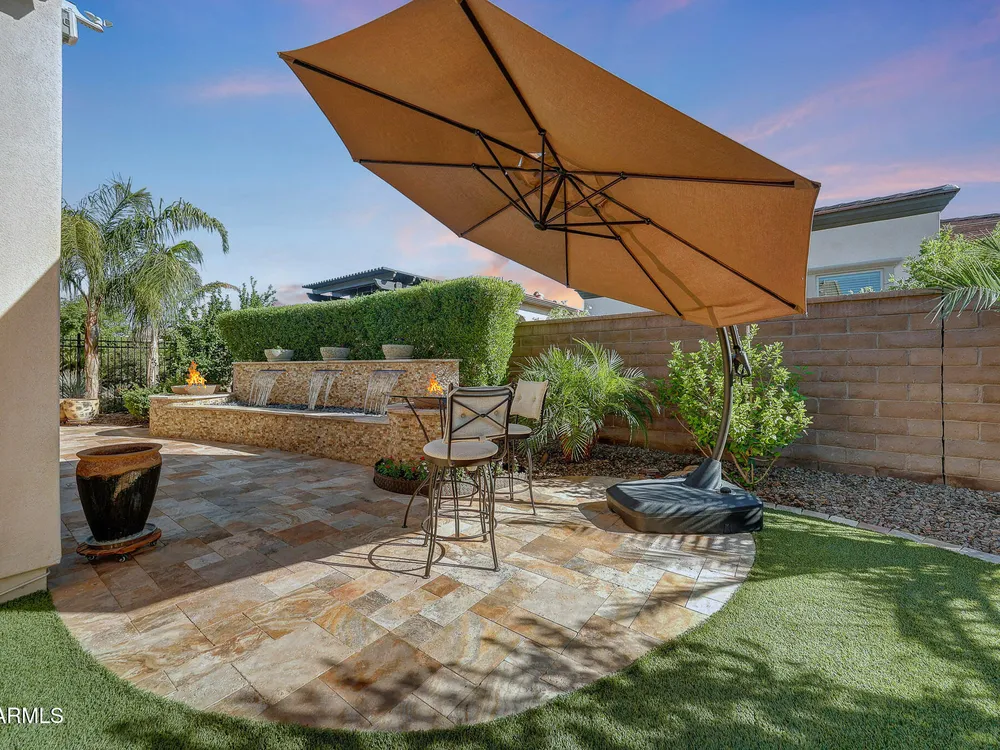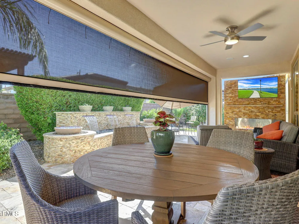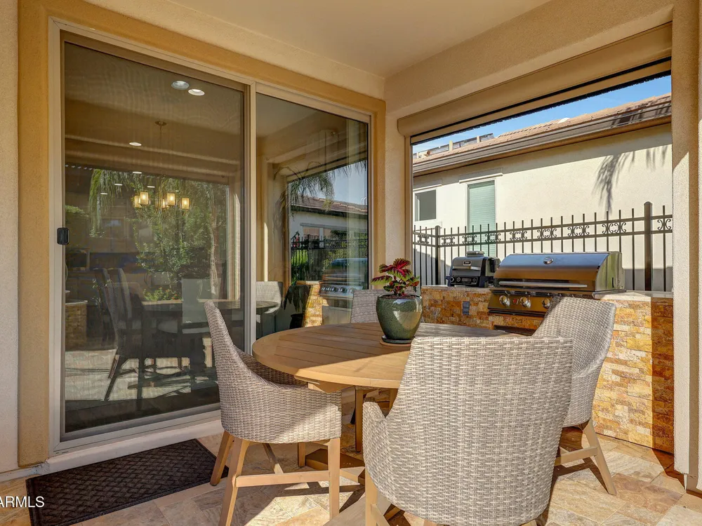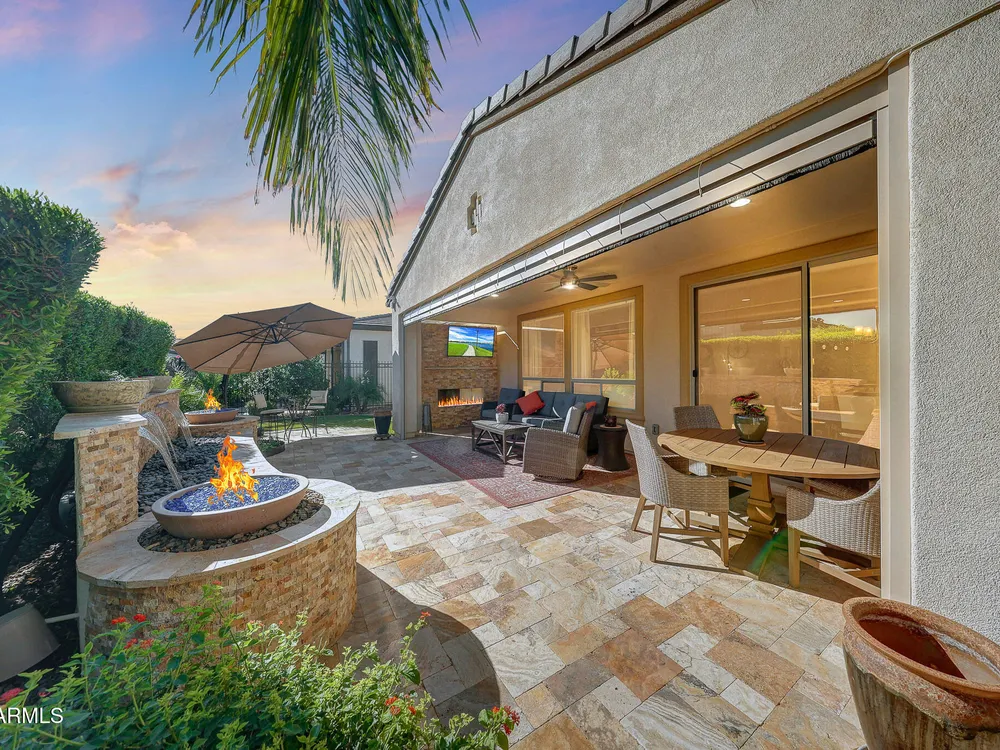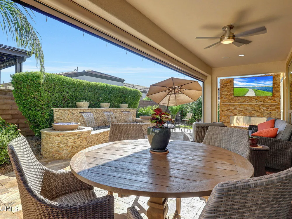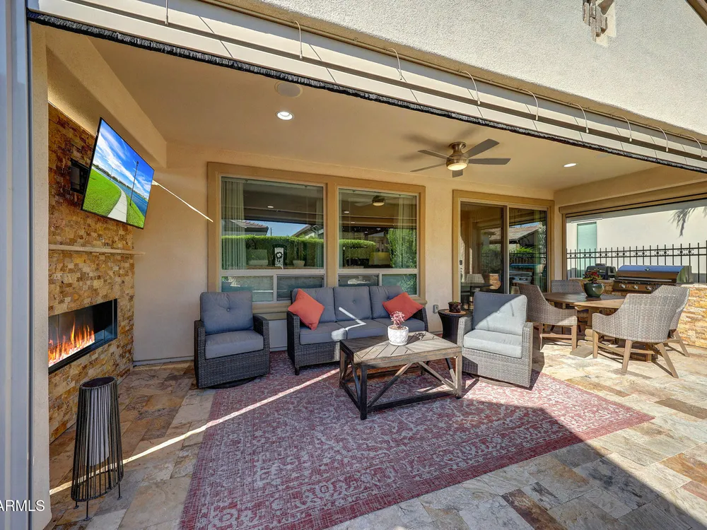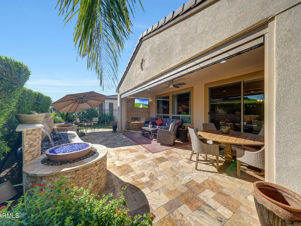 Welcome to a rare and beautifully upgraded single-level home in the highly sought-after Encanterra community. From the moment you arrive, the impressive iron front door and meticulous front landscaping set the tone for the quality and detail inside. The open layout is anchored by a chef's kitchen featuring a massive island, gas cooking, under-cabinet lighting, and updated cabinetry extended to the ceiling. Tile-look flooring runs throughout, paired with canned lighting and built-in surround sound for a warm yet modern feel. Both bathrooms showcase upgraded tile showers and glass doors, while the spacious laundry room offers additional function and storage. A true rarity, this floorplan also includes 248 square feet of attic storage, giving you space most Encanterra homes don't provide. Outdoors, the backyard is an entertainer's dream with remote-controlled patio shades, a fireplace, built-in BBQ, water and fire features, and multiple sitting areas designed for year-round enjoyment. The fenced yard adds privacy and functionality, while solar panels and a whole-home surge protector bring efficiency and peace of mind. The garage is finished to perfection with custom cabinetry, built-ins, epoxy flooring, a mini-split for climate control, insulation, and a convenient service door. Life at Encanterra means enjoying resort-style amenities every day. Residents have access to the 60,000-square-foot La Casa Clubhouse with dining, fitness, spa, pools, and social spaces, as well as The Algarve clubhouse with its own resort pool, event lawn, and bar. The community also offers a private Tom Lehman-designed golf course, tennis and pickleball courts, bocce, miles of walking trails, and a full calendar of social clubs and events. Located in the heart of Queen Creek, Encanterra combines luxury, convenience, and community the perfect place to make home.