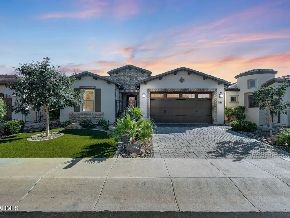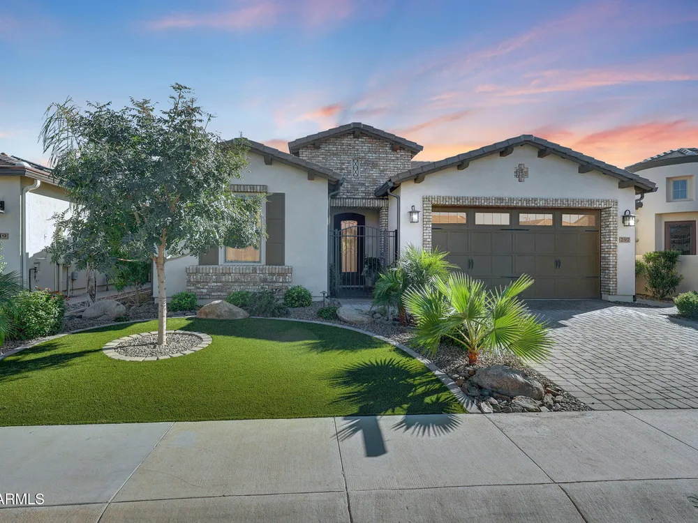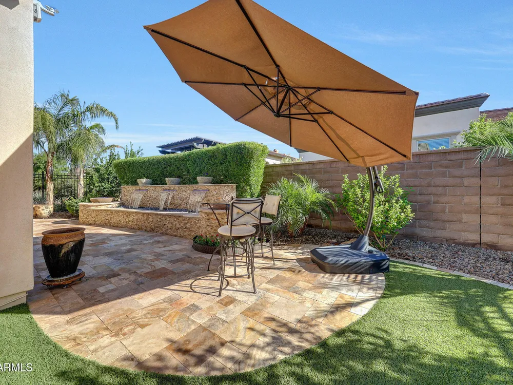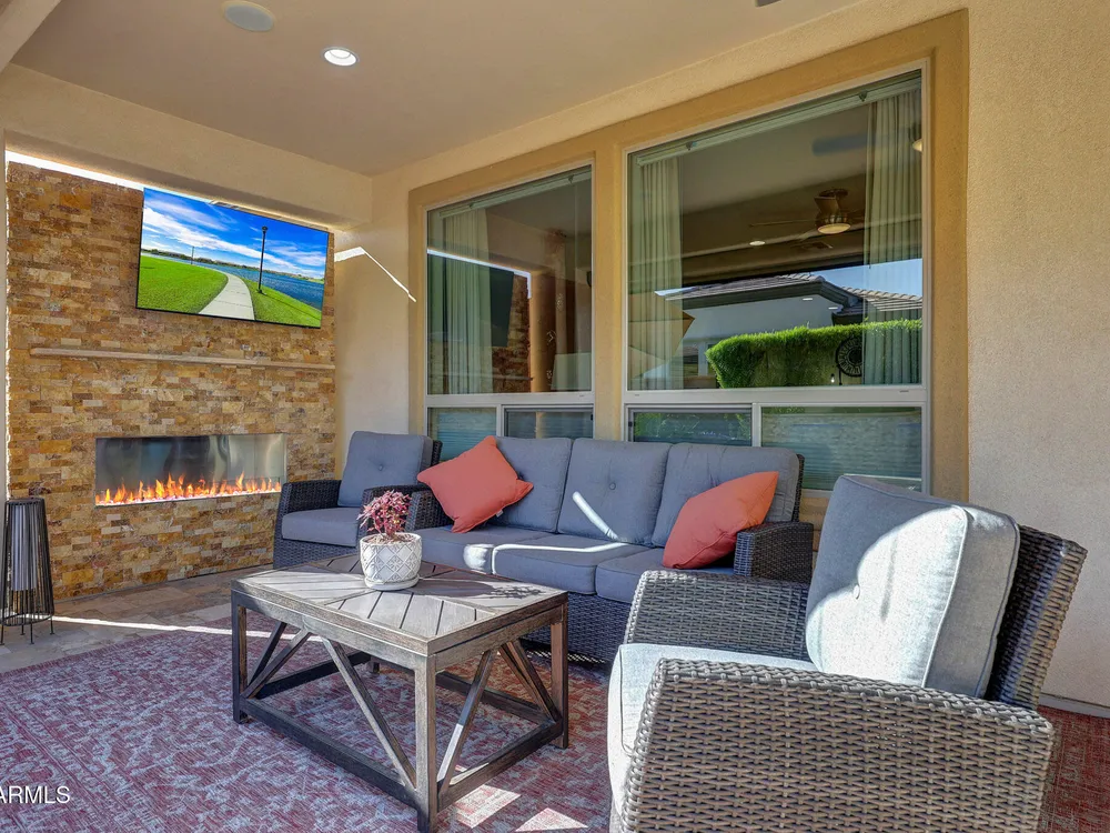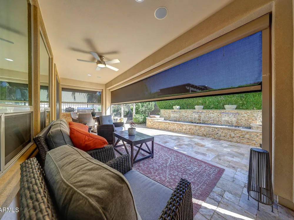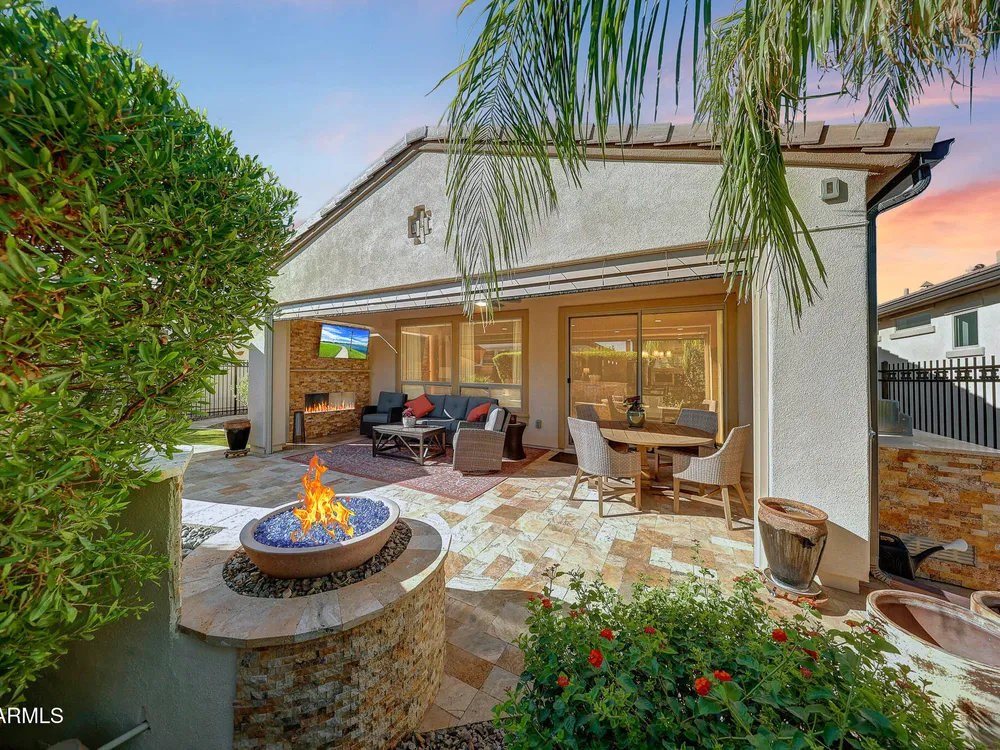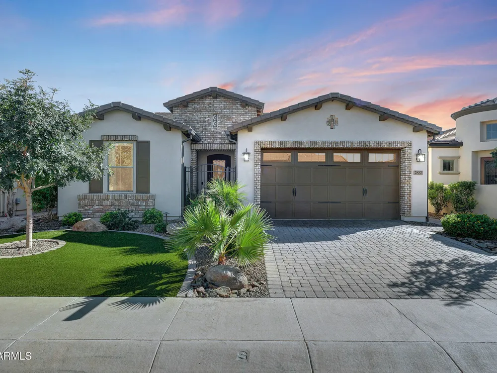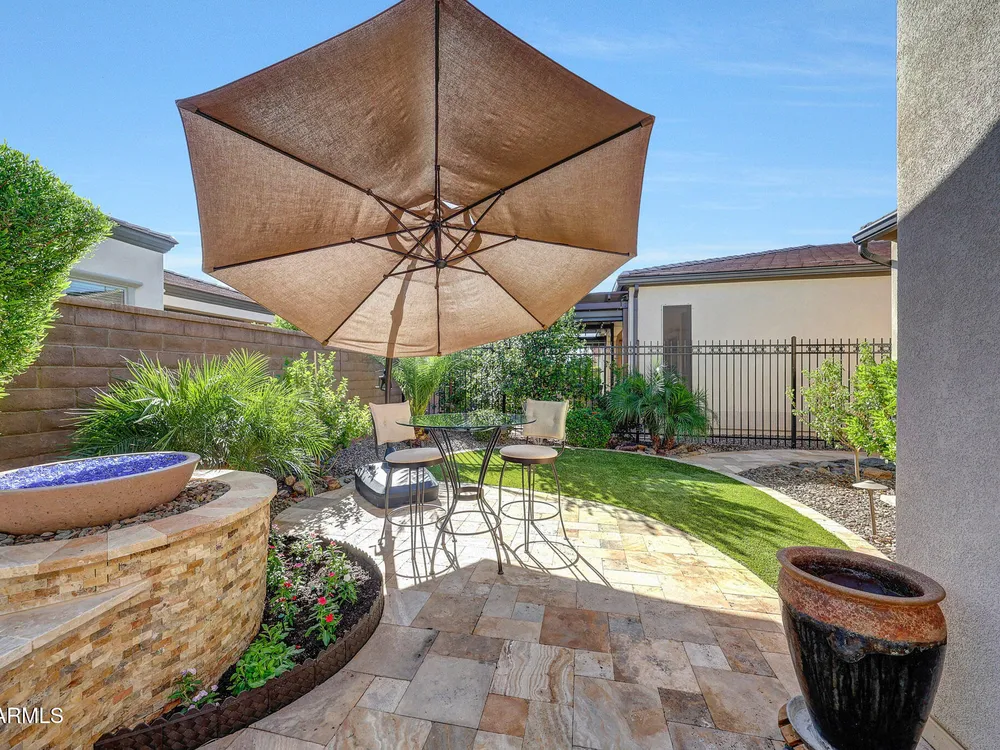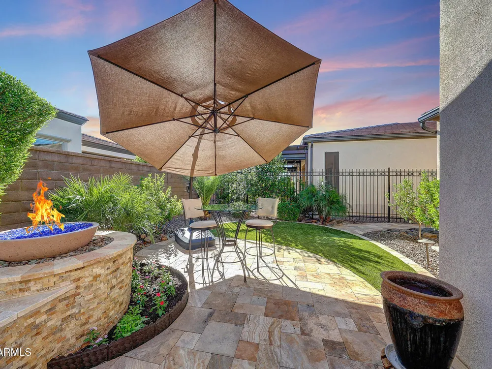 Welcome to a rare and beautifully upgraded single-level home in the highly sought-after Encanterra community. From the moment you arrive, the impressive iron front door and meticulous front landscaping set the tone for the quality and detail inside. The open layout is anchored by a chef's kitchen featuring a massive island, gas cooking, under-cabinet lighting, and updated cabinetry extended to the ceiling. Tile-look flooring runs throughout, paired with canned lighting and built-in surround sound for a warm yet modern feel. Both bathrooms showcase upgraded tile showers and glass doors, while the spacious laundry room offers additional function and storage. A true rarity, this floorplan also includes 248 square feet of attic storage, giving you space most Encanterra homes don't provide. Outdoors, the backyard is an entertainer's dream with remote-controlled patio shades, a fireplace, built-in BBQ, water and fire features, and multiple sitting areas designed for year-round enjoyment. The fenced yard adds privacy and functionality, while solar panels and a whole-home surge protector bring efficiency and peace of mind. The garage is finished to perfection with custom cabinetry, built-ins, epoxy flooring, a mini-split for climate control, insulation, and a convenient service door. Life at Encanterra means enjoying resort-style amenities every day. Residents have access to the 60,000-square-foot La Casa Clubhouse with dining, fitness, spa, pools, and social spaces, as well as The Algarve clubhouse with its own resort pool, event lawn, and bar. The community also offers a private Tom Lehman-designed golf course, tennis and pickleball courts, bocce, miles of walking trails, and a full calendar of social clubs and events. Located in the heart of Queen Creek, Encanterra combines luxury, convenience, and community the perfect place to make home.