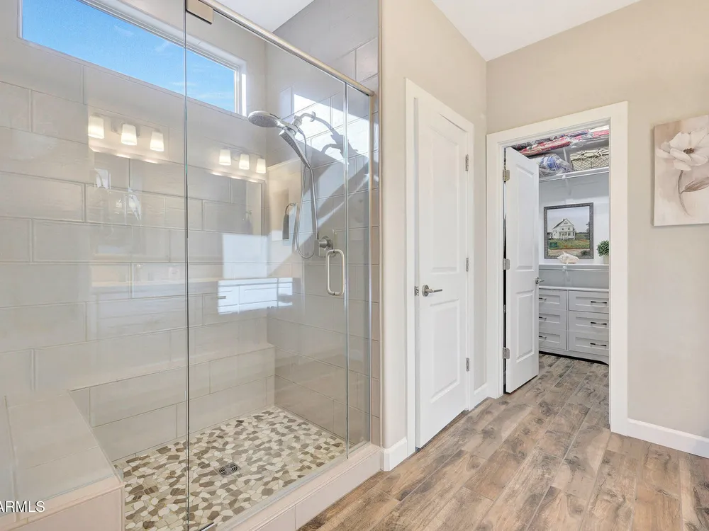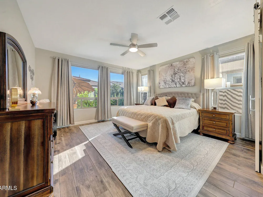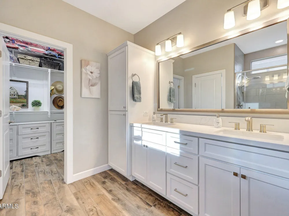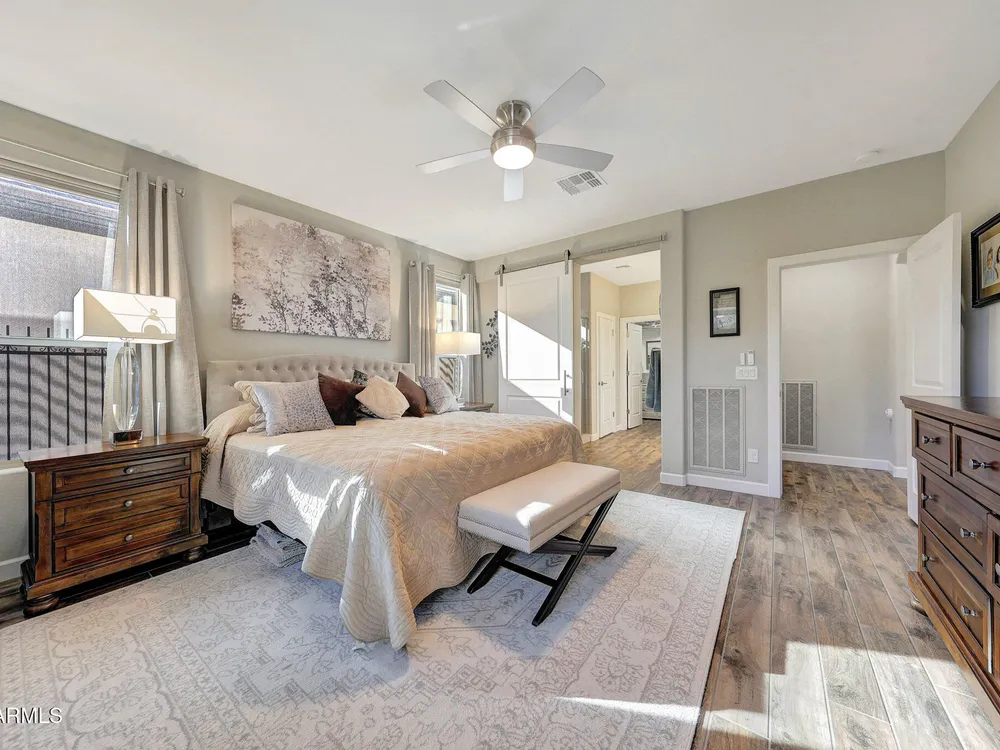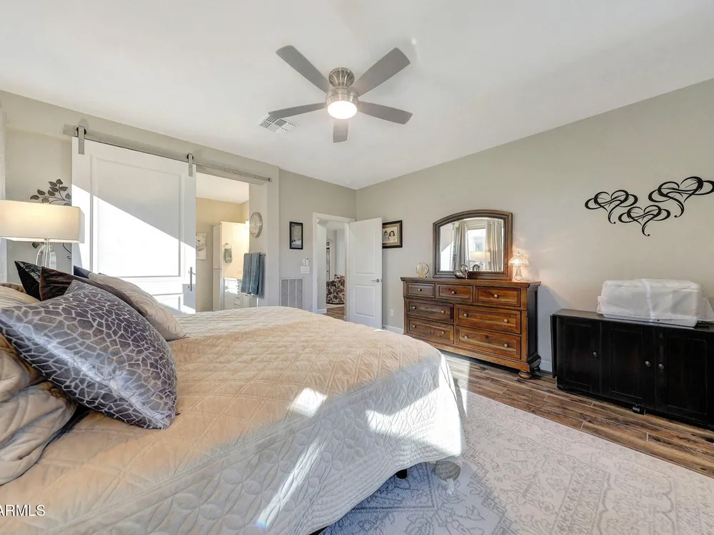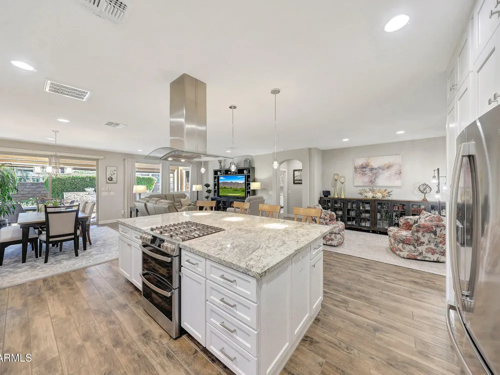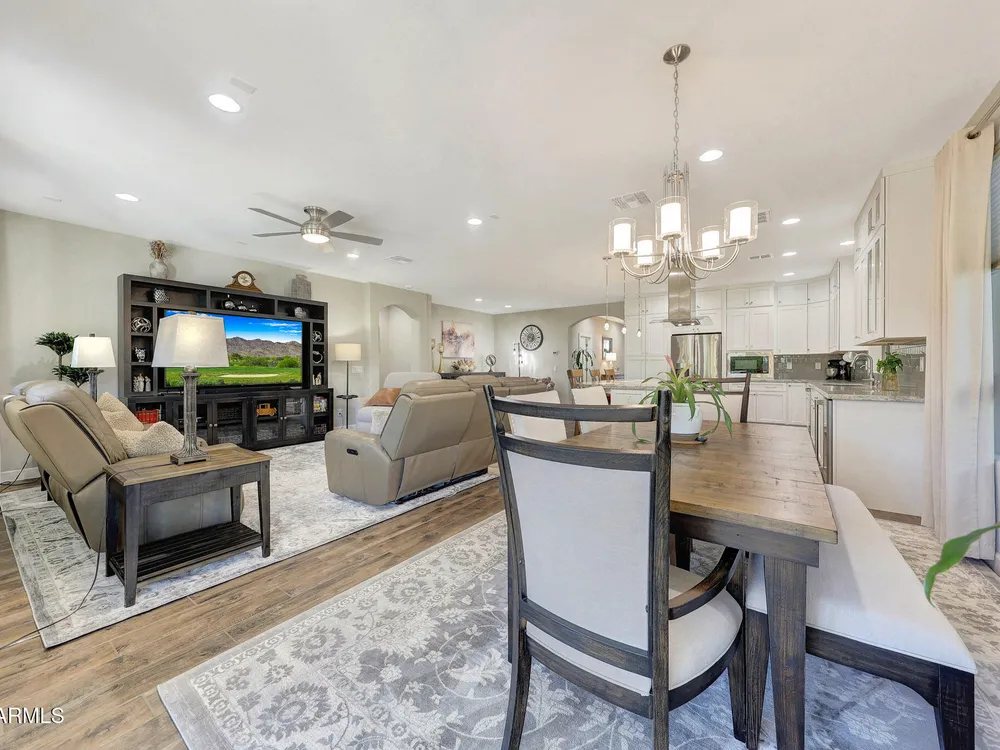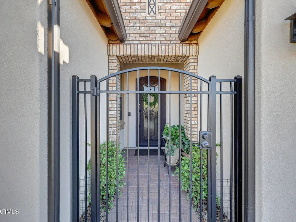 Welcome to a rare and beautifully upgraded single-level home in the highly sought-after Encanterra community. From the moment you arrive, the impressive iron front door and meticulous front landscaping set the tone for the quality and detail inside. The open layout is anchored by a chef's kitchen featuring a massive island, gas cooking, under-cabinet lighting, and updated cabinetry extended to the ceiling. Tile-look flooring runs throughout, paired with canned lighting and built-in surround sound for a warm yet modern feel. Both bathrooms showcase upgraded tile showers and glass doors, while the spacious laundry room offers additional function and storage. A true rarity, this floorplan also includes 248 square feet of attic storage, giving you space most Encanterra homes don't provide. Outdoors, the backyard is an entertainer's dream with remote-controlled patio shades, a fireplace, built-in BBQ, water and fire features, and multiple sitting areas designed for year-round enjoyment. The fenced yard adds privacy and functionality, while solar panels and a whole-home surge protector bring efficiency and peace of mind. The garage is finished to perfection with custom cabinetry, built-ins, epoxy flooring, a mini-split for climate control, insulation, and a convenient service door. Life at Encanterra means enjoying resort-style amenities every day. Residents have access to the 60,000-square-foot La Casa Clubhouse with dining, fitness, spa, pools, and social spaces, as well as The Algarve clubhouse with its own resort pool, event lawn, and bar. The community also offers a private Tom Lehman-designed golf course, tennis and pickleball courts, bocce, miles of walking trails, and a full calendar of social clubs and events. Located in the heart of Queen Creek, Encanterra combines luxury, convenience, and community the perfect place to make home.