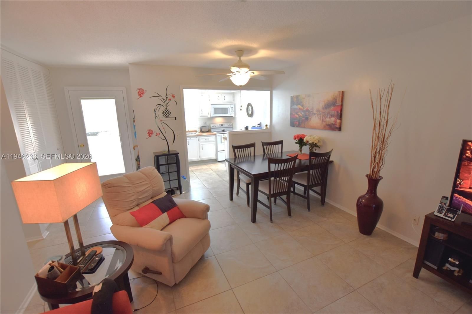 This 1/1.5 is sure to impress. Enjoy uniform ceramic tile flooring throughout, two updated bathrooms, new kitchen countertop with dishwasher and disposal. The kitchen wall has been opened up and more cabinets added. The roof is less than two years old; both the AC and water heater are newer. Move-in ready and tastefully furnished, with low HOA dues covering water, basic cable, and internet. Impact glass windows and a patio with a roll-down shutter system add extra peace of mind. Screened in patio and an additional patio behind with a perfect spot for grilling and simply hanging out.