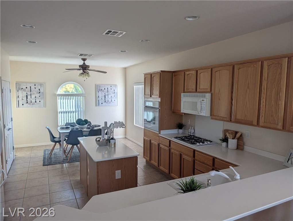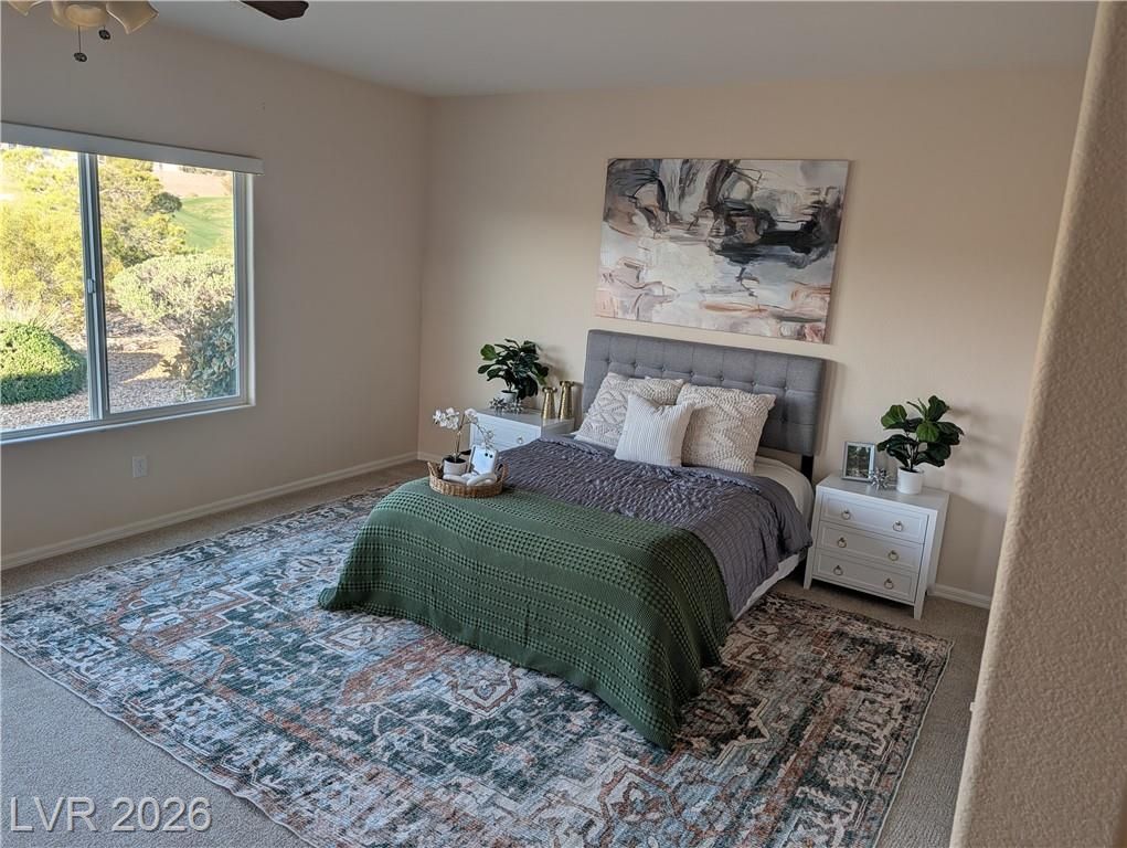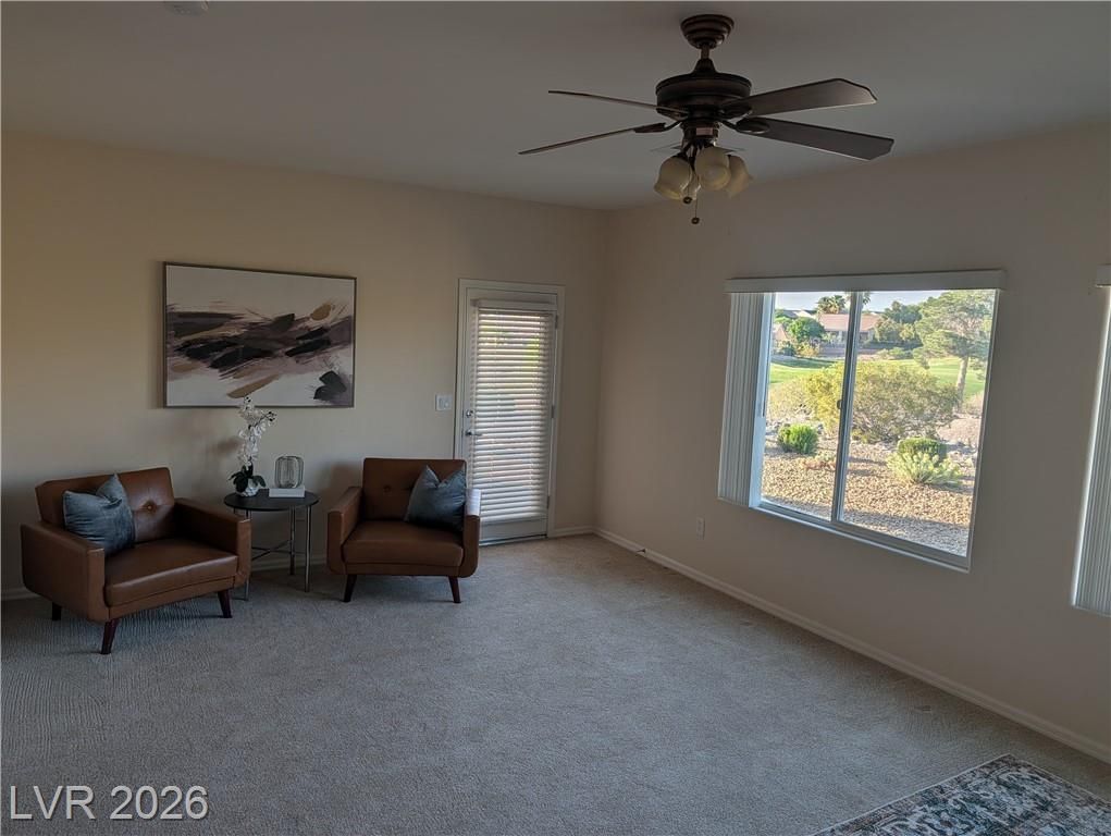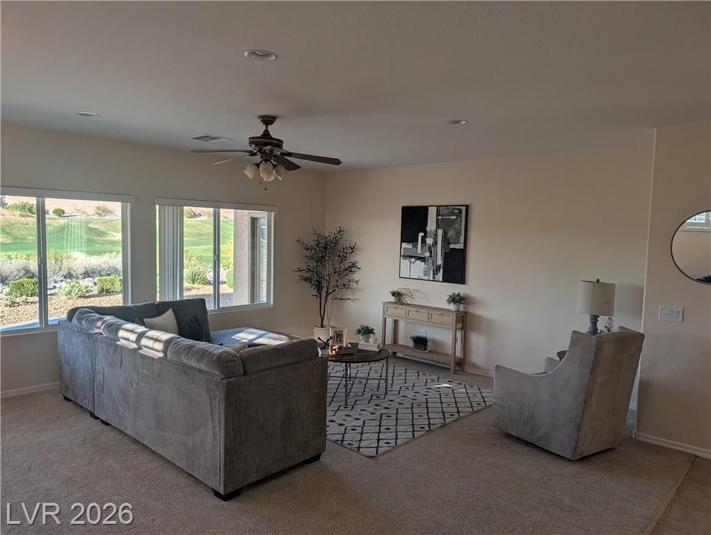 Rare opportunity to enjoy the 55+ lifestyle in this Lincoln model home in Sun City Anthem. Located on desirable golf course frontage, this well-maintained single-story home offers 2,096 sq ft with 2 bedrooms, 2 baths, and a versatile den.Perfectly positioned on the 14th hole of the Concord Course at Revere Golf Club, with golf course and mountain views from the shaded north-facing covered patio, allowing comfortable outdoor living. Enjoy expansive fairway views with no rear neighbors directly behind the property.The open floor plan includes bright living and dining areas and an eat-in kitchen with ample cabinetry and double-door pantry. The oversized primary suite features a walk-in closet and bath with dual sinks, soaking tub, walk-in shower, and separate toilet room. Residents enjoy Sun City Anthem amenities including clubhouses, fitness centers, pools, walking trails, and social activities, all near shopping, dining, and medical services.
