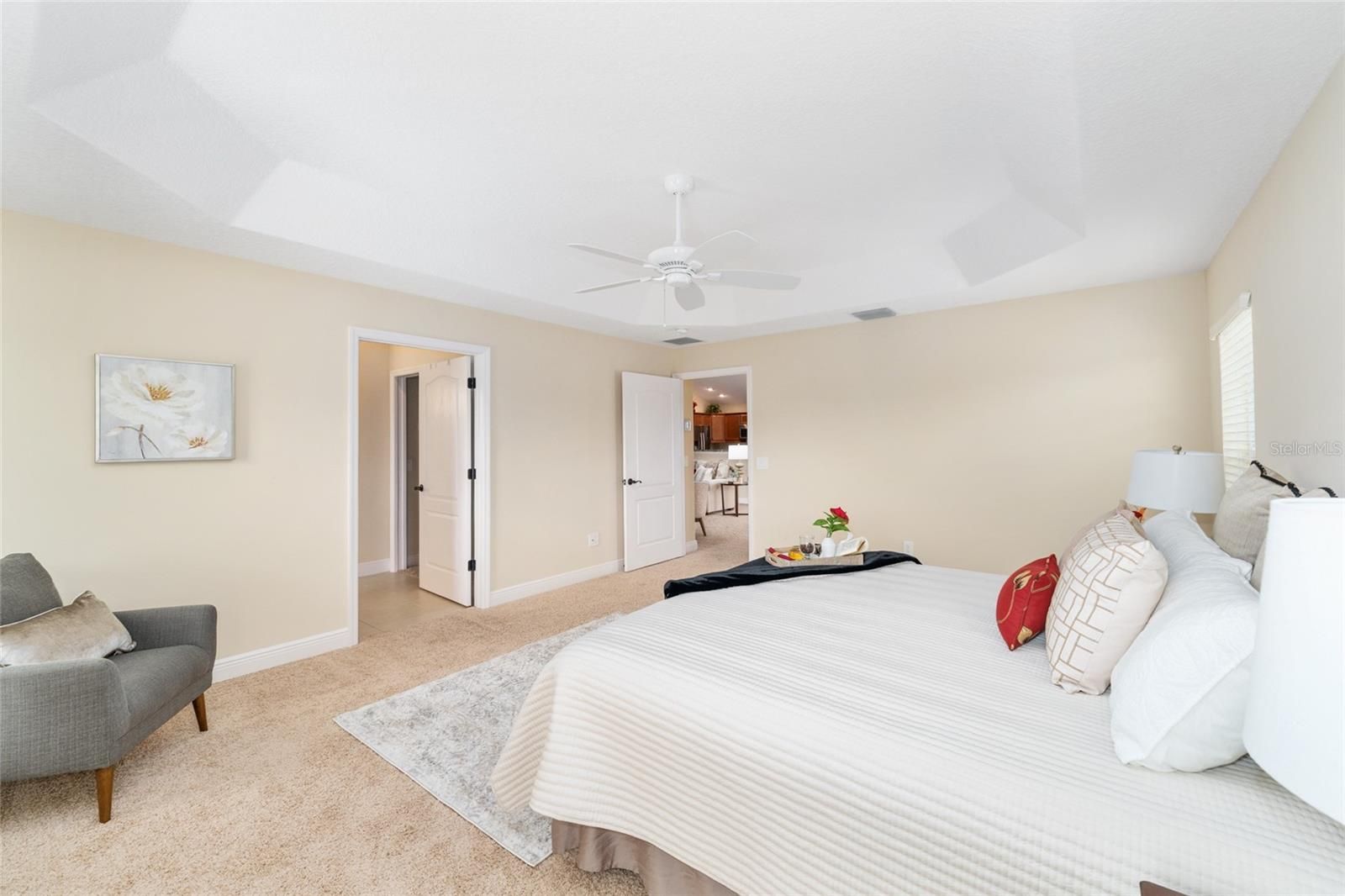 - Ceiling Fan(s), Eat-in Kitchen, High Ceilings, Kitchen/Family Room Combo, L-Shaped Dining Room, Open Floorplan, Solid Surface Counters, Solid-Wood Cabinets, Split Bedrooms, Thermostat, Tray Ceiling(s), Walk-In Closet(s)