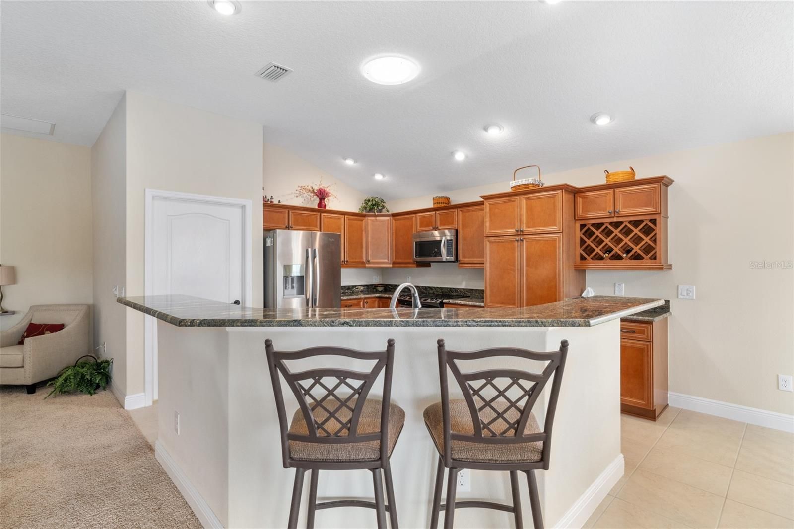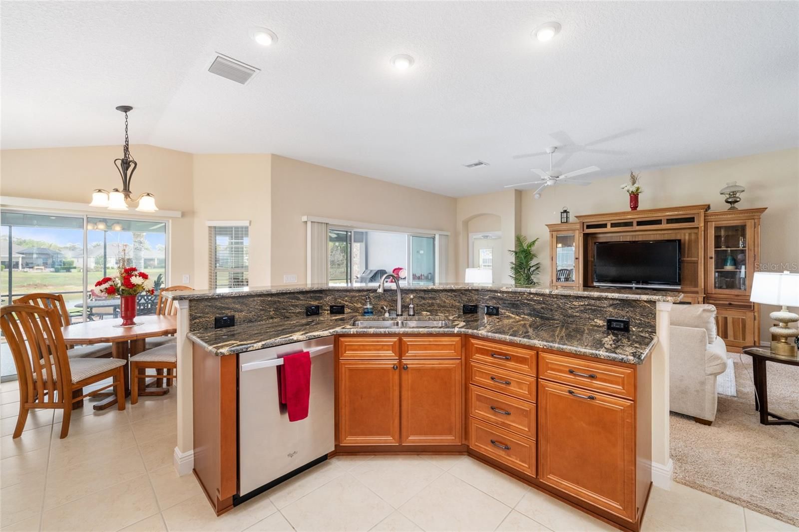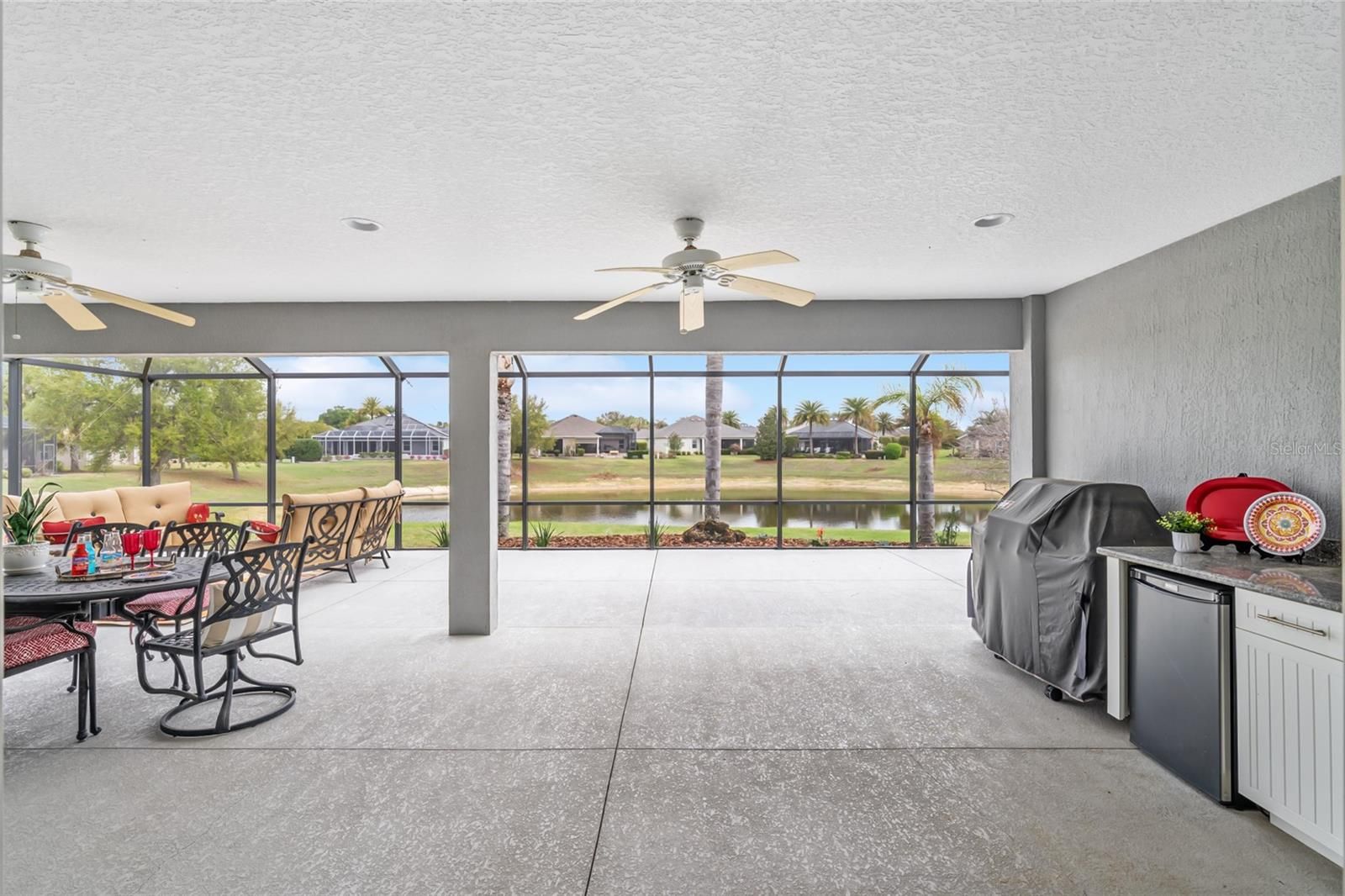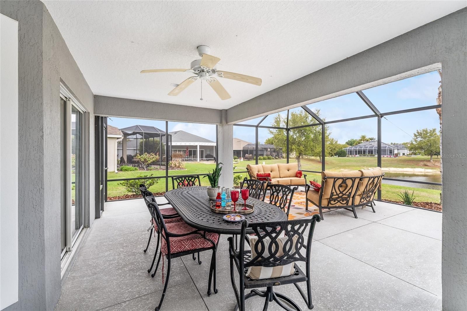 STUNNING WATER VIEW | LILY MODEL | 3 BEDROOMS | 2-CAR + GOLF CART GARAGE | VILLAGE OF GILCHRIST Welcome to this beautiful 3-BEDROOM, 2-BATH LILY MODEL in the highly desirable VILLAGE OF GILCHRIST, offering a TWO-CAR GARAGE PLUS GOLF CART GARAGE and BREATHTAKING WATER VIEWS. Step inside to an OPEN, LIGHT-FILLED FLOOR PLAN designed for comfortable living and effortless entertaining. The home features HIGH CEILINGS, a SOLAR TUBE FOR NATURAL LIGHT, and an inviting living area that flows seamlessly to the EXTENDED LANAI and tranquil POND VIEWS beyond. The kitchen and wet areas feature LIGHT TILE FLOORING, complemented by GRANITE COUNTERTOPS, a BREAKFAST BAR, and ABUNDANT CABINETRY including beautiful cabinets and a BUILT-IN WINE BAR—perfect for hosting friends and family. Enjoy your morning coffee in the bright KITCHEN NOOK OVERLOOKING THE LANAI AND WATER, creating a peaceful start to every day. The PRIMARY SUITE is spacious and airy, featuring TRAY CEILINGS and FOUR LARGE WINDOWS that fill the room with Florida sunshine. The PRIMARY BATH includes DUAL GRANITE VANITIES, an ELEGANT TILED WALK-IN SHOWER, and a CUSTOM WALK-IN CLOSET with ample shelving and storage. Two additional bedrooms are GENEROUSELY SIZED with HIGH CEILINGS and plenty of natural light, and the nearby GUEST BATHROOM features TILE FLOORING and GRANITE COUNTERTOPS. A convenient POCKET DOOR CREATES A PRIVATE GUEST SUITE AREA, ideal when hosting visitors. The true highlight of this home is the SPECTACULAR EXTENDED LANAI. Fully screened and stretching the FULL WIDTH OF THE HOME, this outdoor retreat offers STUNNING PANORAMIC POND VIEWS and multiple seating areas to relax and enjoy the FLORIDA LIFESTYLE. The lanai also features a GRANITE WET BAR WITH SINK, UNDER-COUNTER REFRIGERATOR, along with a WEBER GRILL, making it the perfect space for OUTDOOR DINING AND ENTERTAINING. Additional features include: • FREEZER IN THE GARAGE CONVEYS • UTILITY SINK IN GARAGE • INSIDE LAUNDRY • WORKBENCH AND GARAGE CABINETS CONVEY • INSULATED GARAGE DOORS • HVAC REPLACED IN 2022 • NOVA FILTRATION SYSTEM IN GARAGE (RECENTLY SERVICED) • HOME IS PARTIALLY FURNISHED. Room for a POOL! Located just minutes from BROWNWOOD PADDOCK SQUARE (2 MILES) and LAKE SUMTER LANDING (4.5 MILES), this home is perfectly positioned in the HEART OF THE VILLAGES. Enjoy easy access to SHOPPING, DINING, GOLF, AND RECREATION, including nearby EVANS PRAIRIE COUNTRY CLUB and BONIFAY COUNTRY CLUB. This beautiful WATERFRONT HOME combines LOCATION, VIEWS, AND LIFESTYLE. Be sure to watch the VIDEO TOUR and schedule your PRIVATE SHOWING TODAY!