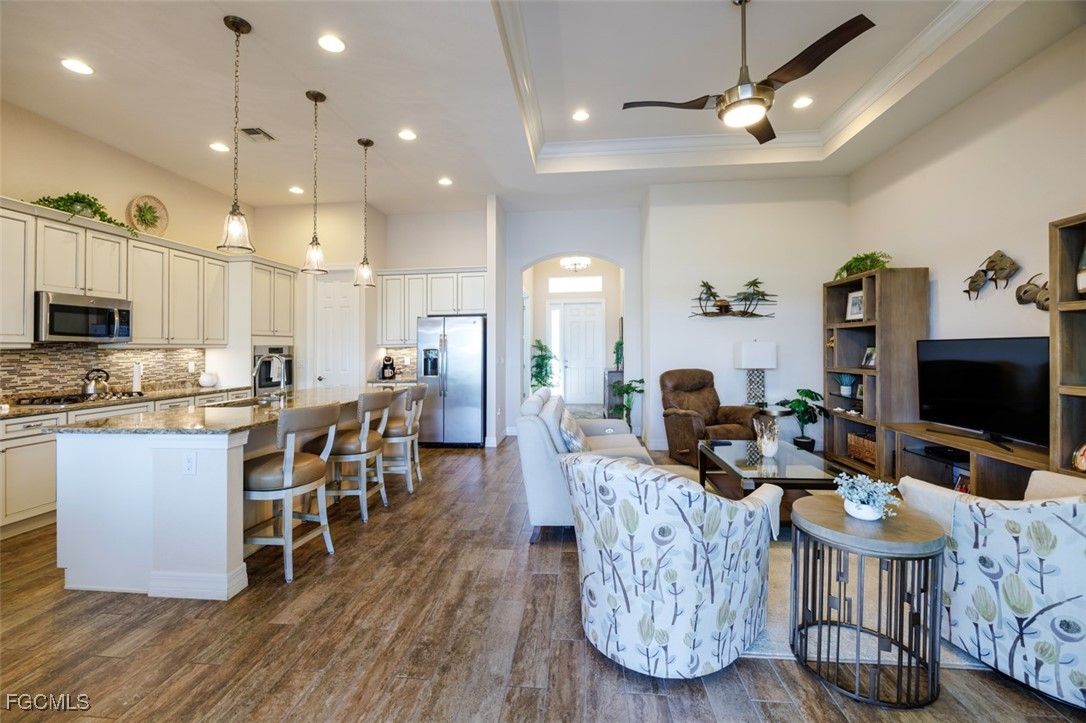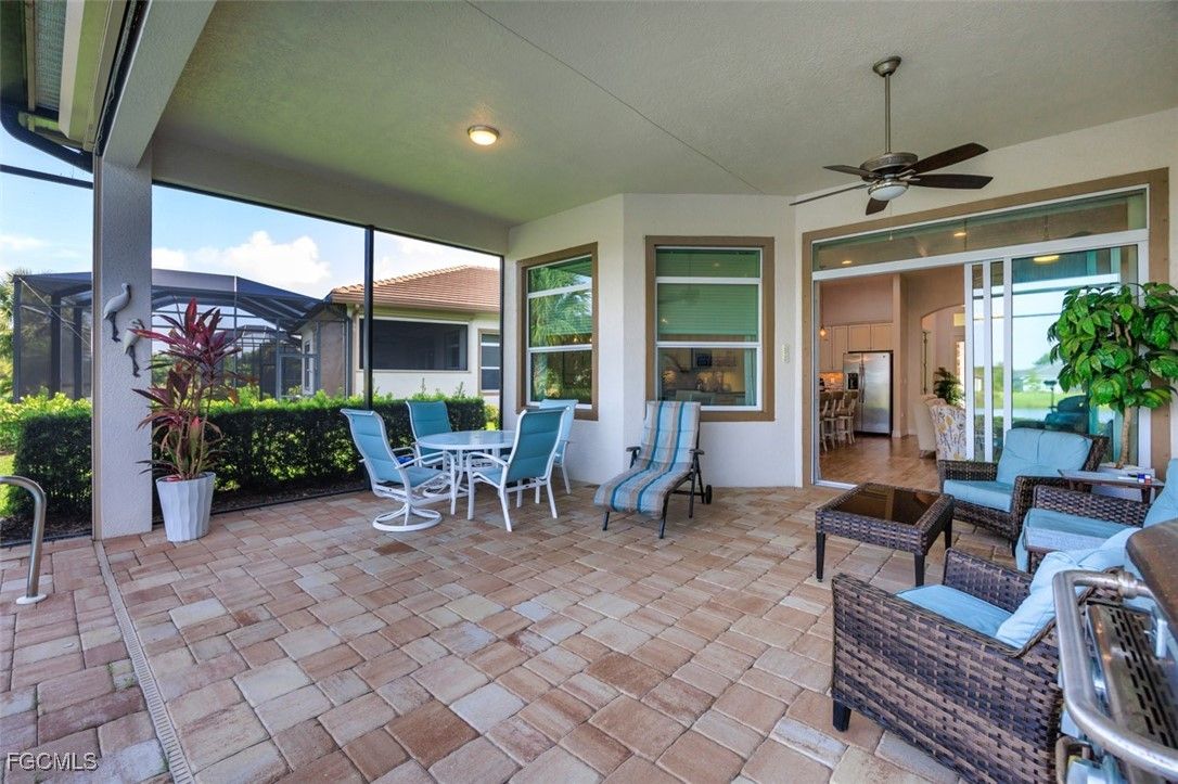 Welcome to a custom-built residence designed to capture the essence of Florida’s most enviable lifestyle—where elegance, comfort, and leisure converge in one of the most desirable golf communities in the state. If you're searching for a medium-sized home that doesn’t compromise on luxury, look no further. This meticulously crafted home features refined finishes and thoughtful upgrades throughout. The gourmet kitchen is a chef’s dream, showcasing gleaming stainless-steel appliances, granite countertops, a custom glass tile backsplash, and rich crown molding that adds a sophisticated touch. Step inside to find an interior adorned with high-end designer fixtures, elegant window treatments, and tasteful accents that complement the spacious, open floor plan. The Great Room flows seamlessly into an extended screened lanai, creating a perfect blend of indoor and outdoor living. Step outside and indulge in your personal Florida paradise—an inground pool with a serene lake view, ideal for peaceful mornings or sunset entertaining. Set within a community known for championship golf, lush natural landscapes, and resort-style amenities, this home offers not just a place to live, but a way to live. Live in the Florida lifestyle you’ve dreamed of—refined, relaxed, and radiant. Enjoy two 18-hole championship golf courses, tennis courts, a state-of-the-art fitness center, resort-style community pool, pickleball, and bocce ball courts. Outdoor enthusiasts will love the miles of biking and walking trails, plus a dog park for your furry friends. Conveniently located near Downtown Fort Myers, the Caloosahatchee River, and both the Fort Myers and Punta Gorda Airports, this home truly has it all.