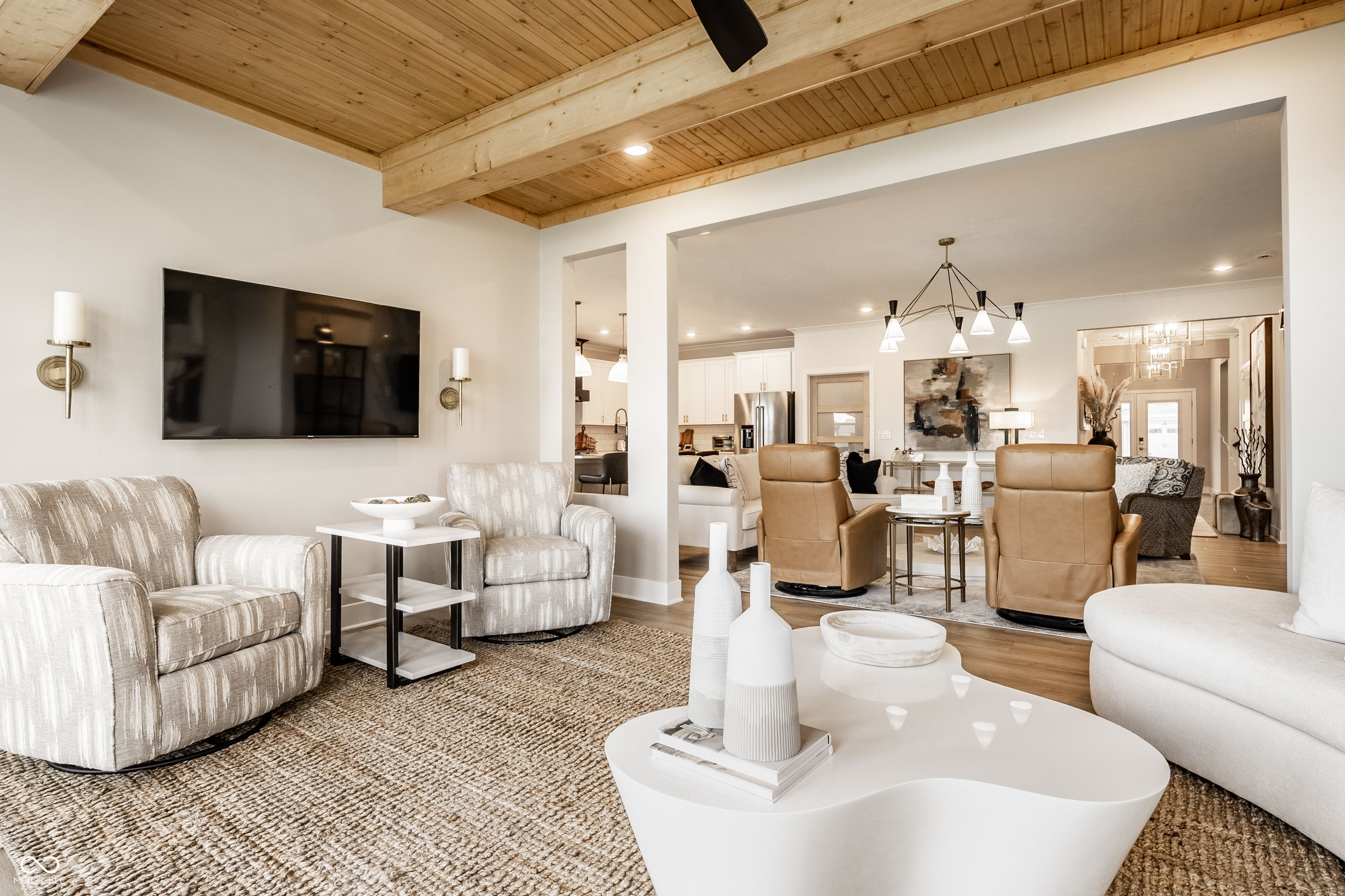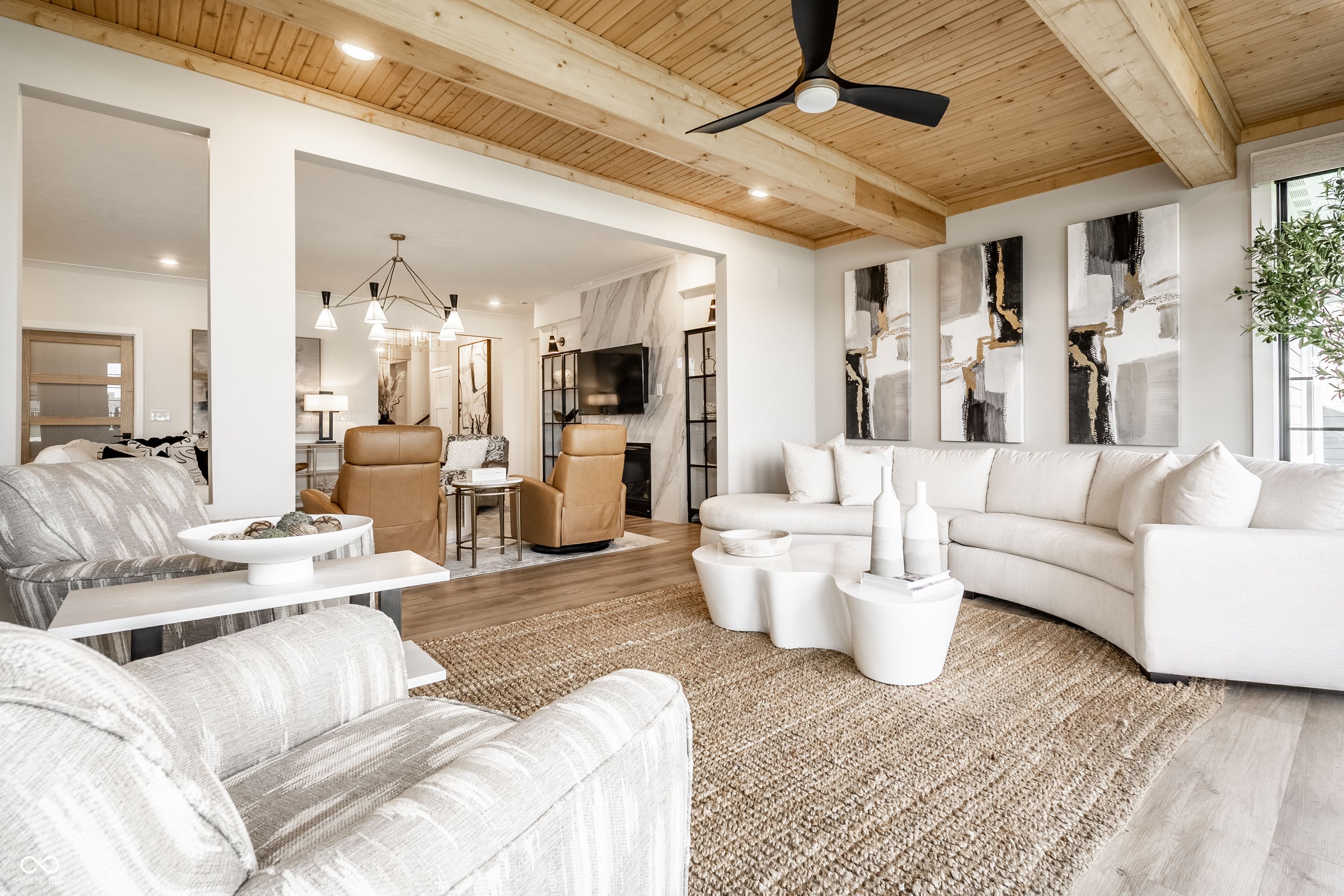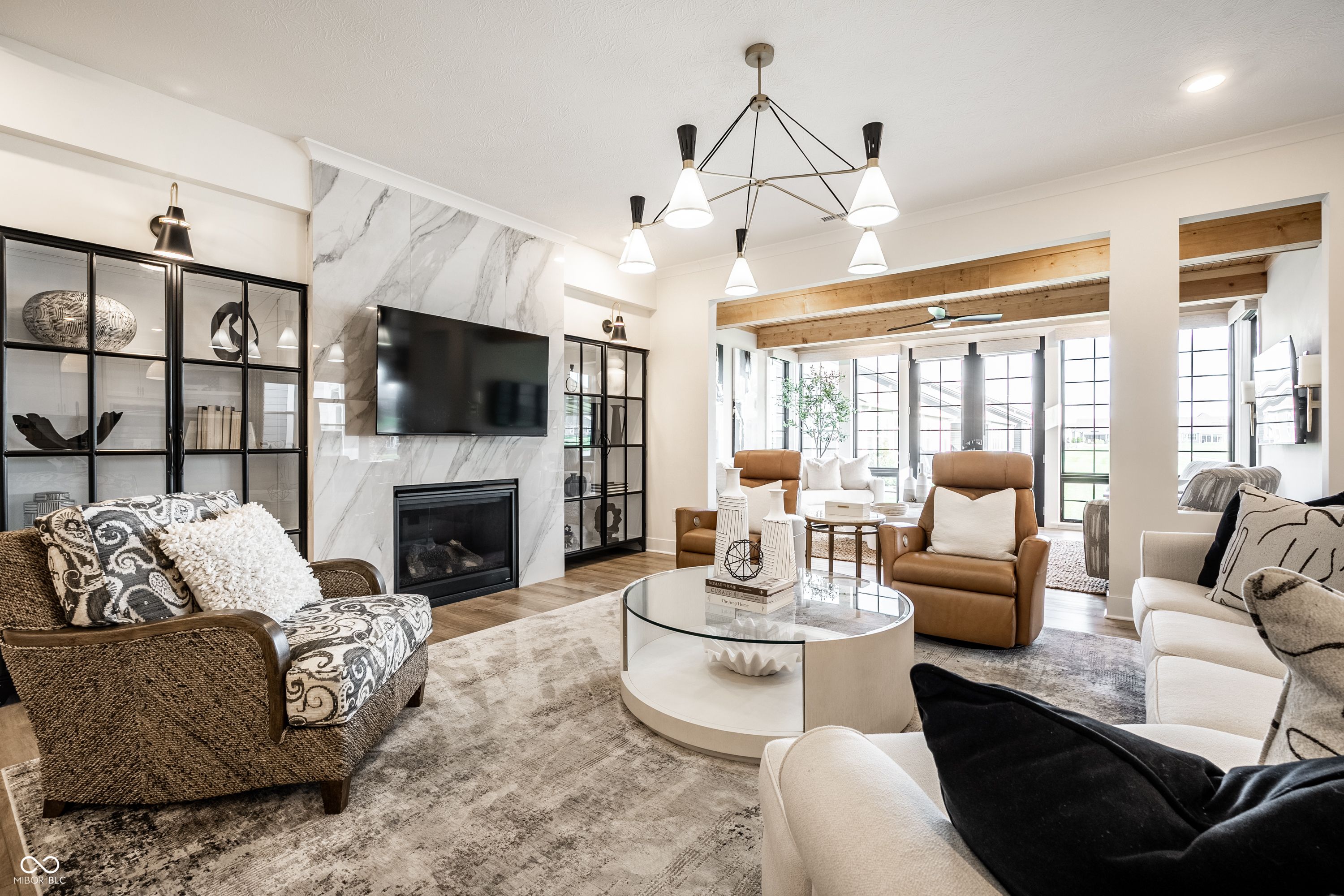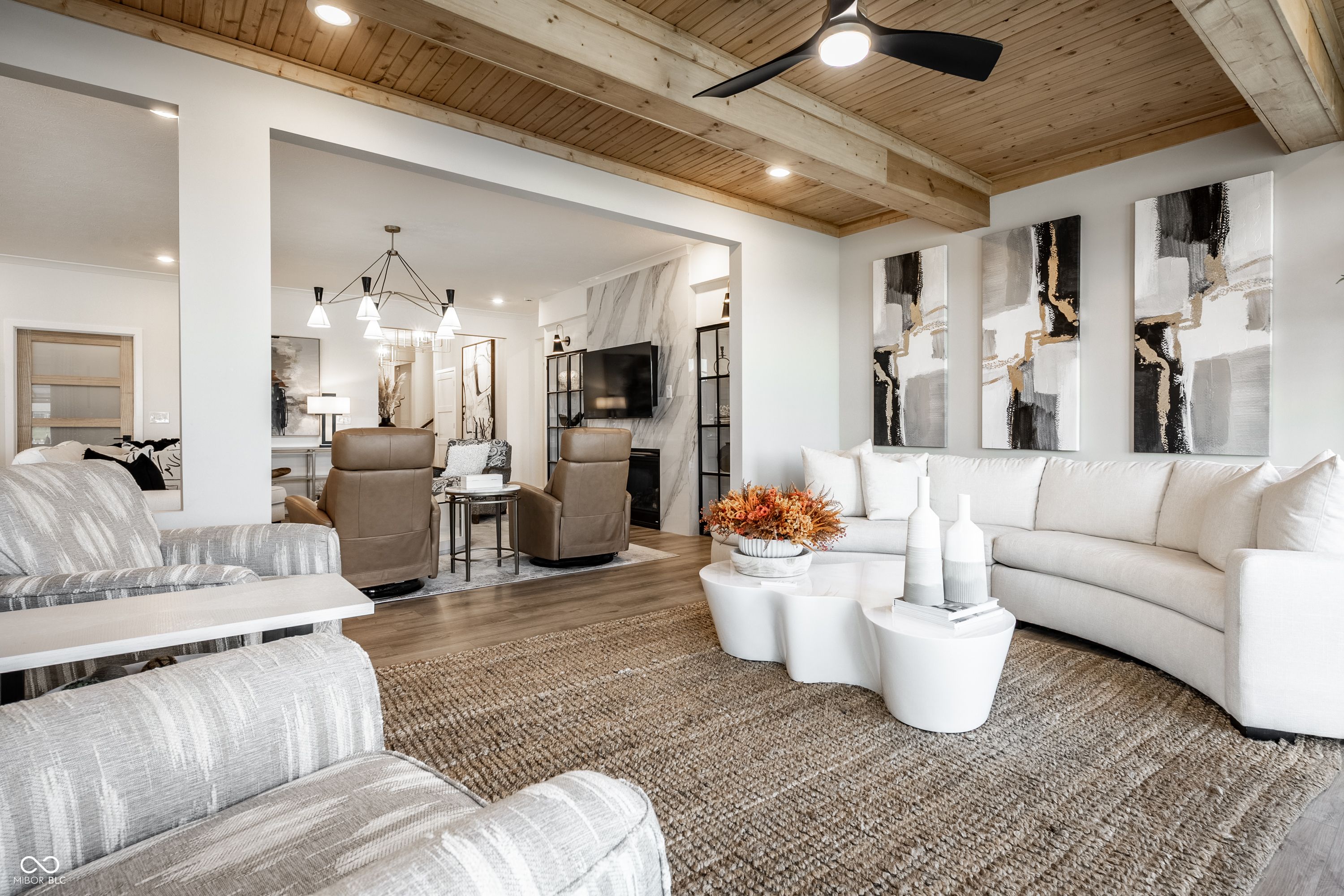 Set within Osborne Trails, Westfield's premier 55+ community, this exceptional residence offers a resort-inspired lifestyle paired with a level of design and finish rarely found within the neighborhood. For those seeking something beyond the expected, this thoughtfully reimagined Sullivan plan stands apart with curated enhancements, elevated materials, and one-of-a-kind details throughout. A formal dining room welcomes you inside, leading to a private den with custom built-ins-ideal for a refined workspace or retreat. The main living space centers around a chef's kitchen with an expansive island, decorative hood & custom pantry door, opening to a great room anchored by a dramatic floor-to-ceiling marble fireplace and flanked by striking glass-front cabinetry. A custom sunroom addition with wood-beamed ceilings brings warmth and character, seamlessly connecting to a spacious stamped concrete patio with both covered and open-air areas overlooking serene pond views-creating an effortless indoor-outdoor living experience. The primary suite offers a private escape with spa-inspired finishes and a fully customized walk-in closet. A second main-level bedroom adds flexibility, while the upper level provides a true guest retreat with a generous loft, bedroom, and full bath. Designer lighting, custom window treatments, solid-core doors, and detailed trim work throughout reflect a level of craftsmanship commonly found in fully custom homes. Residents enjoy access to two resort-style clubhouses, including The Retreat-a 9,000 sq. ft. amenity center with fitness, pickleball and tennis courts, outdoor pool, walking trails, and a full calendar of social events-along with a second clubhouse offering an additional pool, bocce courts & expanded gathering spaces. Just minutes from Downtown Westfield with convenient access to US-31, Meridian, and Keystone, this home delivers a distinctive opportunity to enjoy elevated living within one of the area's most sought-after communities.