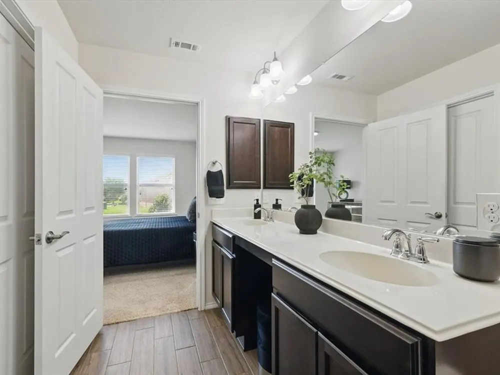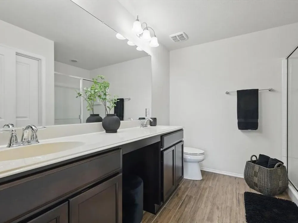 Meticulously maintained Gray Myst Floor Plan in the sought after 55+ community of Frisco Lakes. This two bedroom home offers a perfect blend of comfort and sophistication coupled with an array of amenities designed to enhance your lifestyle. The open concept layout seamlessly blends style and functionality from the gourmet kitchen to the living and dining rooms. QUARTZ COUNTERTOPS & UNDERMOUNT SINK are features in the kitchen.The LIGHT & BRIGHT interior, enhanced by NEW LED LIGHT FIXTURES throughout. TREY CEILINGS & UPDATED WOOD-LIKE FLOORING. The primary suite has an Ensuite Bathroom with a walk in shower and walk in closet. The guest bedroom and bathroom are separated from the Primary Suite for privacy. The office-den offers an additional living area. HVAC unit installed in 2024. The covered patio and backyard are great for entertaining. See Transaction Desk for upgrades and maintenance to home. You will be within WALKING DISTANCE to the amenities designed to enrich your lifestyle including scenic walking paths, picturesque ponds, pickleball courts and the pristine Frisco Lakes Golf course. Immerse yourself in the vibrant social scene at the amenity centers where endless opportunities for recreation and camaraderie await.