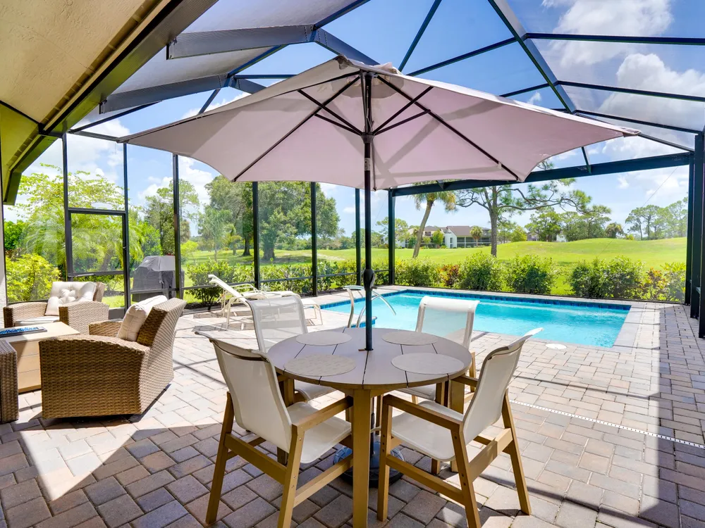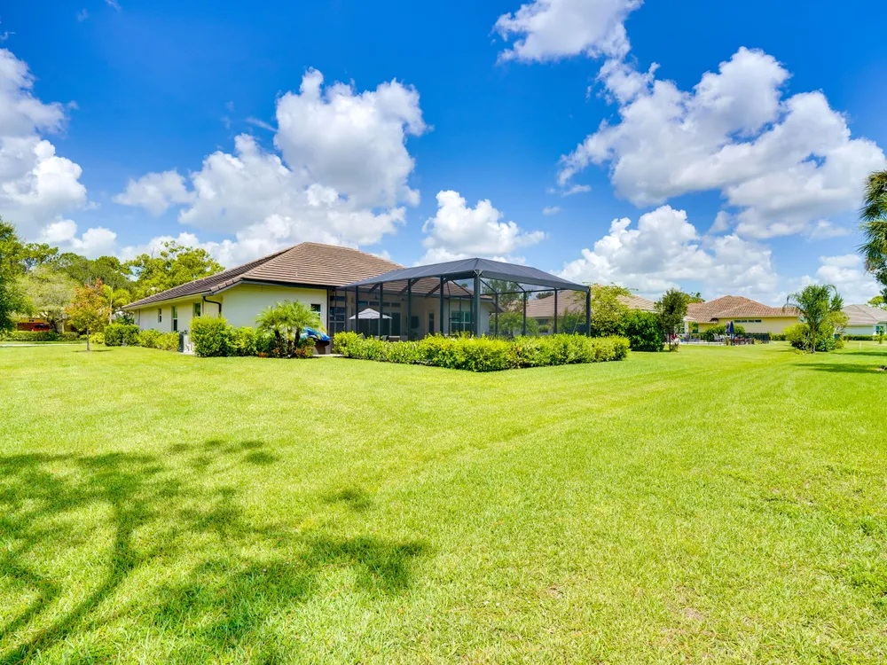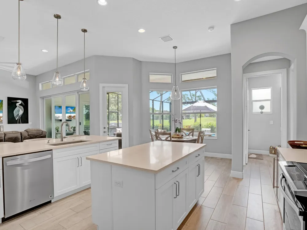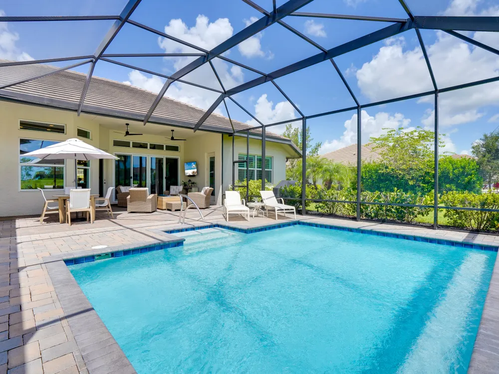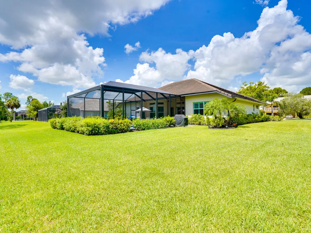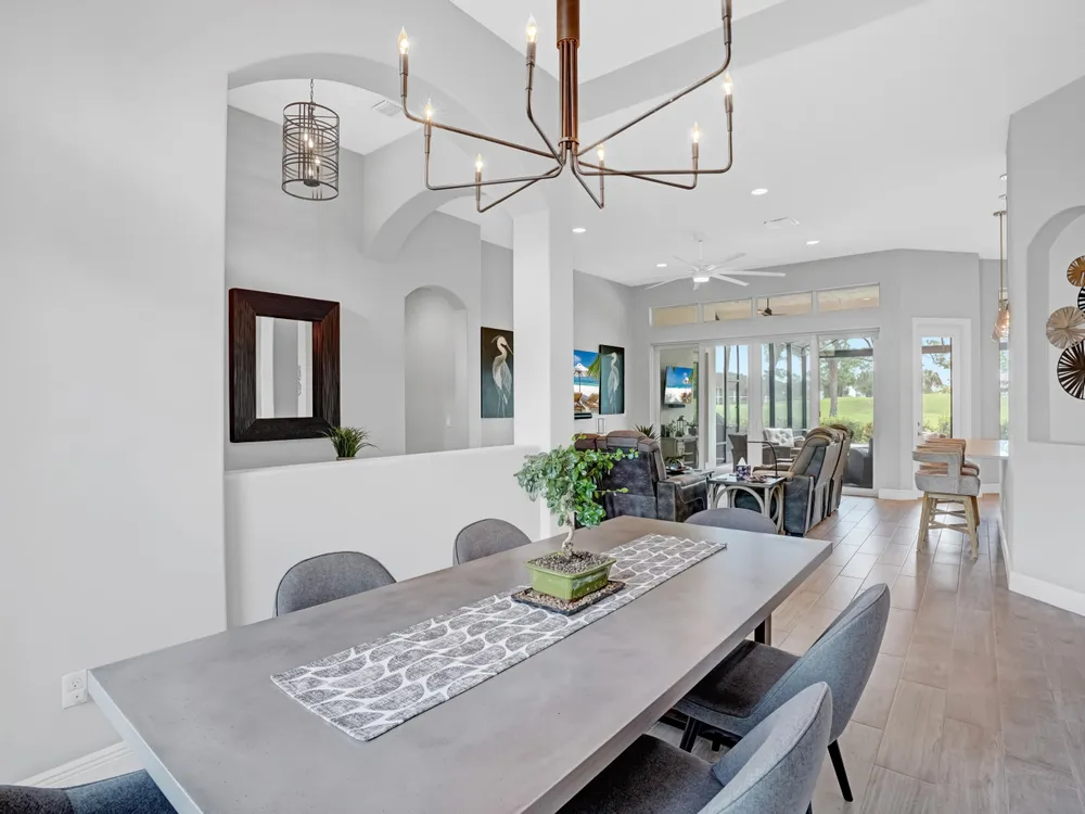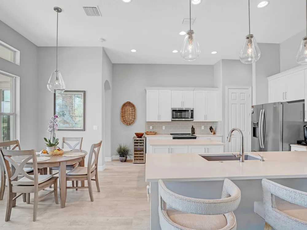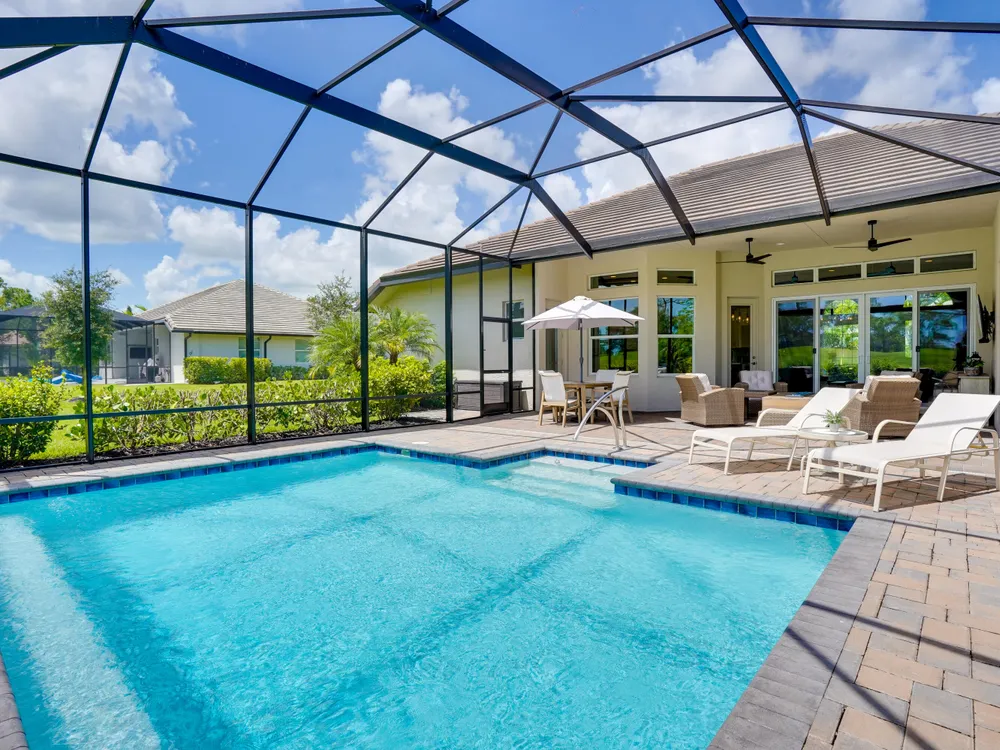 Stunning 3 bedroom, 3 bathroom GHO built pool home in the desirable Meadowood community. Designer style screened-in saltwater and heated pool with bench seating and jets. The home features an open main living area and split bedroom floor plan. Kitchen features quartz counter tops, subway tile backsplash, crown molding on the cabinets, a center island and breakfast nook overlooking the pool. Separate dining room with volume ceilings and archway details. The guest bedrooms feature crown molding and plantation shutters. Primary bedroom retreat is located on its own side of the home. The large bedroom features a tray ceiling, plantation shutters and a door to the back patio and pool area.