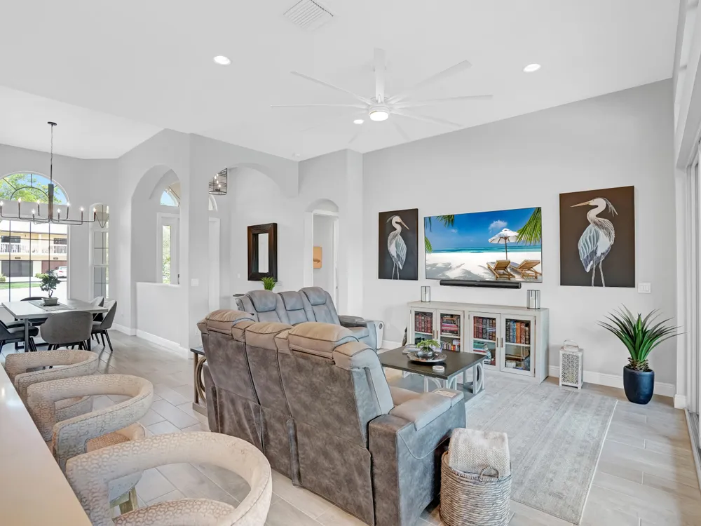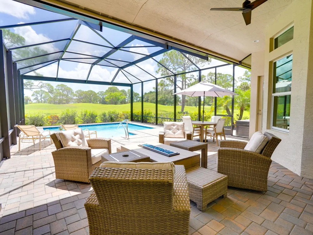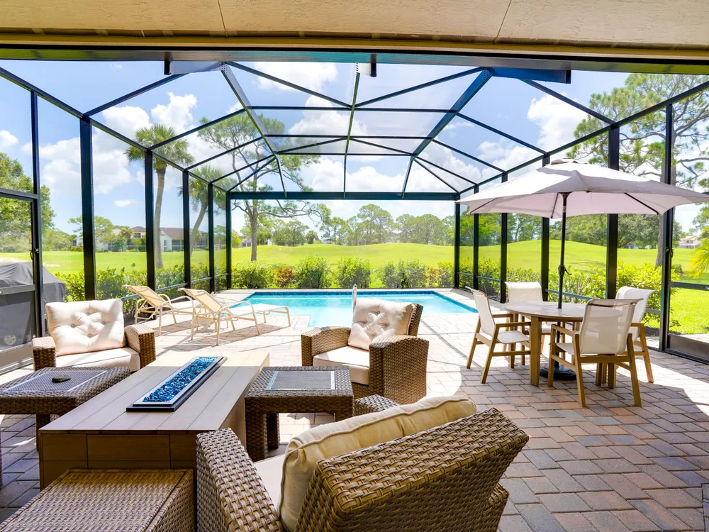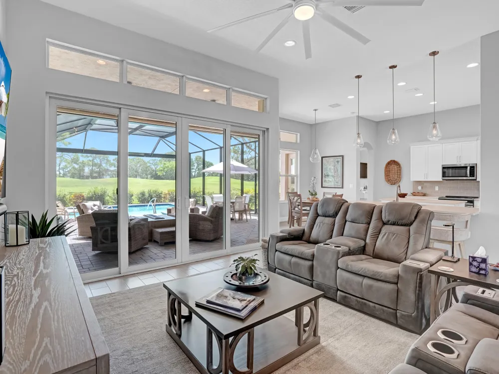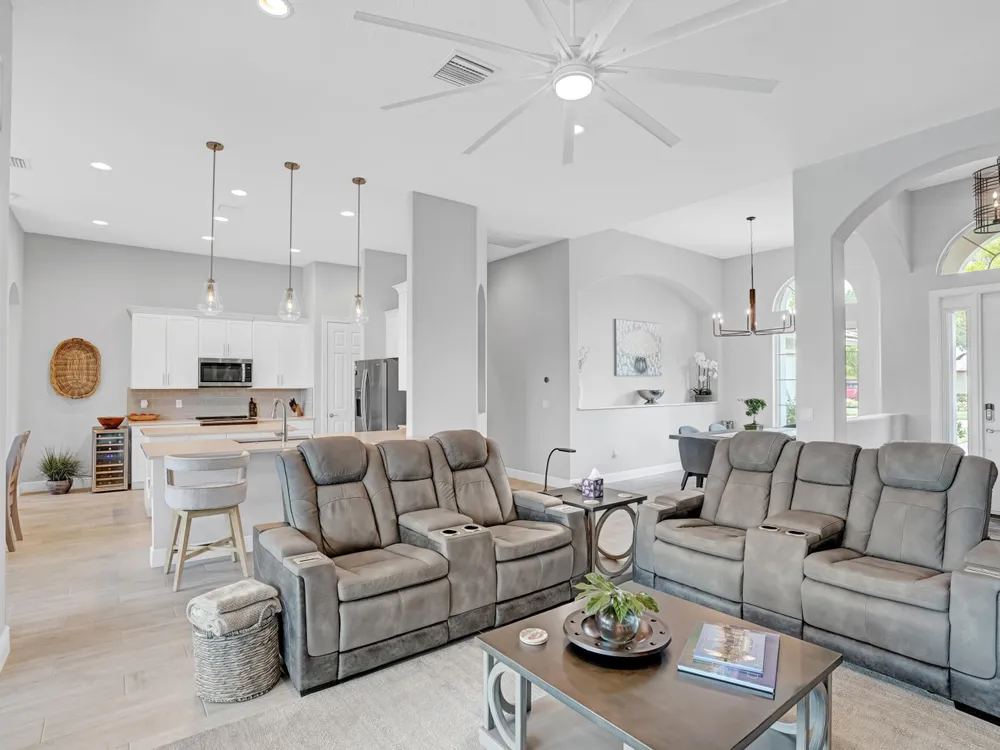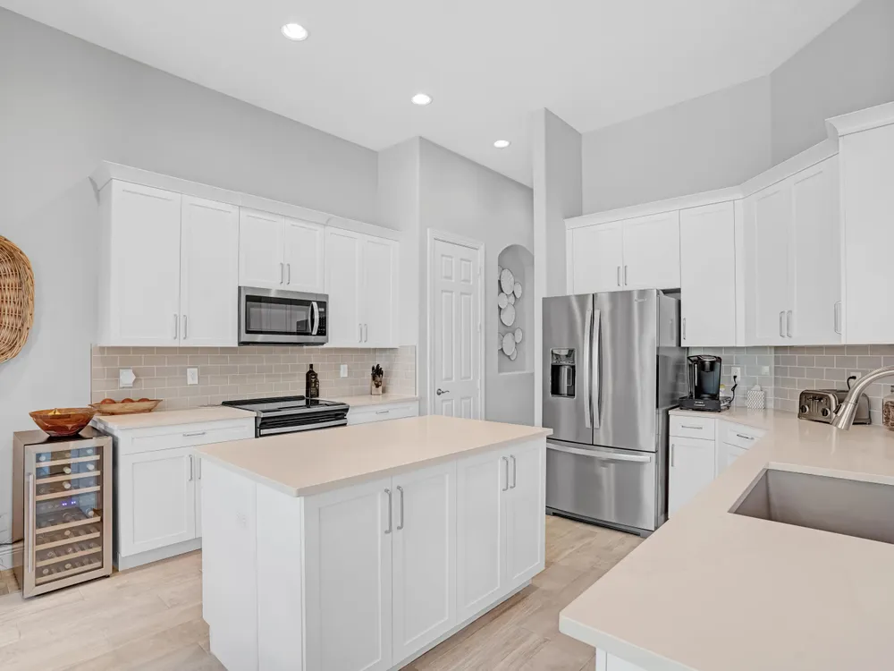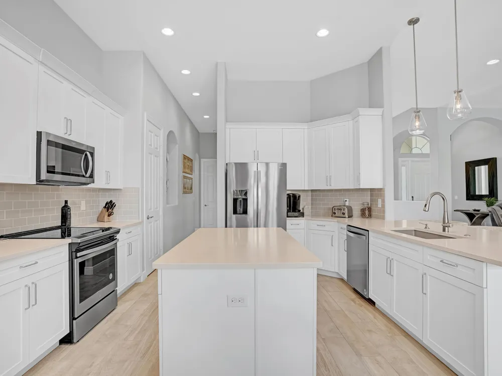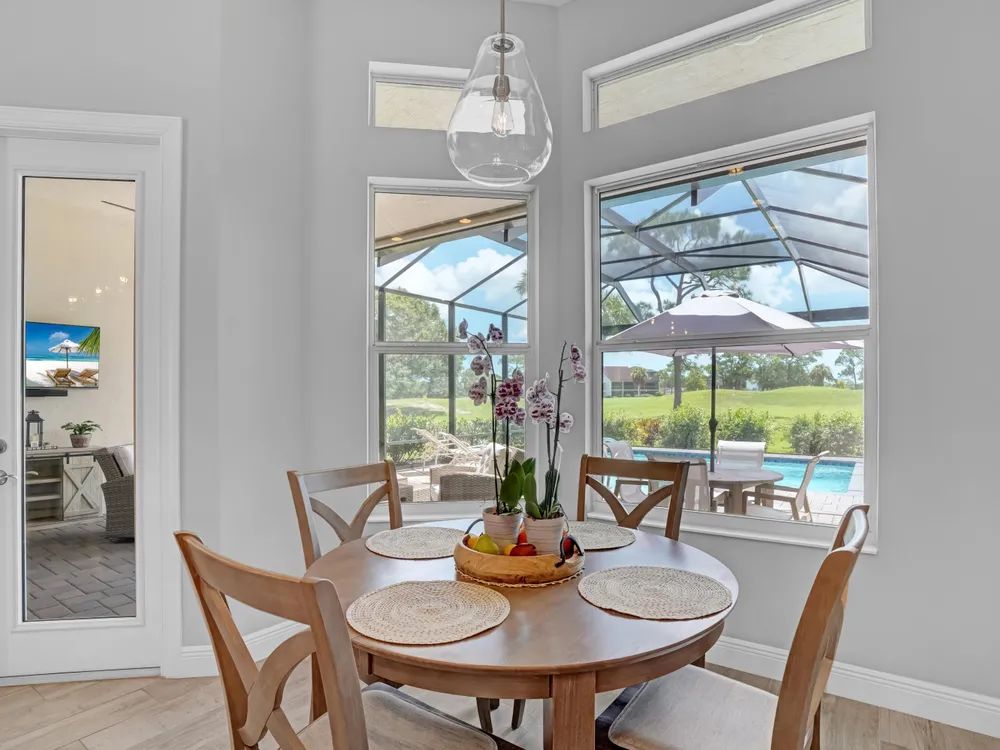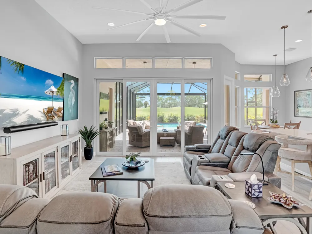 Stunning 3 bedroom, 3 bathroom GHO built pool home in the desirable Meadowood community. Designer style screened-in saltwater and heated pool with bench seating and jets. The home features an open main living area and split bedroom floor plan. Kitchen features quartz counter tops, subway tile backsplash, crown molding on the cabinets, a center island and breakfast nook overlooking the pool. Separate dining room with volume ceilings and archway details. The guest bedrooms feature crown molding and plantation shutters. Primary bedroom retreat is located on its own side of the home. The large bedroom features a tray ceiling, plantation shutters and a door to the back patio and pool area.