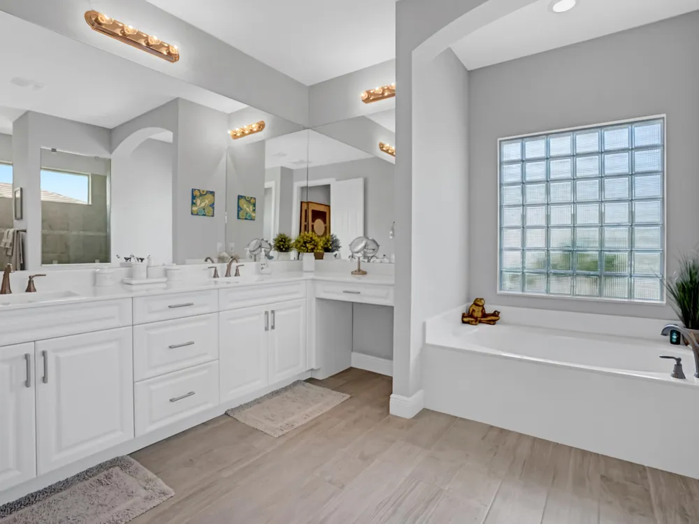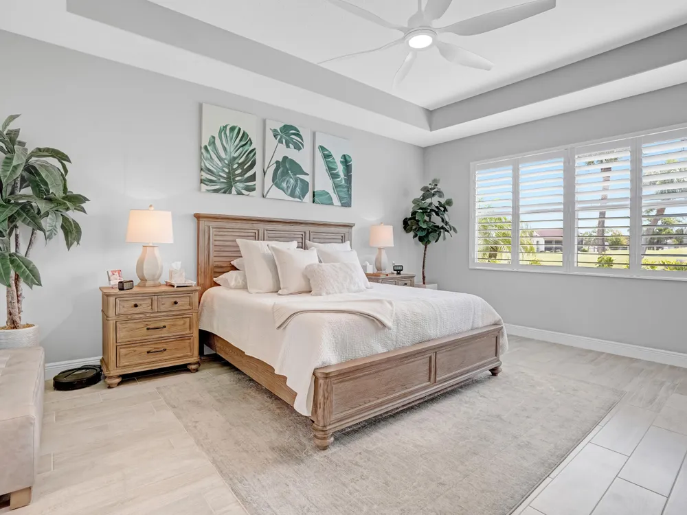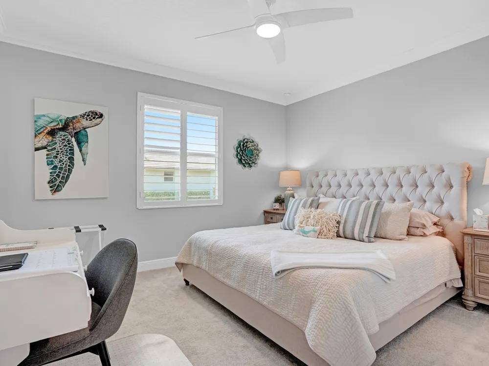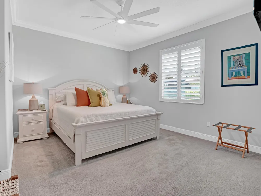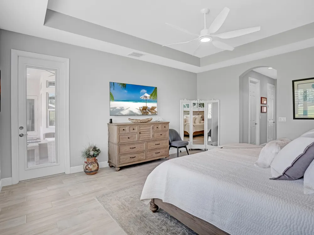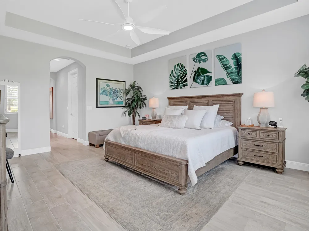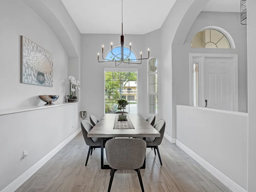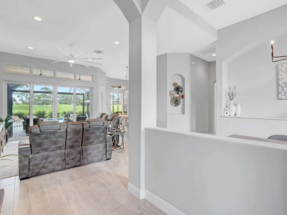 Stunning 3 bedroom, 3 bathroom GHO built pool home in the desirable Meadowood community. Designer style screened-in saltwater and heated pool with bench seating and jets. The home features an open main living area and split bedroom floor plan. Kitchen features quartz counter tops, subway tile backsplash, crown molding on the cabinets, a center island and breakfast nook overlooking the pool. Separate dining room with volume ceilings and archway details. The guest bedrooms feature crown molding and plantation shutters. Primary bedroom retreat is located on its own side of the home. The large bedroom features a tray ceiling, plantation shutters and a door to the back patio and pool area.