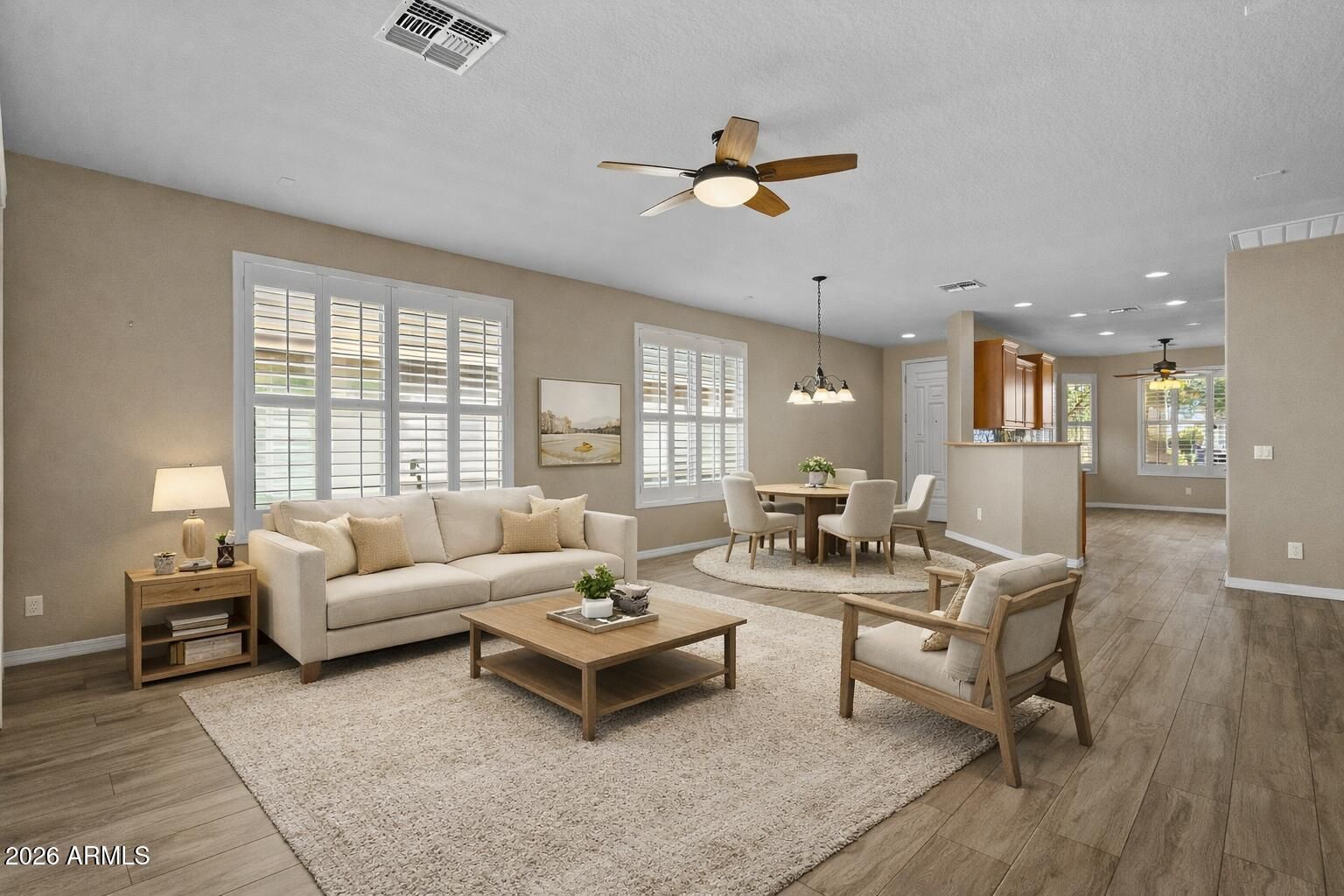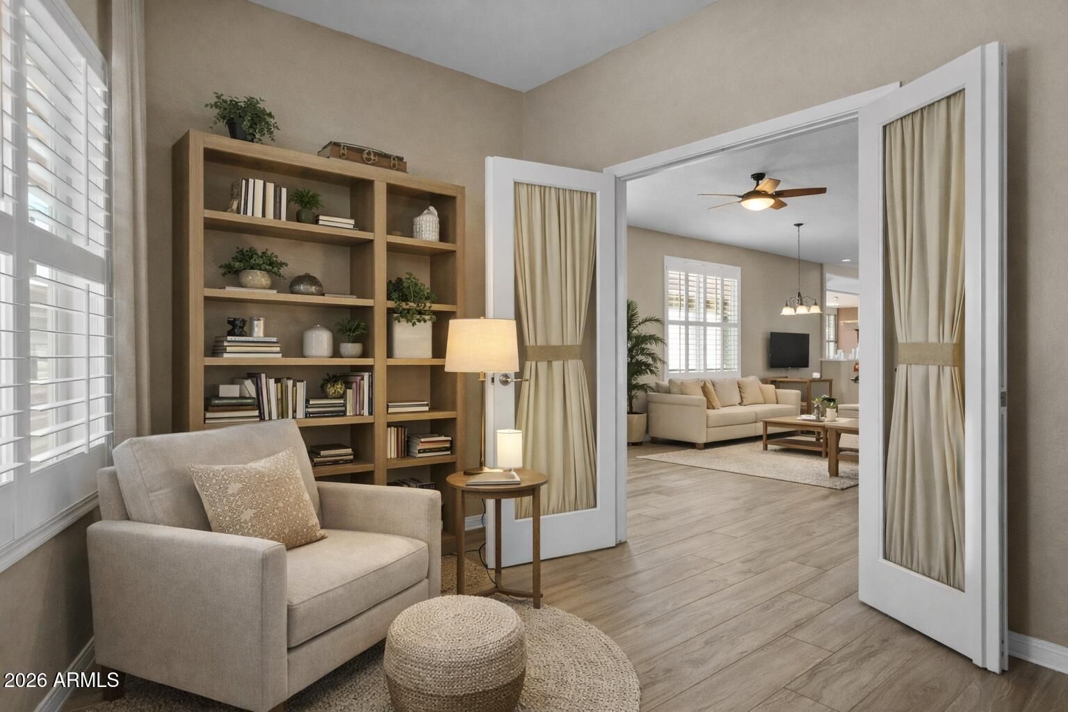 Welcome to easy living in the sought after 55+ community of Solera at Johnson Ranch. This popular floor plan offers an open concept layout ideal for everyday living and entertaining. Updates include refreshed flooring and updated bathrooms. In addition to two bedrooms, the home features a flexible den that can be used as a home office, craft space or cozy reading room. The primary suite provides ample storage, while the secondary bedroom is positioned at the front for added privacy. Enjoy a covered patio and low-maintenance backyard with view fencing, offering a natural desert backdrop and Arizona sunsets without the upkeep. Located in a quiet cul-de-sac away from busy street noise, this home is ideal for full-time or seasonal living.