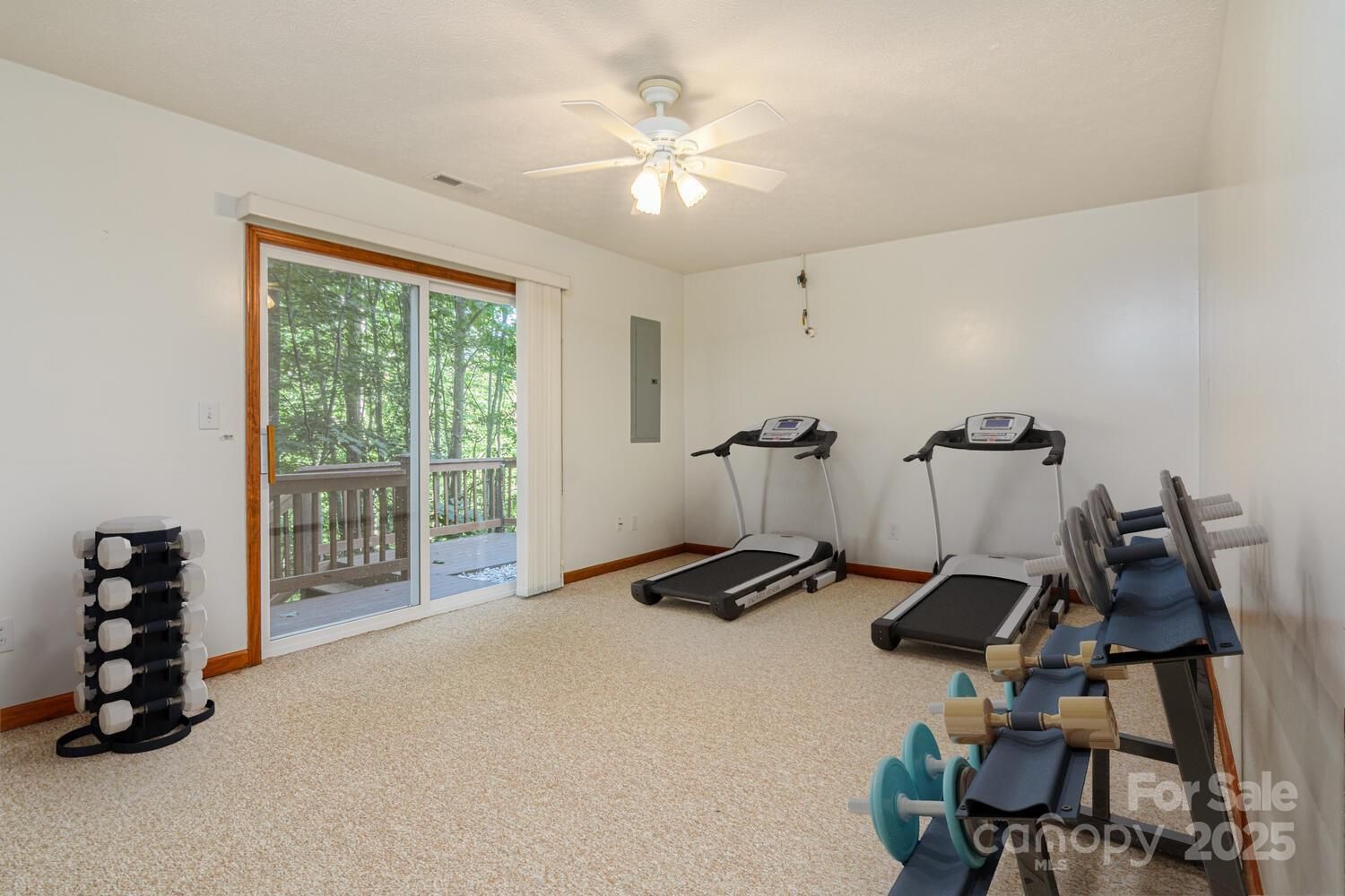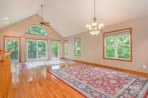 Light-filled designer home with a vaulted Great Room and arched window — an open floor plan made for entertaining that flows directly to an 18' x 12' deck. Primary suite with en suite bath featuring a garden soaking tub, walk in shower and spacious walk in closet. Primary bedroom opens to a sunny sunroom with direct access to the 18' x 12' deck — perfect for morning coffee. Lower family room with gas log fireplace, built in bookshelves, integrated audio system and access to a covered 42' x 12' lower deck; plenty of room for a game or pool table. Lower deck leads to an outdoor sitting area with a firepit for relaxed evenings. Dedicated exercise room sized to accommodate full equipment and an extra refrigerator. Carriage Park is a gated community with 24 hour security, indoor pool, tennis and pickleball courts, and a clubhouse for social events and fitness. This home is within walking distance of the clubhouse and neighborhood streets ideal for morning and evening walks.