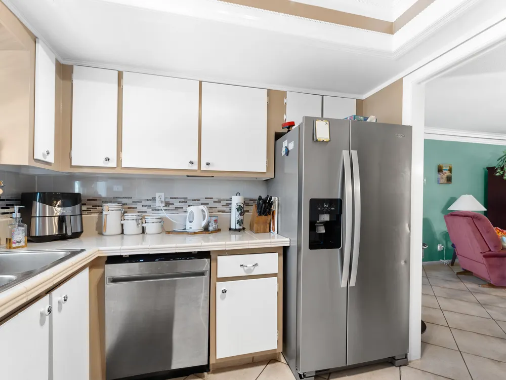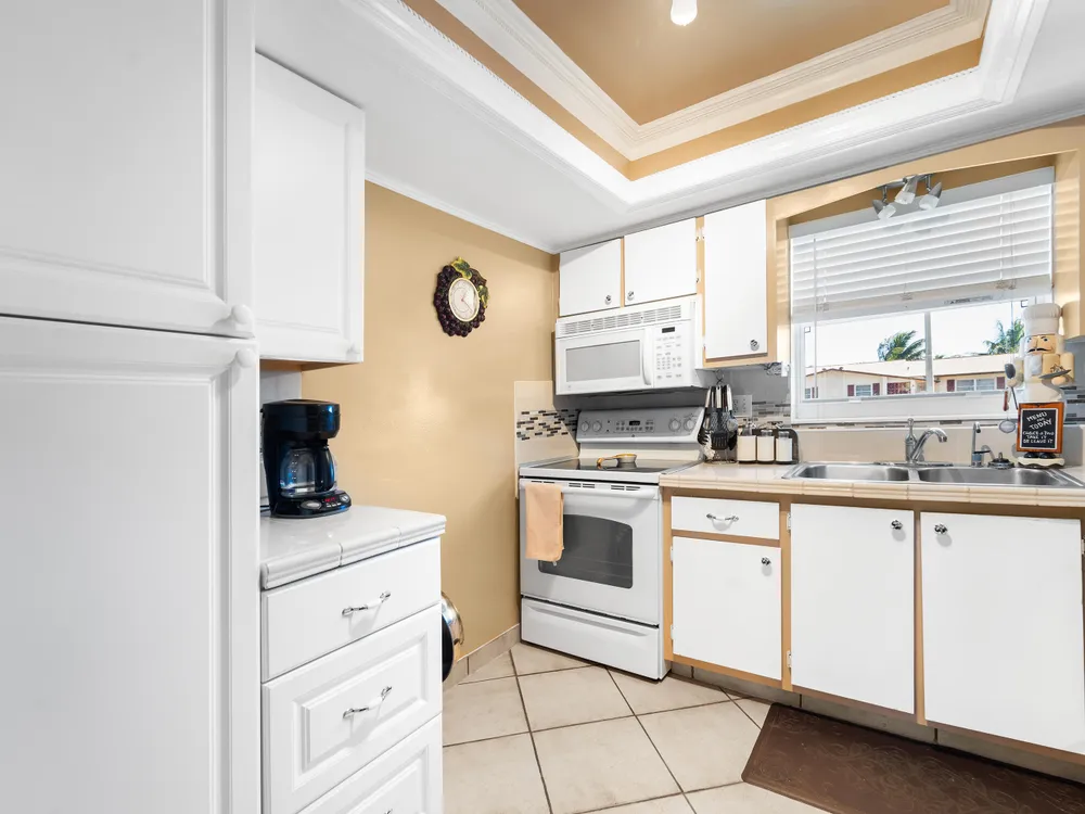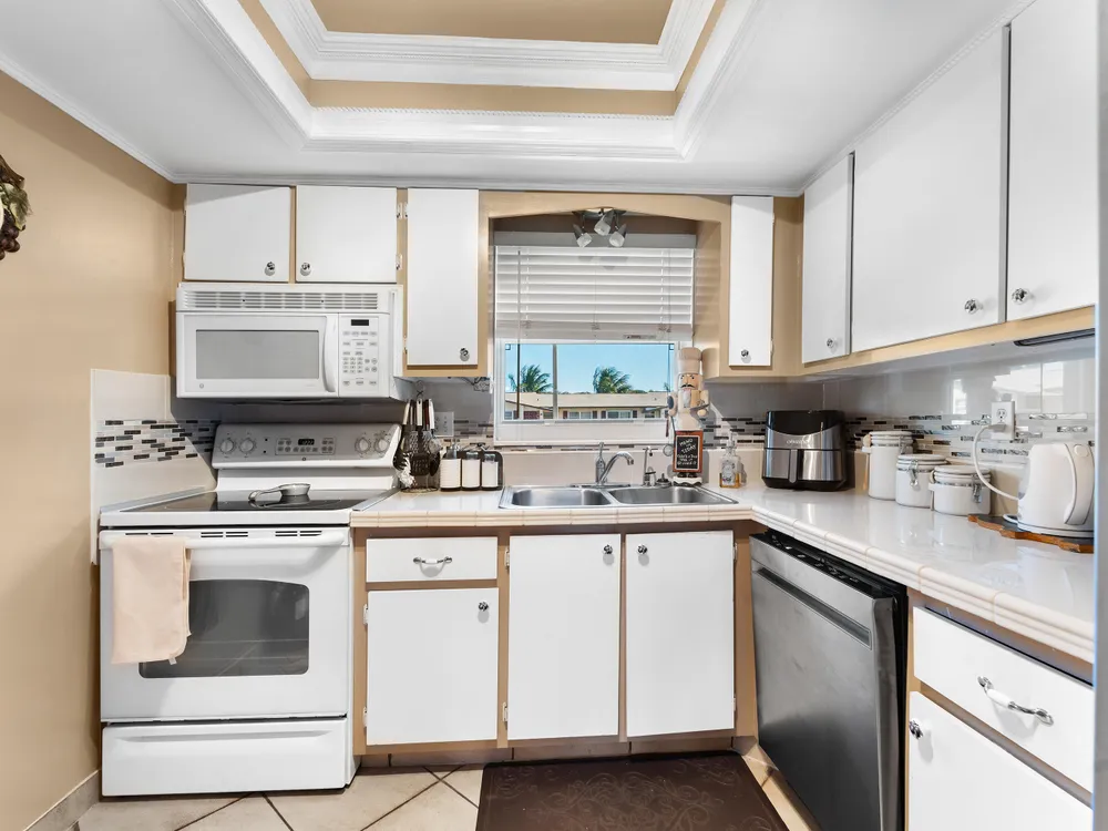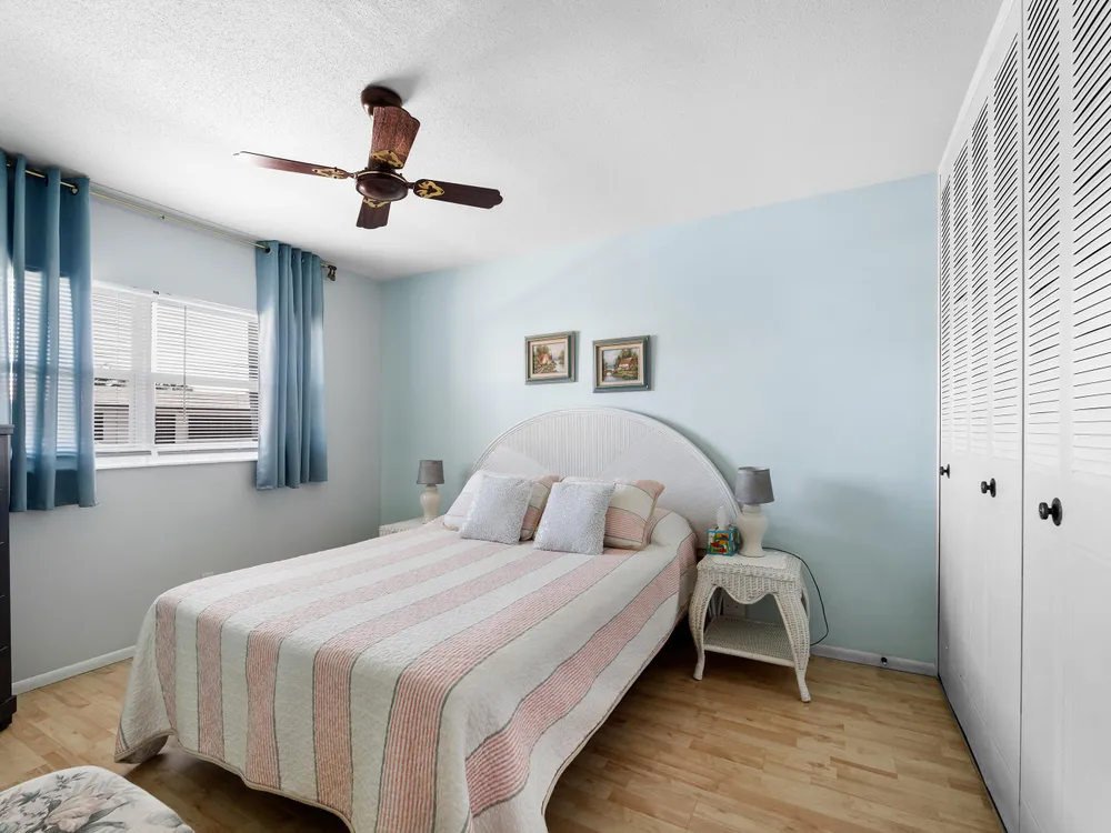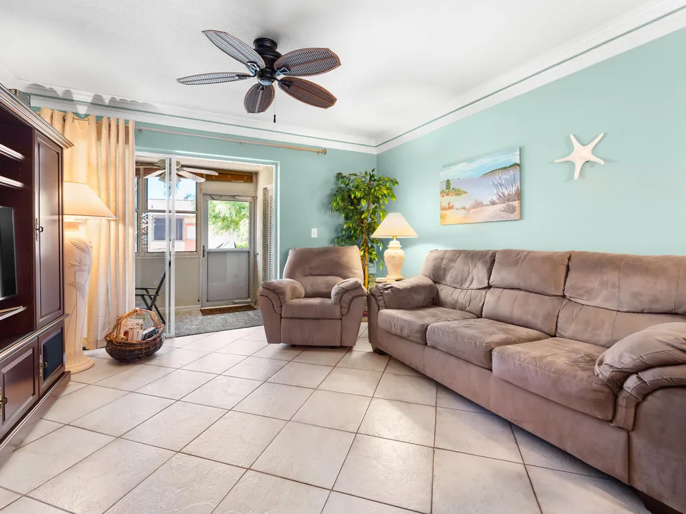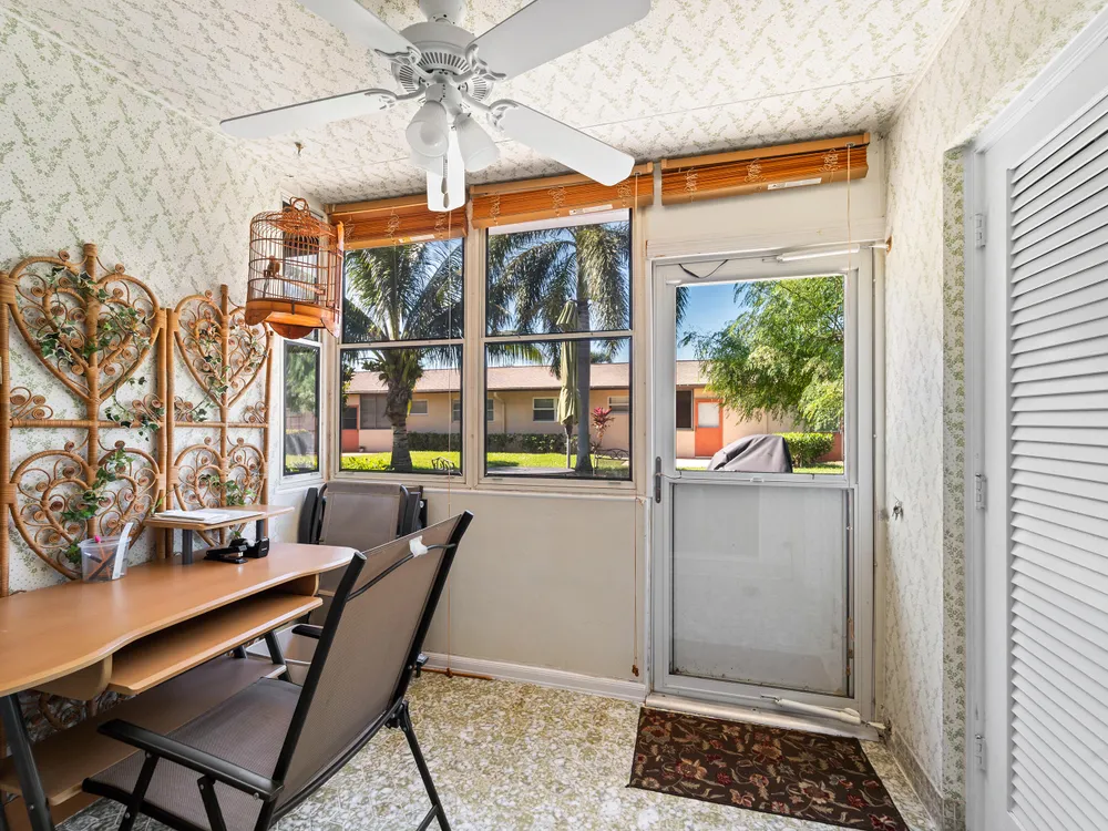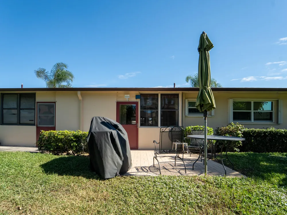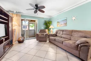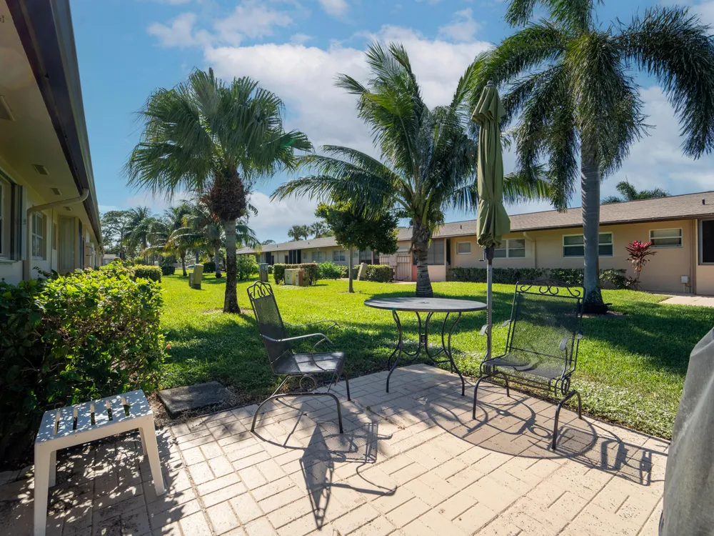 Updated, well maintained 2 bedroom, 2 bathrooms, furnished Townhouse Villa, with Hurricane Impact windows and accordion type shutters. The condo has classic crown moldings, tile and laminated wood floors, no carpets, glass-top stove, new refrigerator and new dish washer, located across the street from the clubhouse in a 55+community. New inside electric panel, new roofs, with assigned parking directly in front of the unit. The Master bedroom features ensuite bathroom with walk in shower, tub and shower in guest bathroom, large closets and storage throughout the condo. Low monthly maintenance, which includes internet, cable, water, garbage, onsite laundry facilities with assigned laundry time. The condo has an adjacent tiled patio with umbrella, BBQ, table and chairs.
