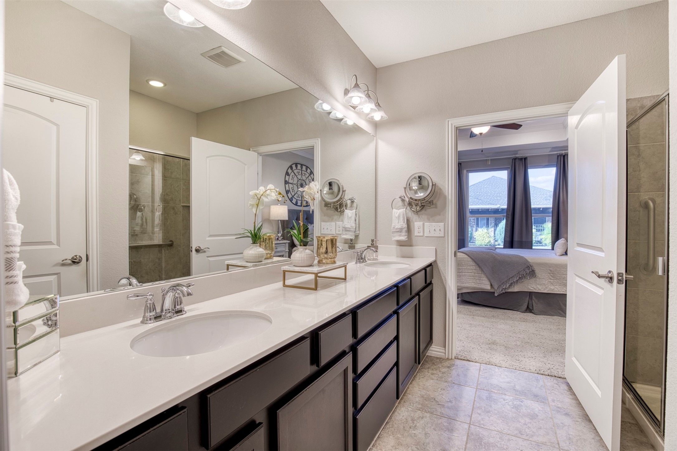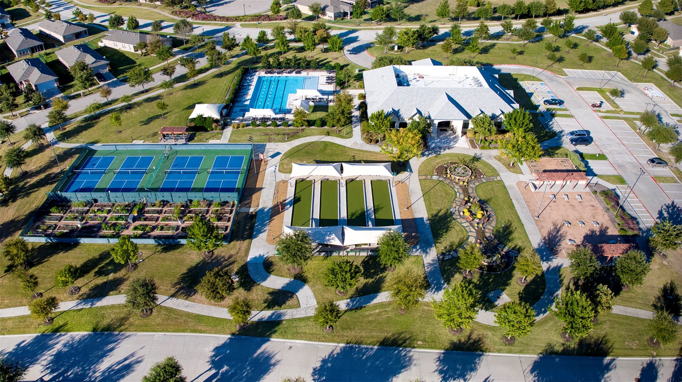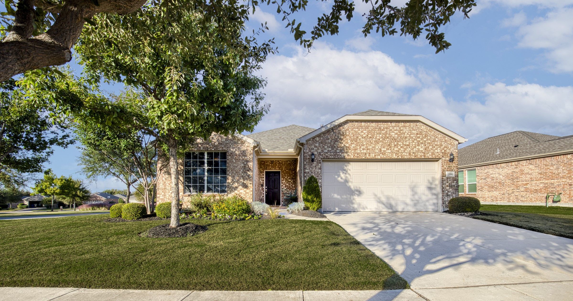 Carefree living in the sought-after Del Webb Frisco Lakes 55+ community. This light and bright Abbeyville plan situated on a corner lot offers over 1,700 sq. ft. with 2 bedrooms, 2 bathrooms, an enclosed screened porch, and a separate office or flex room. The open-concept layout features abundant natural light, neutral finishes, and tasteful upgrades throughout.The upgraded kitchen includes stainless steel appliances with a 4-burner gas range, built-in microwave, granite countertops, tile backsplash, and a large island with seating. Soft taupe cabinetry and upgraded lighting enhance the warm, inviting atmosphere. The living area and primary suite feature tray ceilings for added architectural interest. The primary bedroom includes an ensuite bath with dual vanities, walk-in shower, and a spacious walk-in closet. The secondary bedroom and full bath provide comfortable guest accommodations. The large laundry room includes additional pantry and storage space for convenience. An extended 2-car garage offers additional storage capacity, ceiling mounted storage racks and includes a built-in storm shelter. The landscaped backyard provides a peaceful outdoor space with a screened-in porch, pergola, and water feature. Mature trees offer shade and privacy, creating a comfortable setting for outdoor enjoyment. This property is well maintained and move-in ready. Home comes equipped with solar screens. Conveniently located near the Frisco Lakes Golf Club and community amenity center, residents enjoy access to indoor and outdoor pools, fitness facilities, walking paths, golf, tennis, pickleball, restaurant, ballroom, library, card rooms, arts and crafts studios, and numerous clubs and activities. Golf cart friendly community with easy access to Frisco dining, shopping, and entertainment. Located off 423 with quick access to DNT and 121.