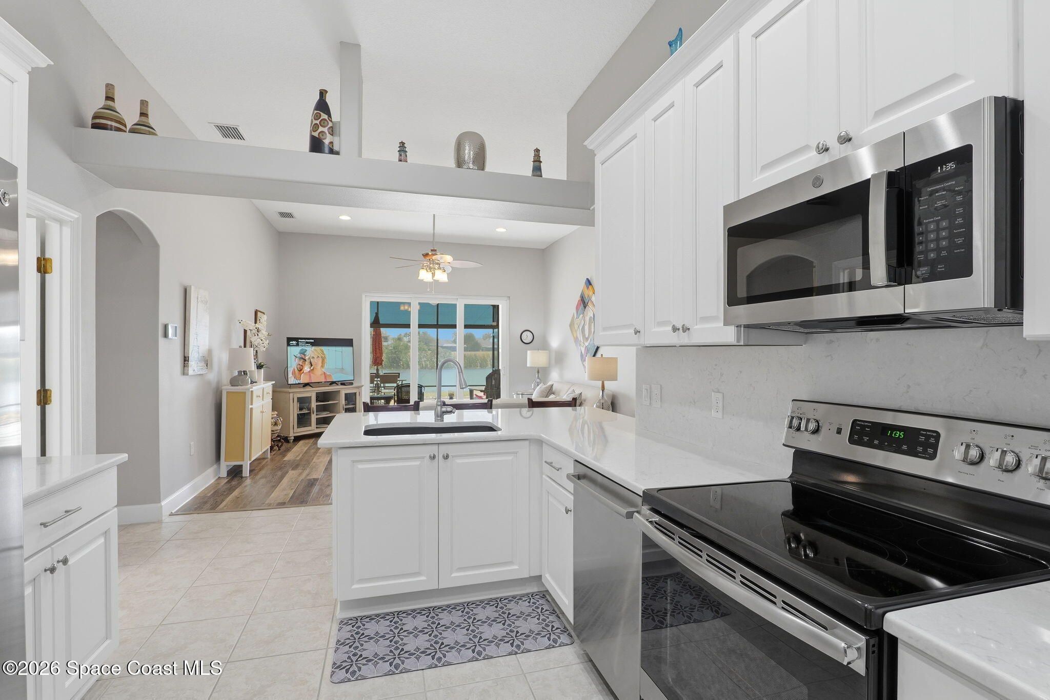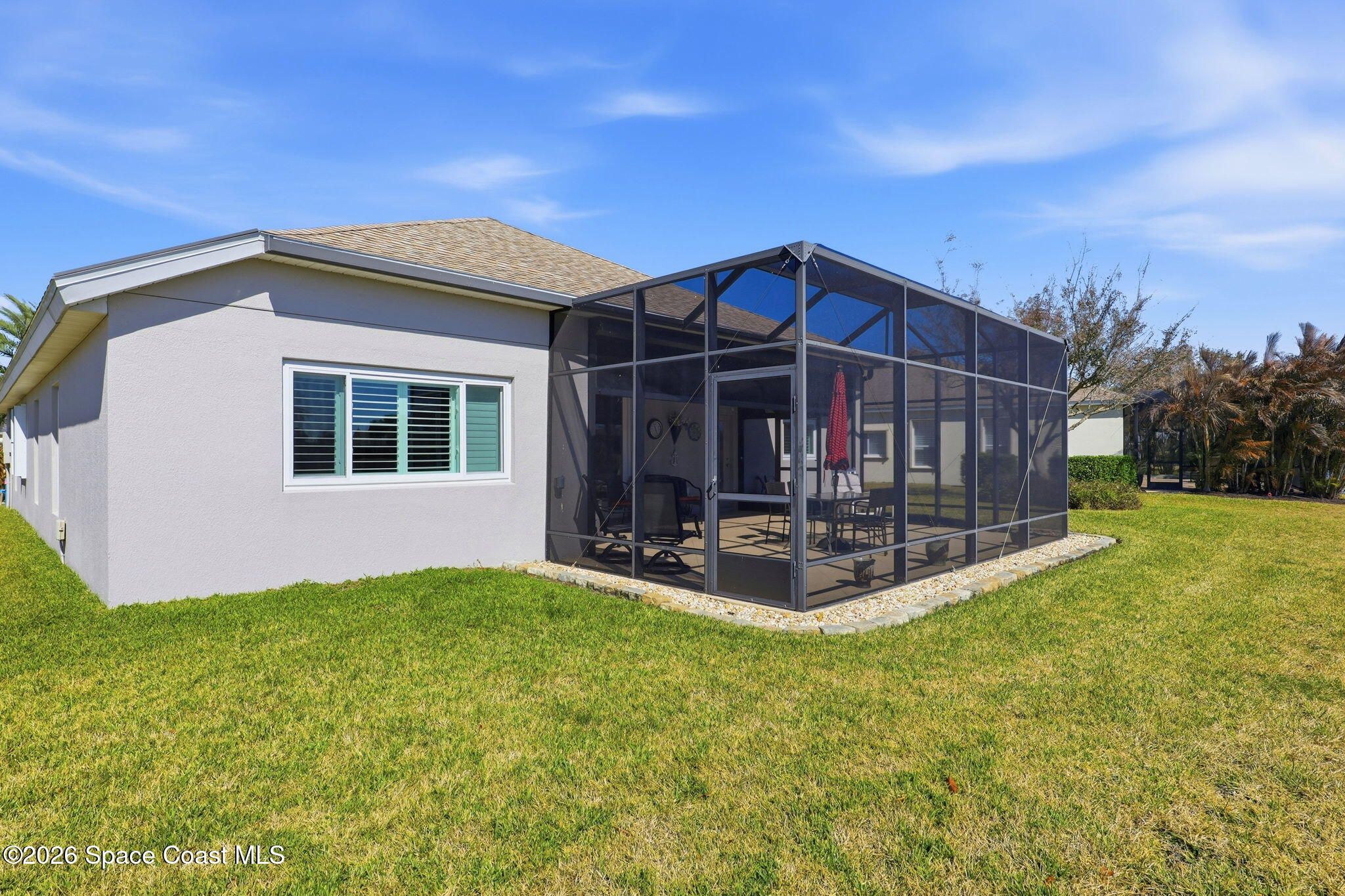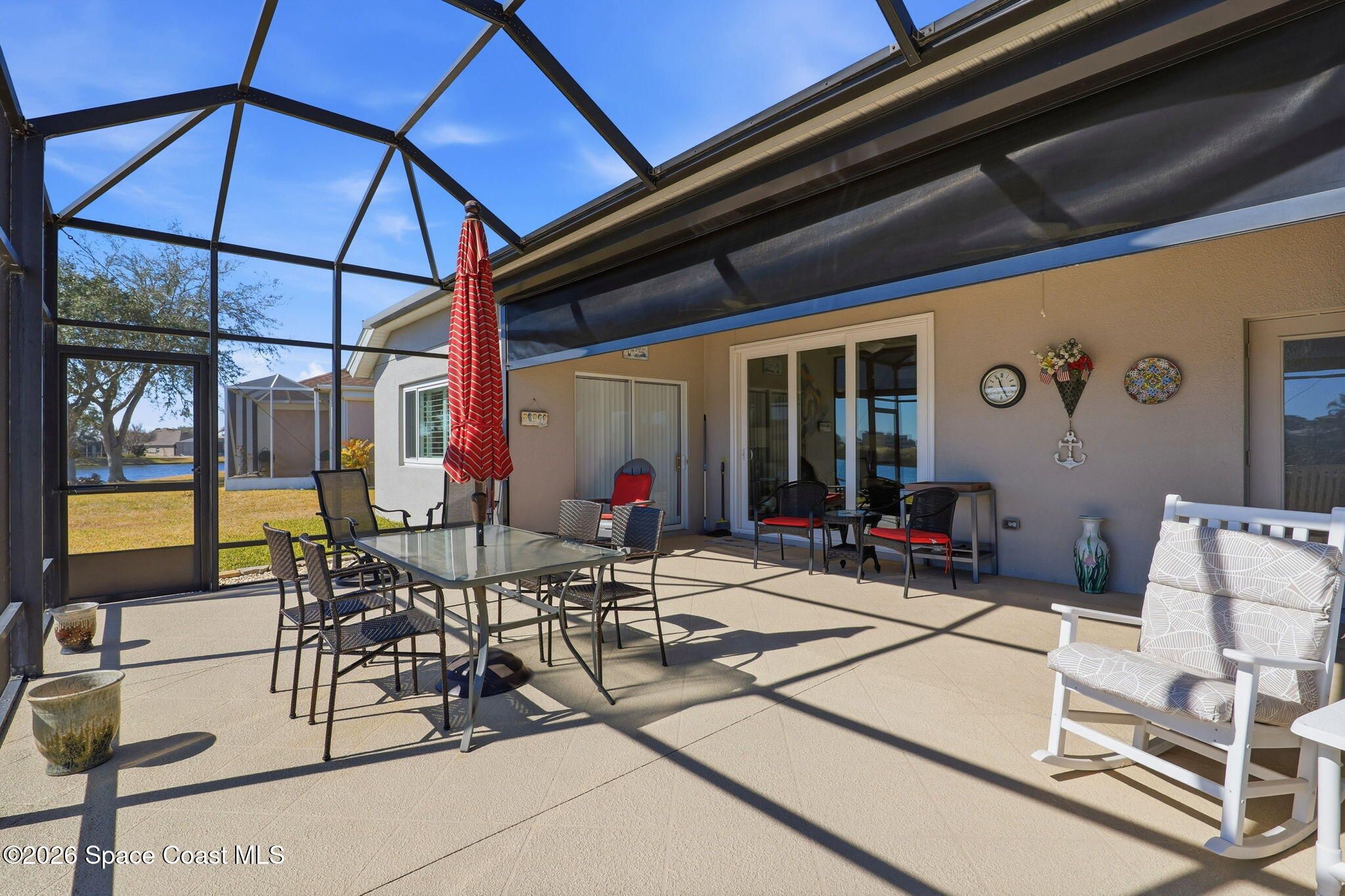 Welcome to this beautifully maintained one of a kind 3-bedroom, 2-bath Estate home located in sought after 55+ Heritage Isle Community. Enjoy serene waterfront and golf course views from your backyard and abundant natural light throughout the home. The updated kitchen and bathrooms feature modern finishes such as quartz countertops, under cabinet lighting and soft close cabinet doors. Tile and laminate flooring throughout home complemented by impact glass windows enhanced with thoughtfully appointed plantation shutters for peace of mind and energy efficiency. Spacious three car garage offers ample storage and convenience. Gain the confidence you deserve with professionally installed hurricane screens, offering quick and convenient storm protection with a touch of a button while enjoying shade and privacy the rest of the year. This home combines comfort, style, and low maintenance living in a prime location perfect for relaxing and entertaining. Located in a premier 55+ guard -gated, golf cart friendly community with lawn care included. Enjoy a 20,000 sq. ft. clubhouse with a restaurant, bar, gym, ballroom, spa, pool, pickleball, tennis and more. Minutes from hospitals, shopping, dinning & close to Duran's championship 18 hole golf course.