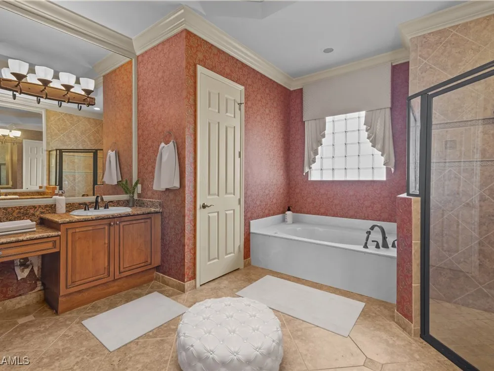 - Bedroom on Main Level, Bathtub, Tray Ceiling(s), Coffered Ceiling(s), Dual Sinks, Eat-in Kitchen, High Ceilings, Jetted Tub, Kitchen Island, Custom Mirrors, Main Level Primary, Pantry, Separate Shower, Cable TV, High Speed Internet, Home Office, Split Bedrooms