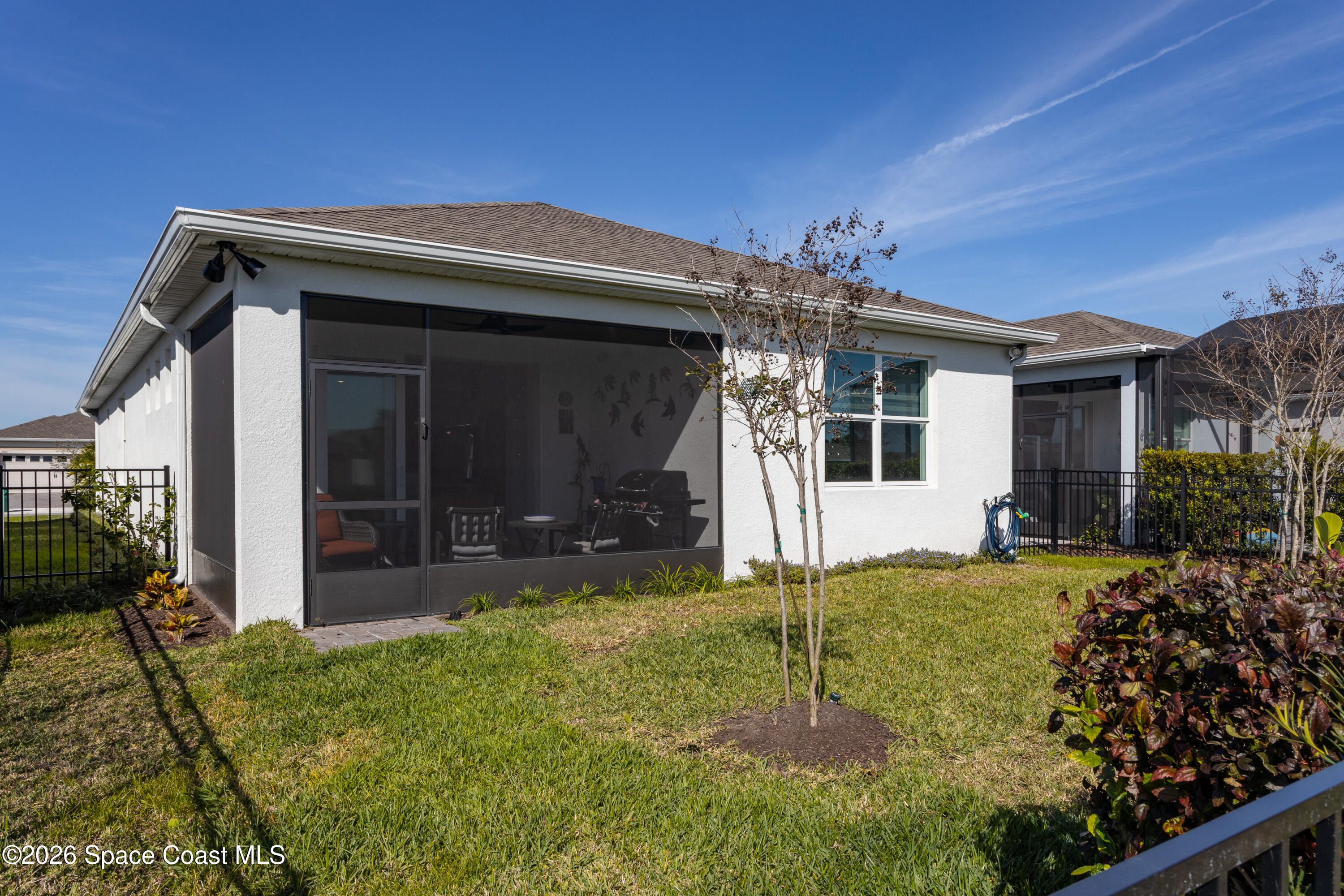 Move in ready! 2023 Hallmark. Exterior enhancements include redesigned front landscaping, additional palm trees, installed gutters, fenced backyard and a professionally screened back patio. Inside, the home features granite kitchen countertops fresh paint, a remodeled guest bathroom with a walk-in shower, and ceiling fans in every room. The garage offers epoxied floor with ample storage, while the laundry room boasts six cabinets and a countertop workspace. HOA fees are $355 monthly, covering landscaping and future amenities including a walking trail, 2 dog parks, tennis / pickle ball courts, Tavern & Grill, Gym, Pools, Outdoor concert venue, Duran Golf Course Membership. The neighborhood is wonderful, with friendly and respectful neighbors who foster a strong sense of community. Monthly block parties at the lifestyle house create a welcoming environment, making it a peaceful and desirable location. We're selling only to upgrade to a larger home for accommodating frequent guests; we love this community